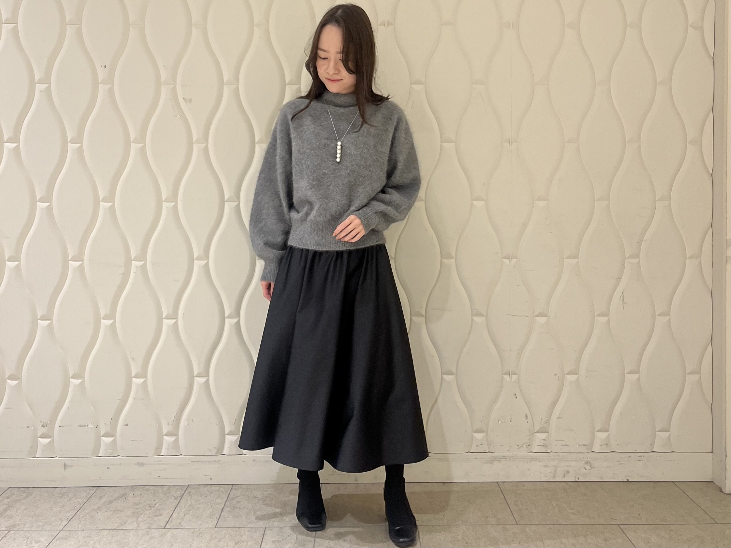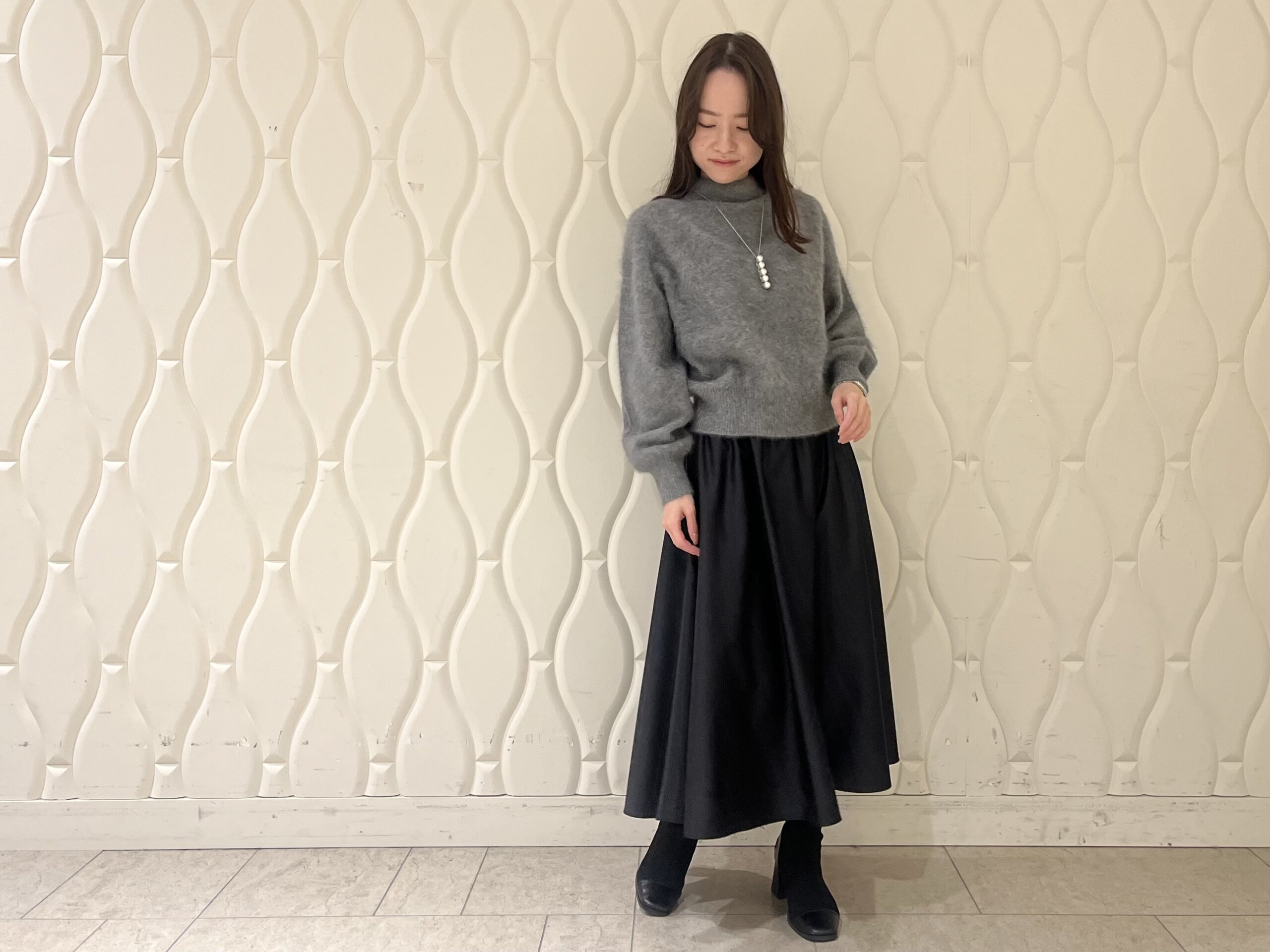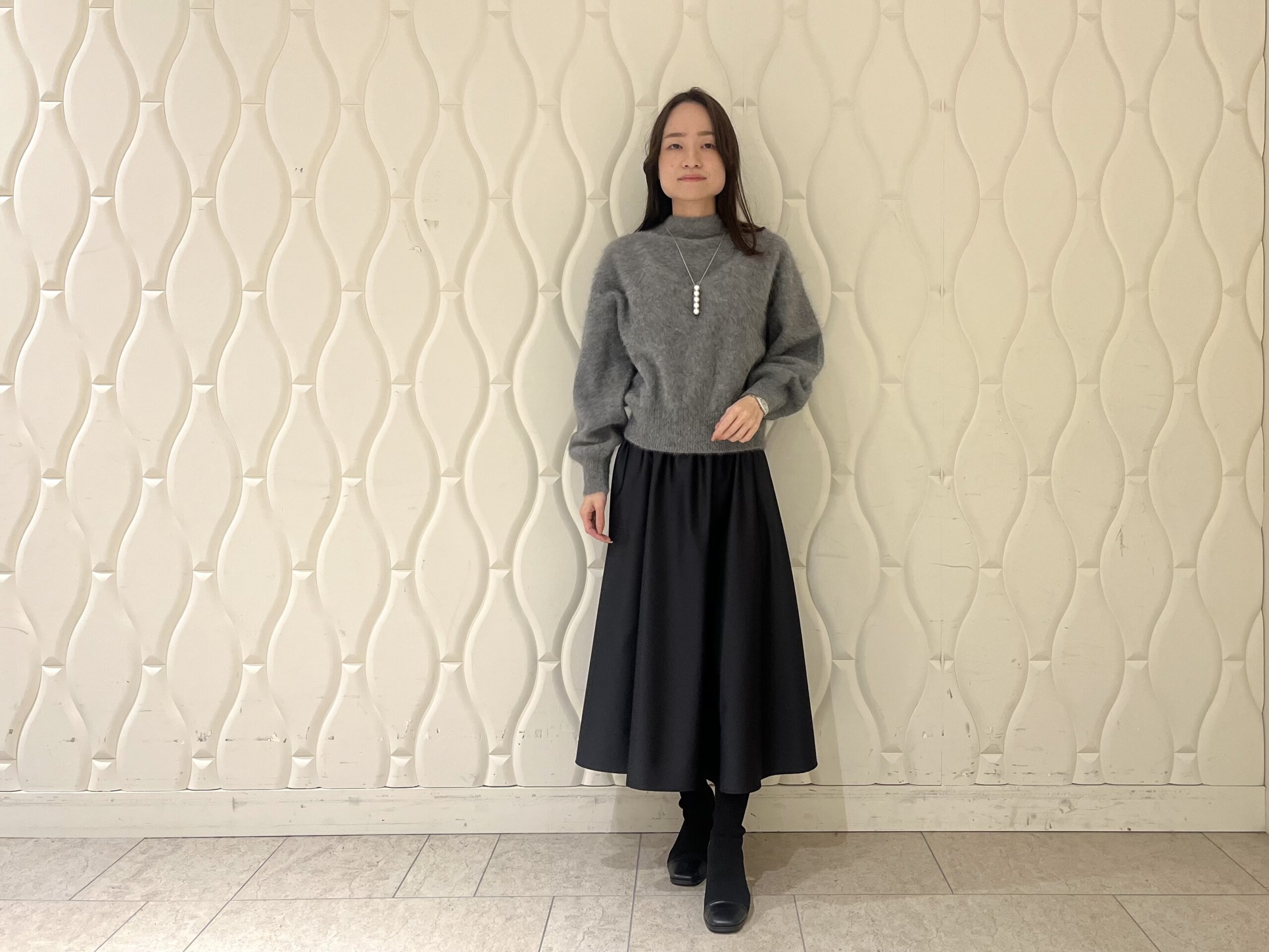 今回はフレアスカートを合わせて、ニットのコンパクトさを引き立てたスタイリングに。