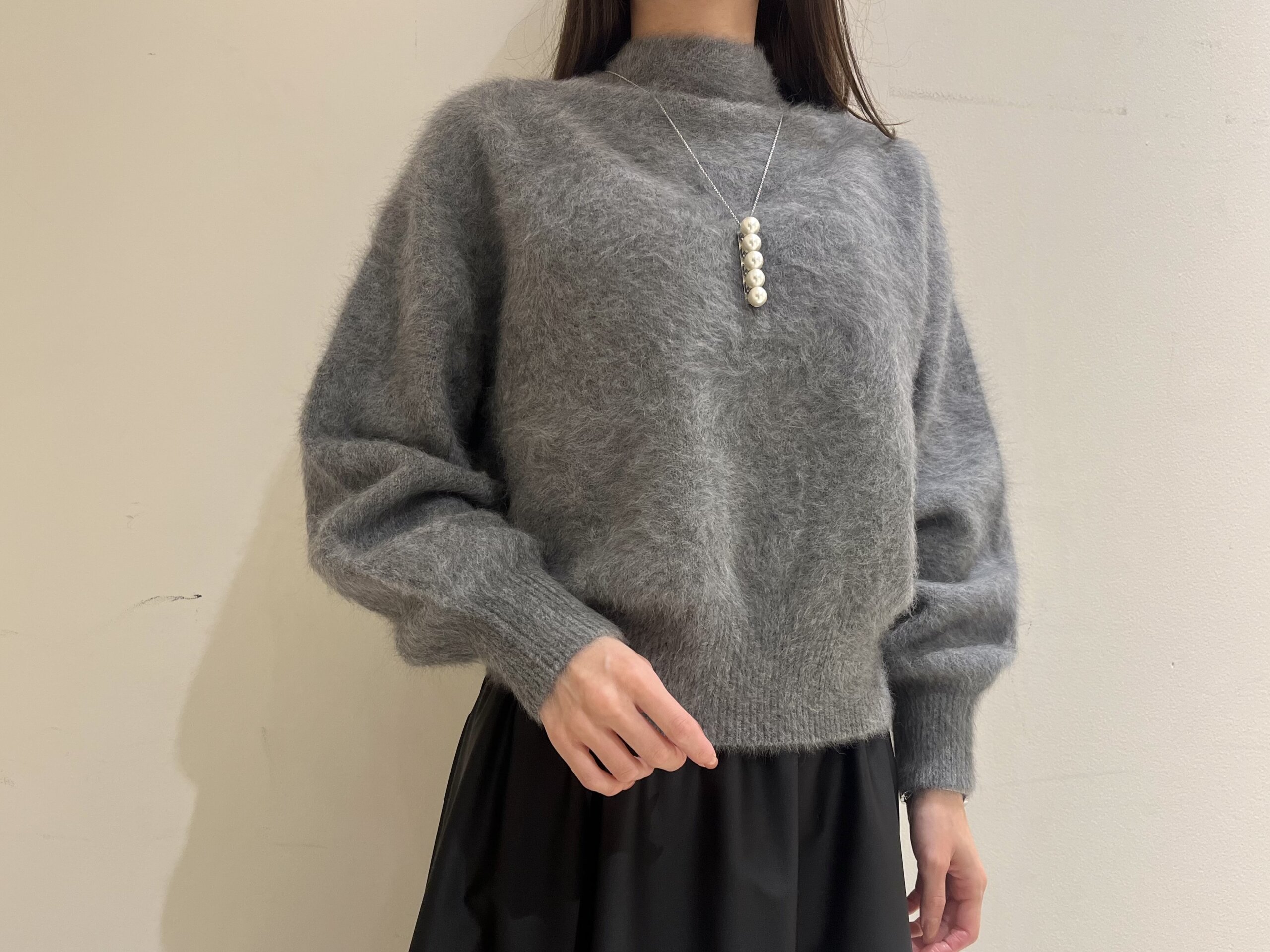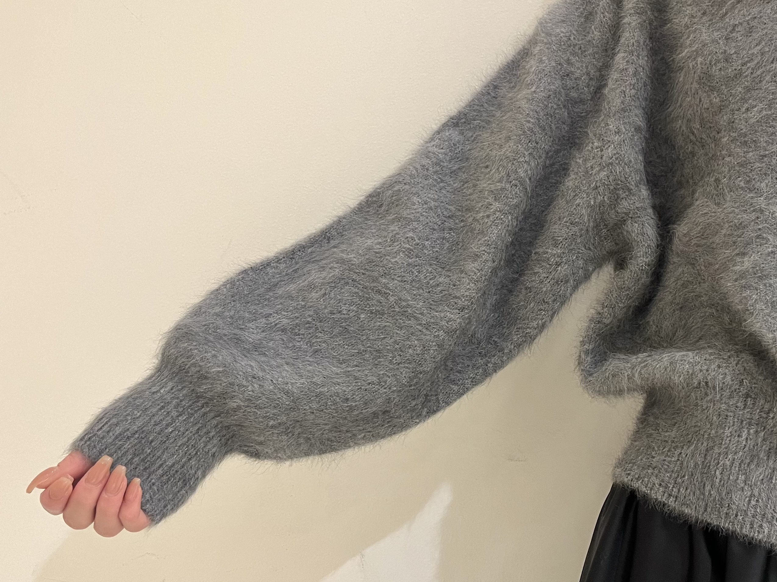ふんわりとした起毛感が魅力のグレーニットは、柔らかな表情と軽やかな着心地を兼ね備えた一枚。
