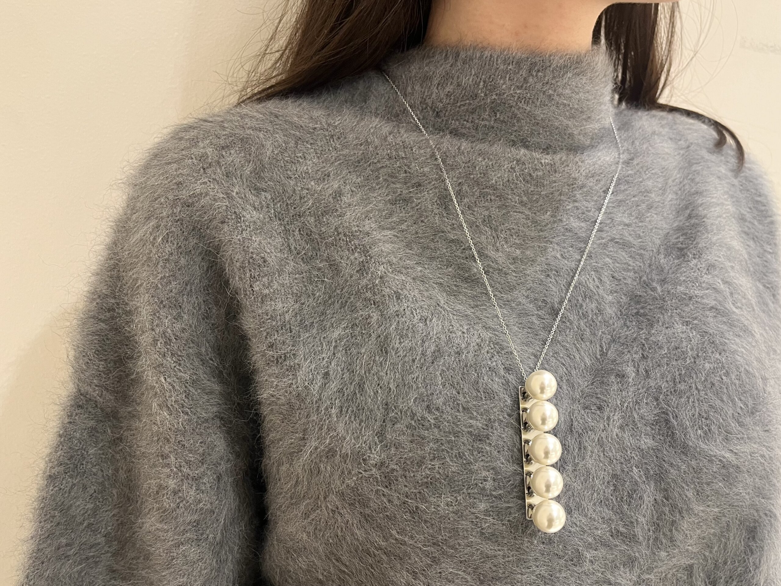 グレー×ブラックの落ち着いた配色に、パールネックレスをプラスすることで、視線を上へ引き上げつつ上品な華やぎをプラス。