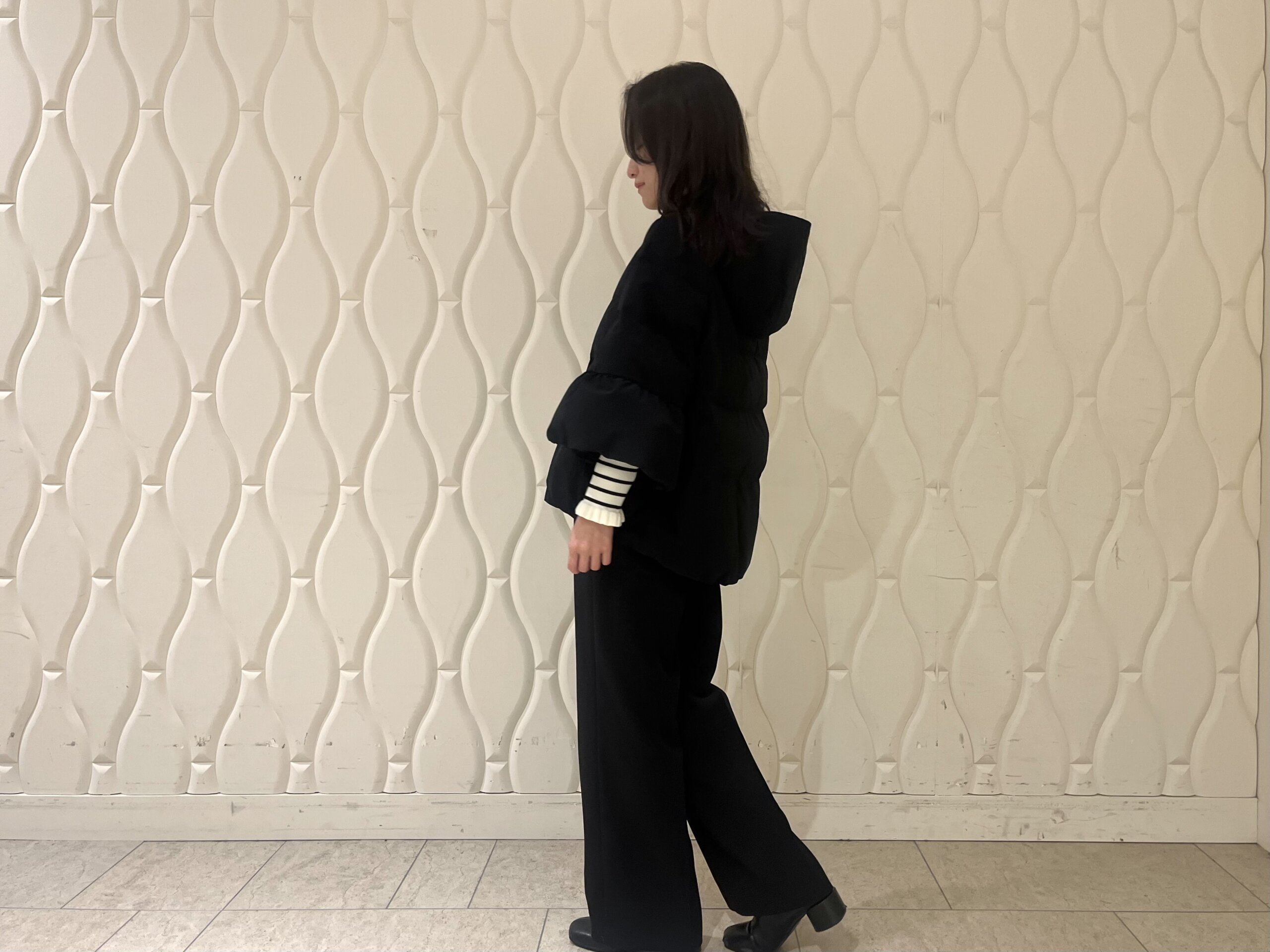 今回はワイドパンツを合わせ、縦ラインを意識したモード寄りのスタイリングに。