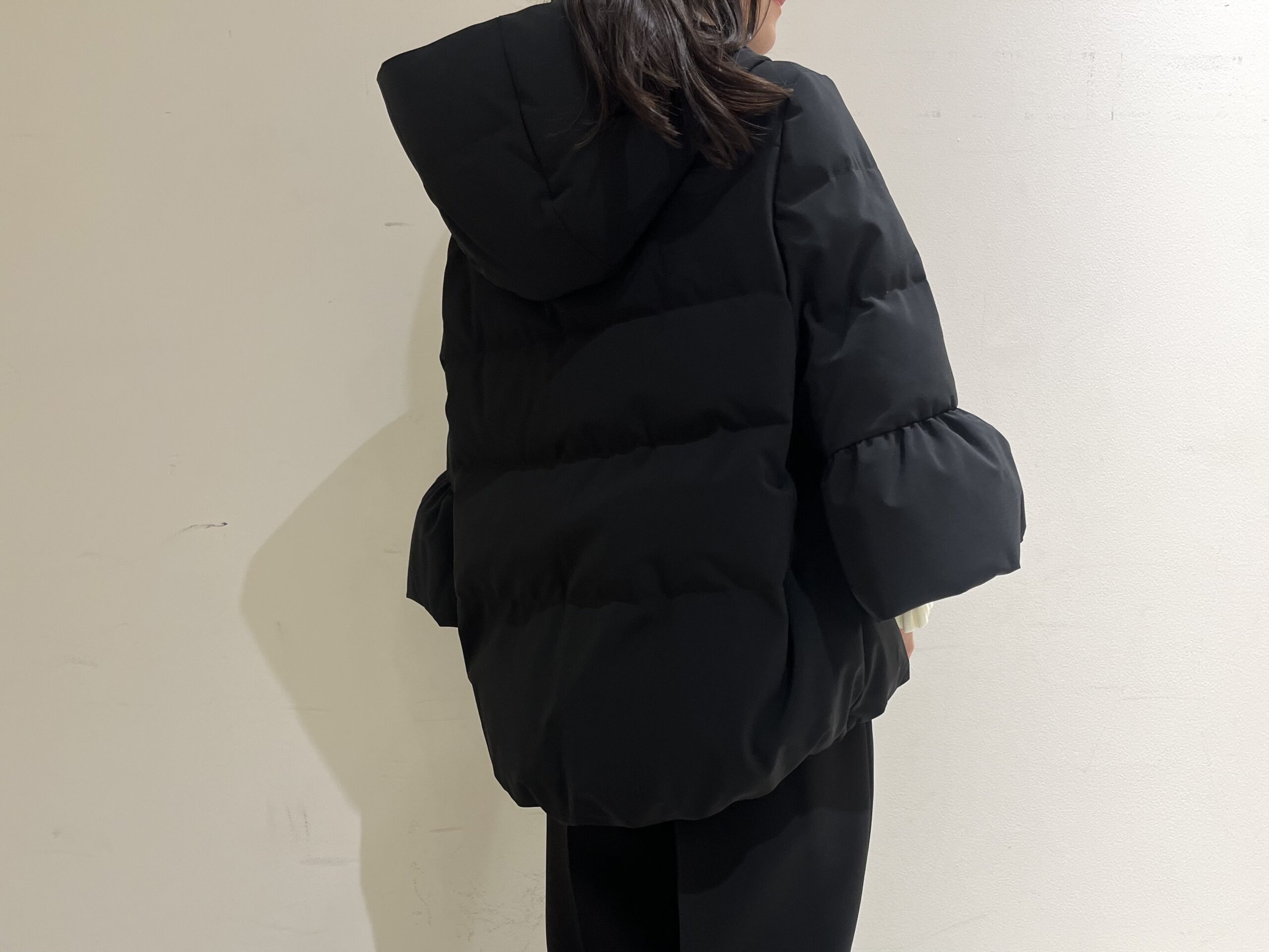 切替を入れたフレアシルエットのスリーブデザインが、華やかな表情を添えるショート丈のダウンコート。