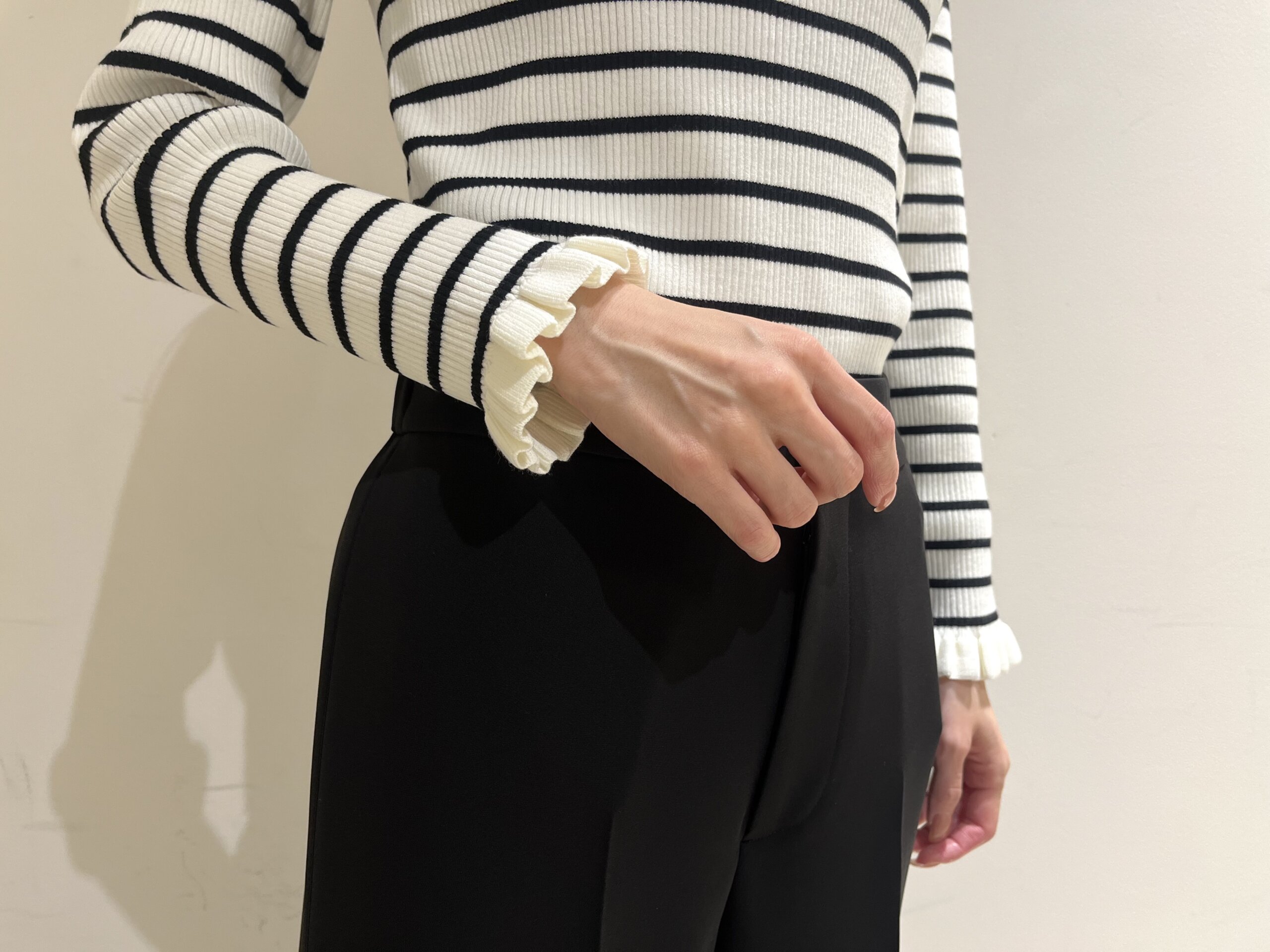 首元や袖口から覗くボーダーが視線を上へ引き上げ、低身長さんのスタイルアップにもひと役。