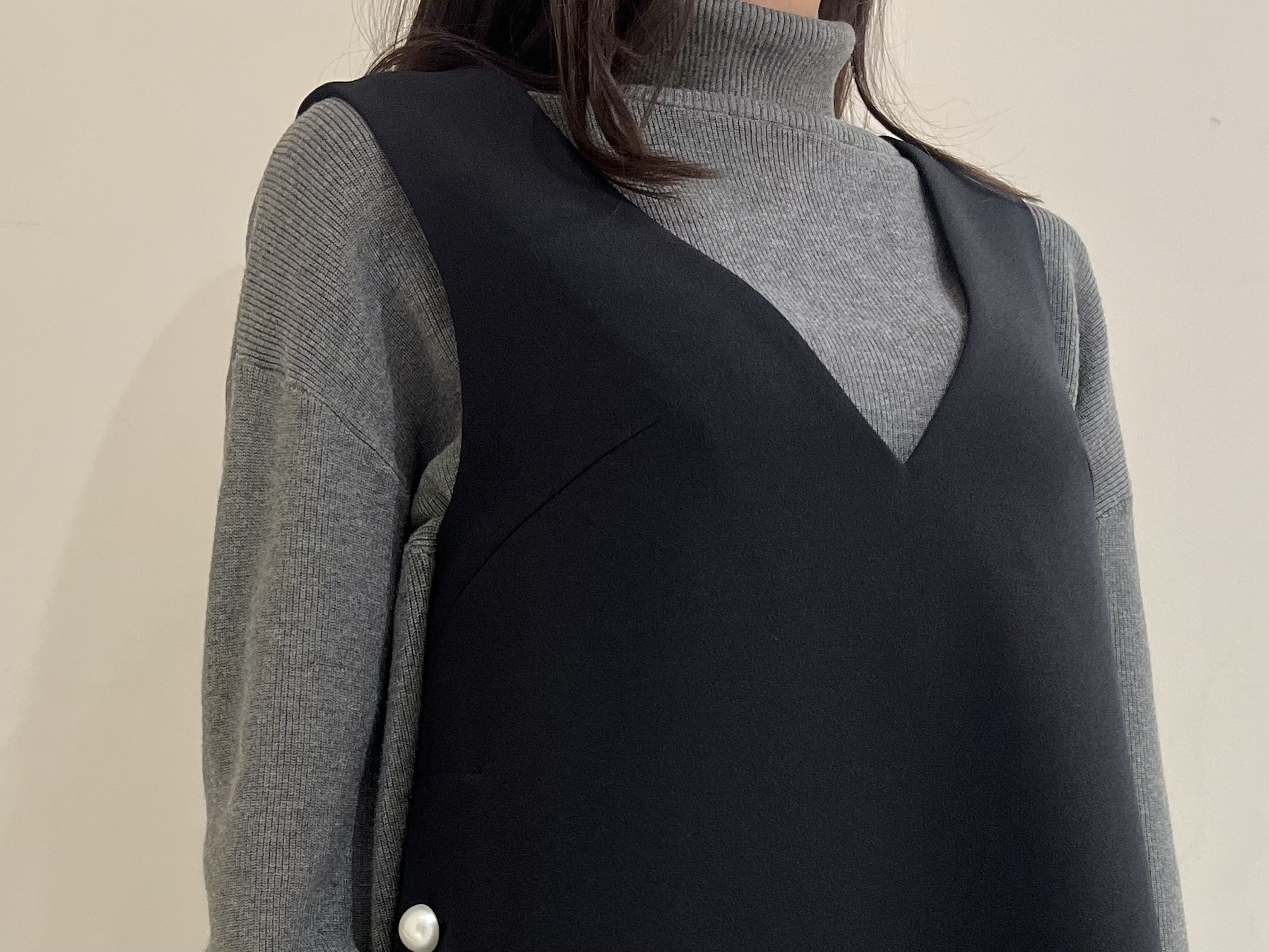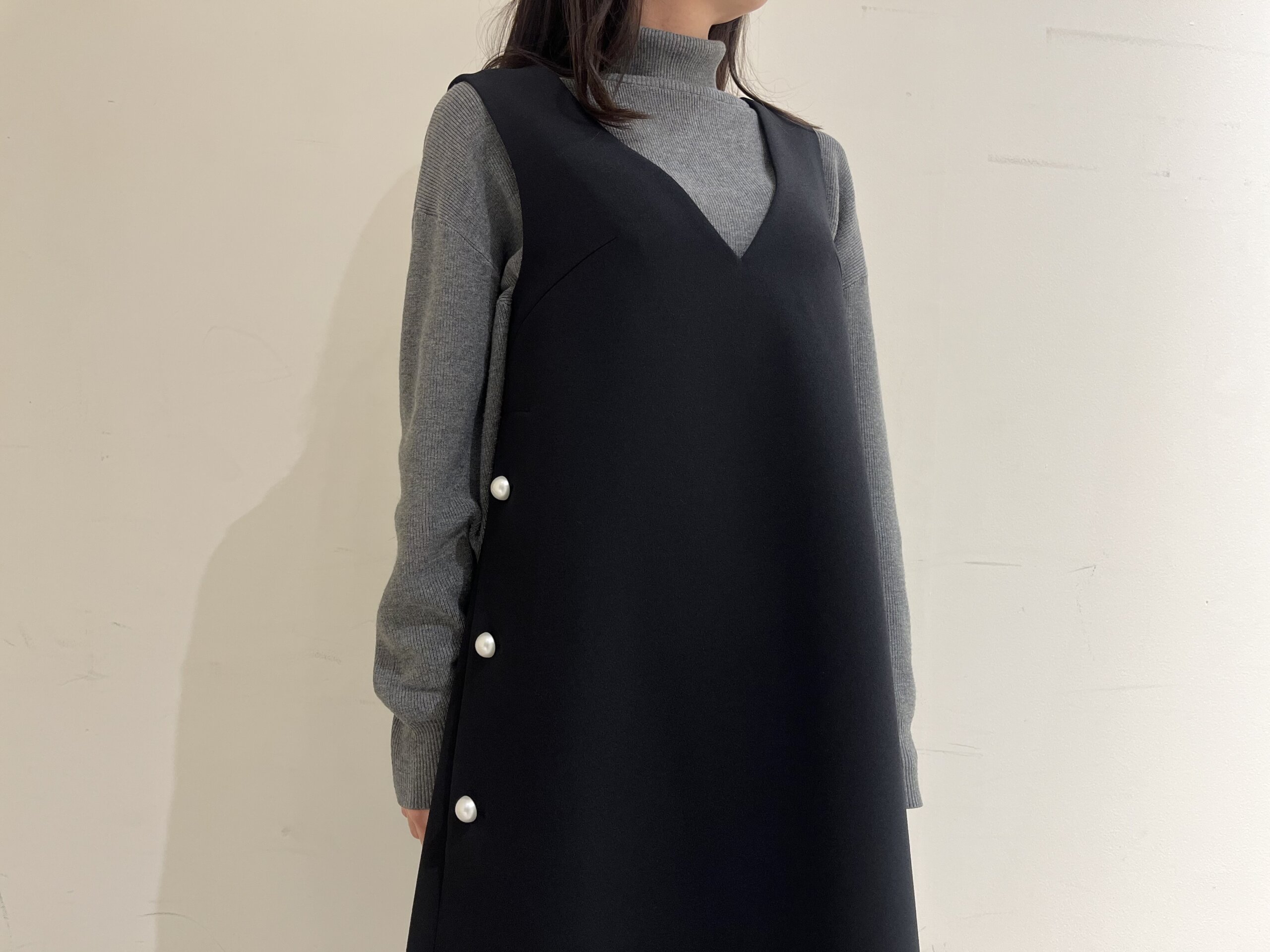 深く開いたVネックラインが縦のラインを強調し、低身長さんでもすっきりとした印象に導いてくれる一着です。