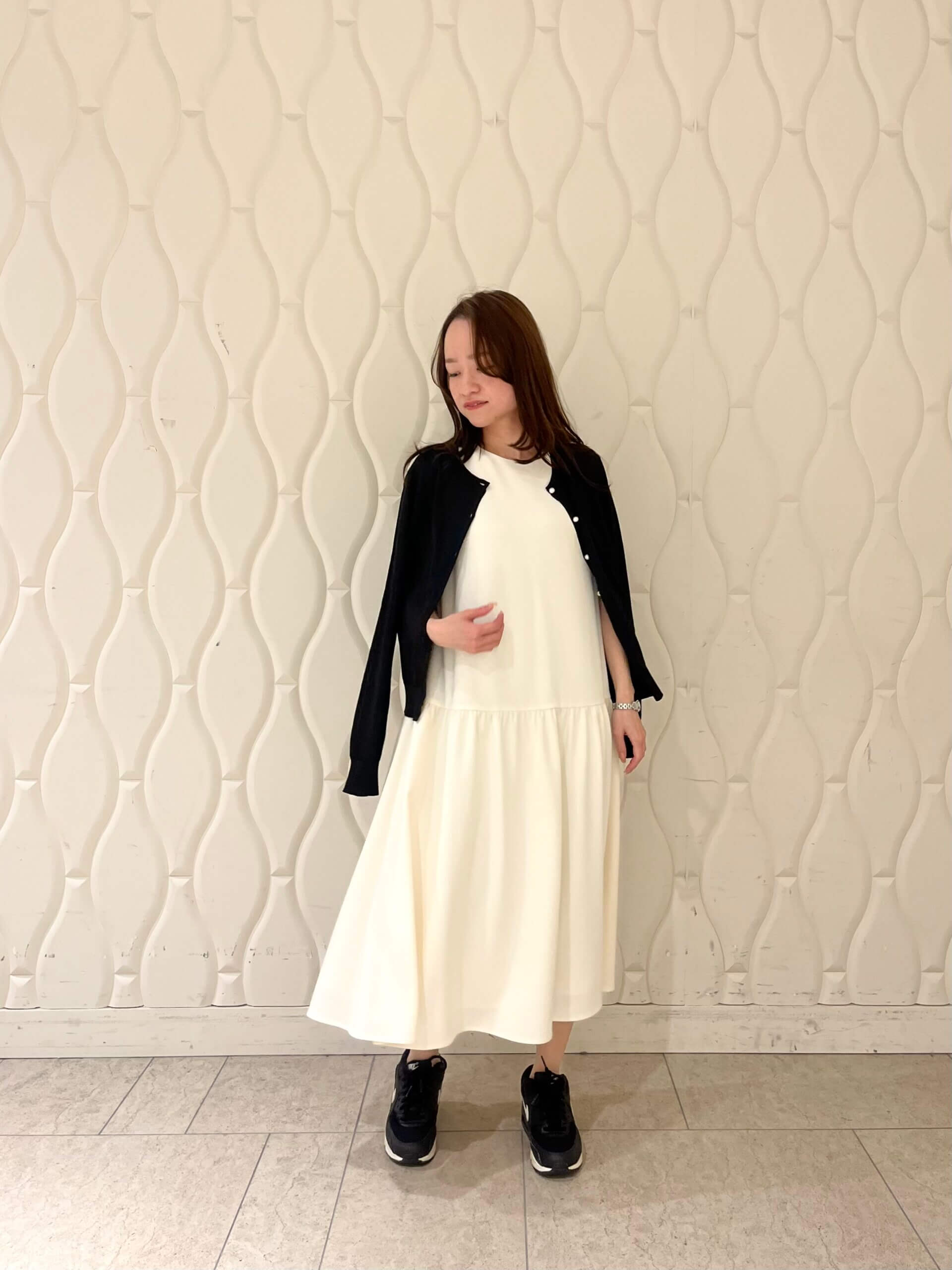 一枚でさらりと着るだけでもきれいに決まるワンピースですが、羽織りとしてブラックのカーディガンをプラスするとコーディネートがぐっと引き締まり、メリハリのある印象に。