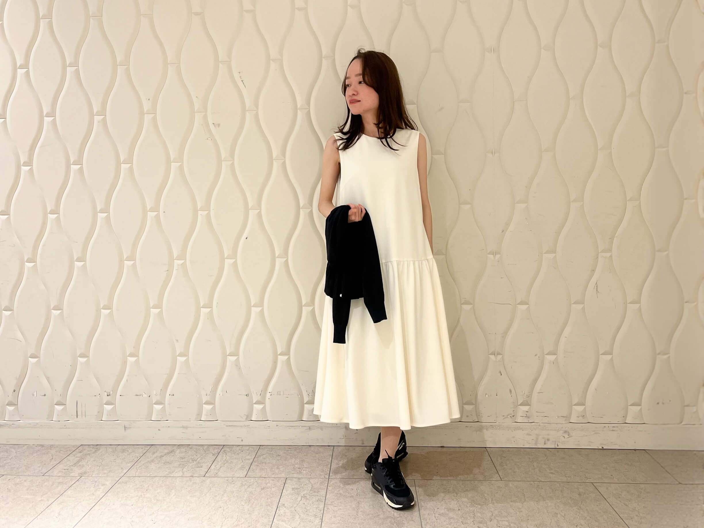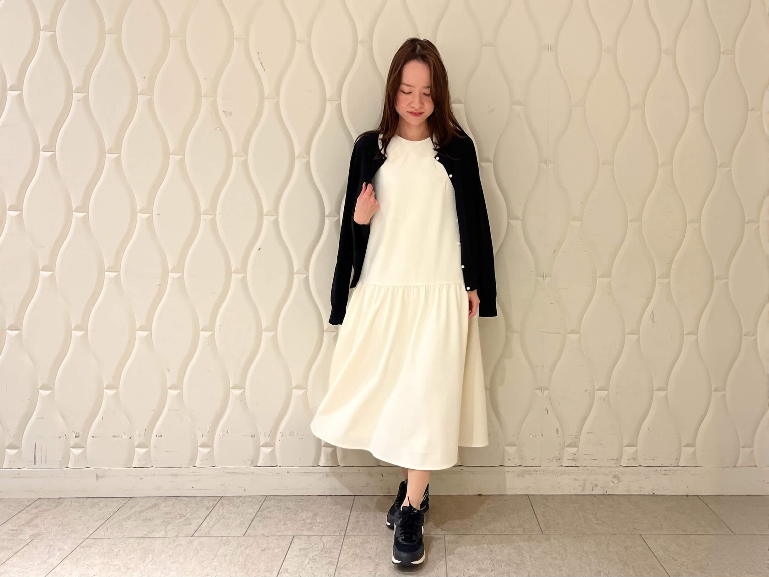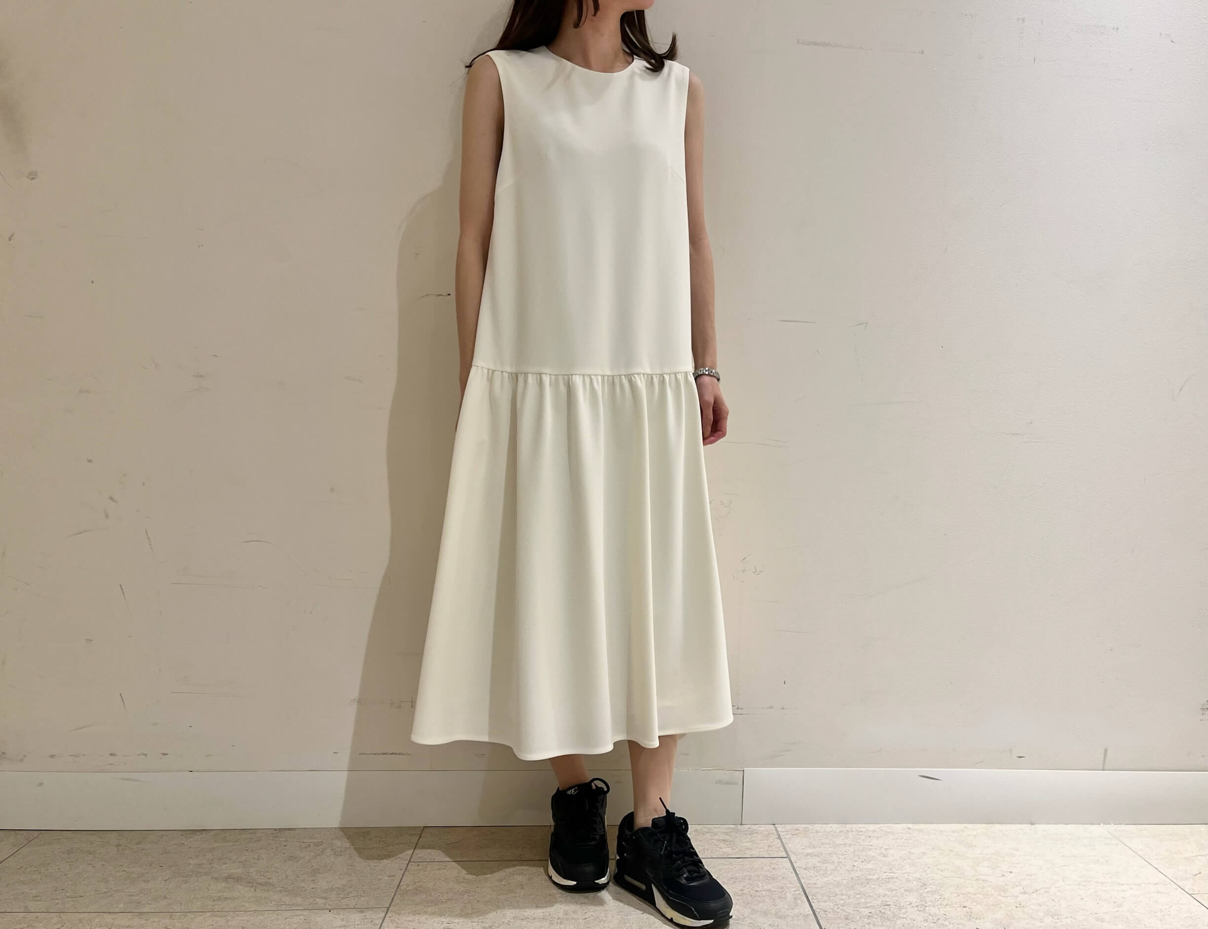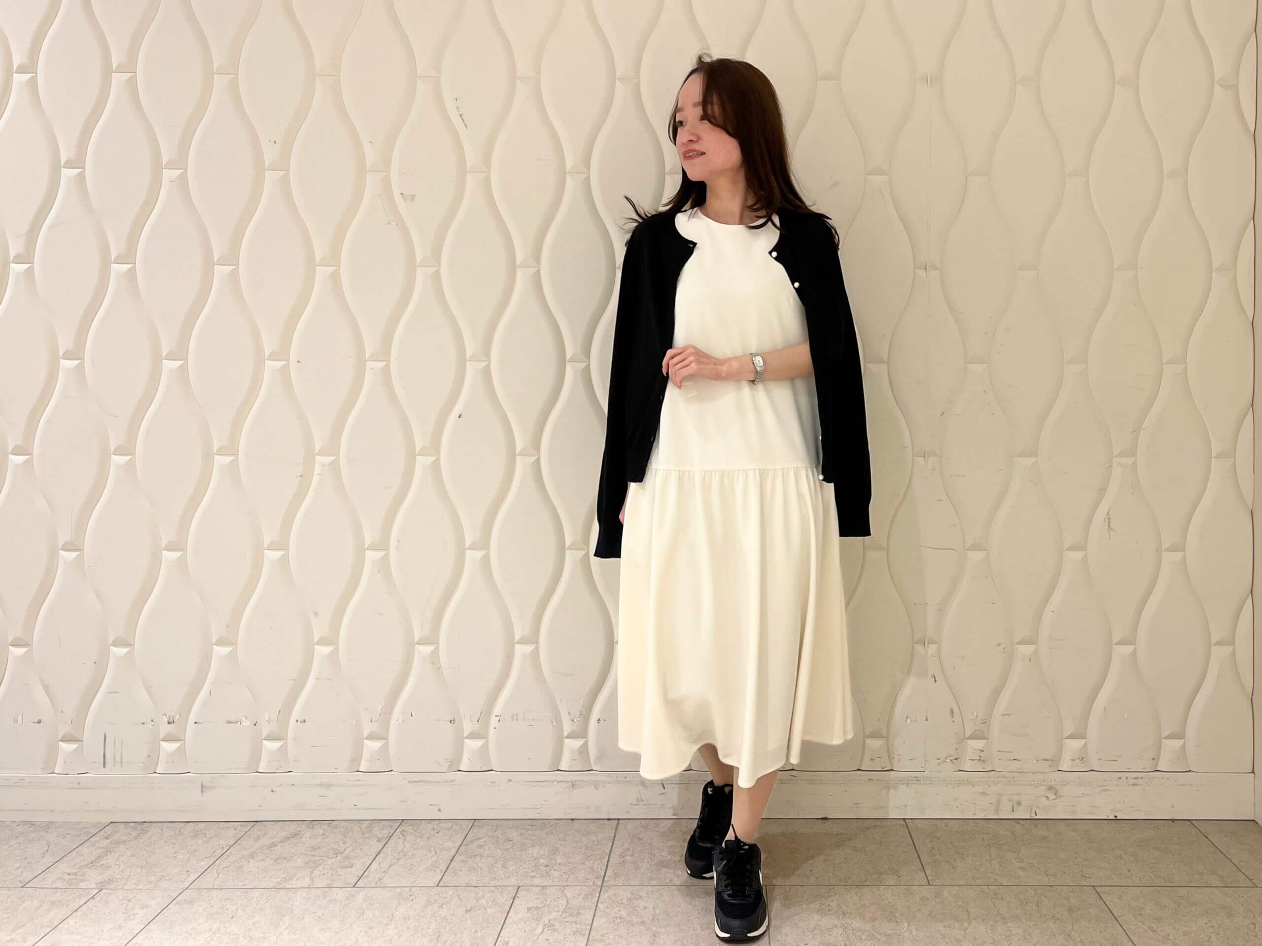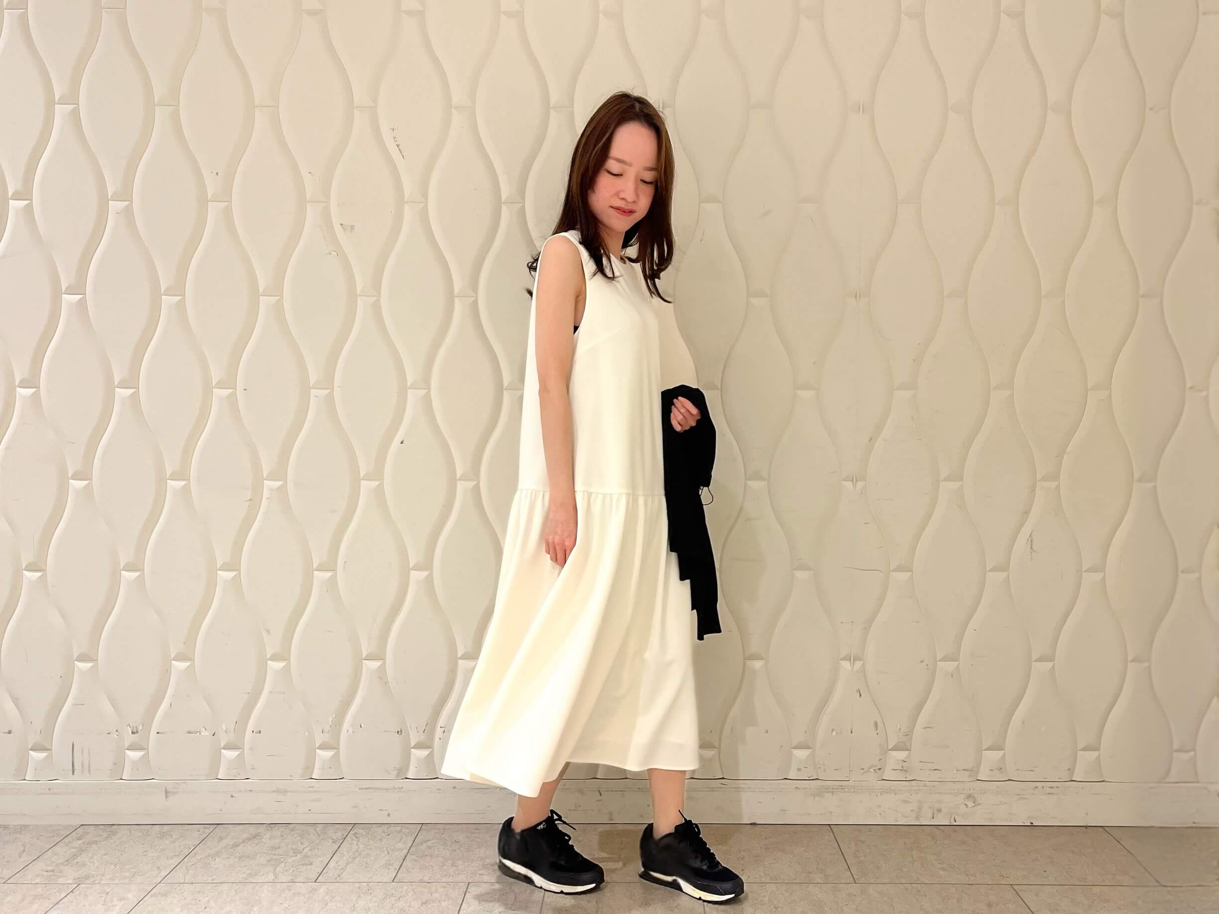 きれいめな印象のワンピースですが、今回はあえてスニーカーを合わせたスタイリングに。
