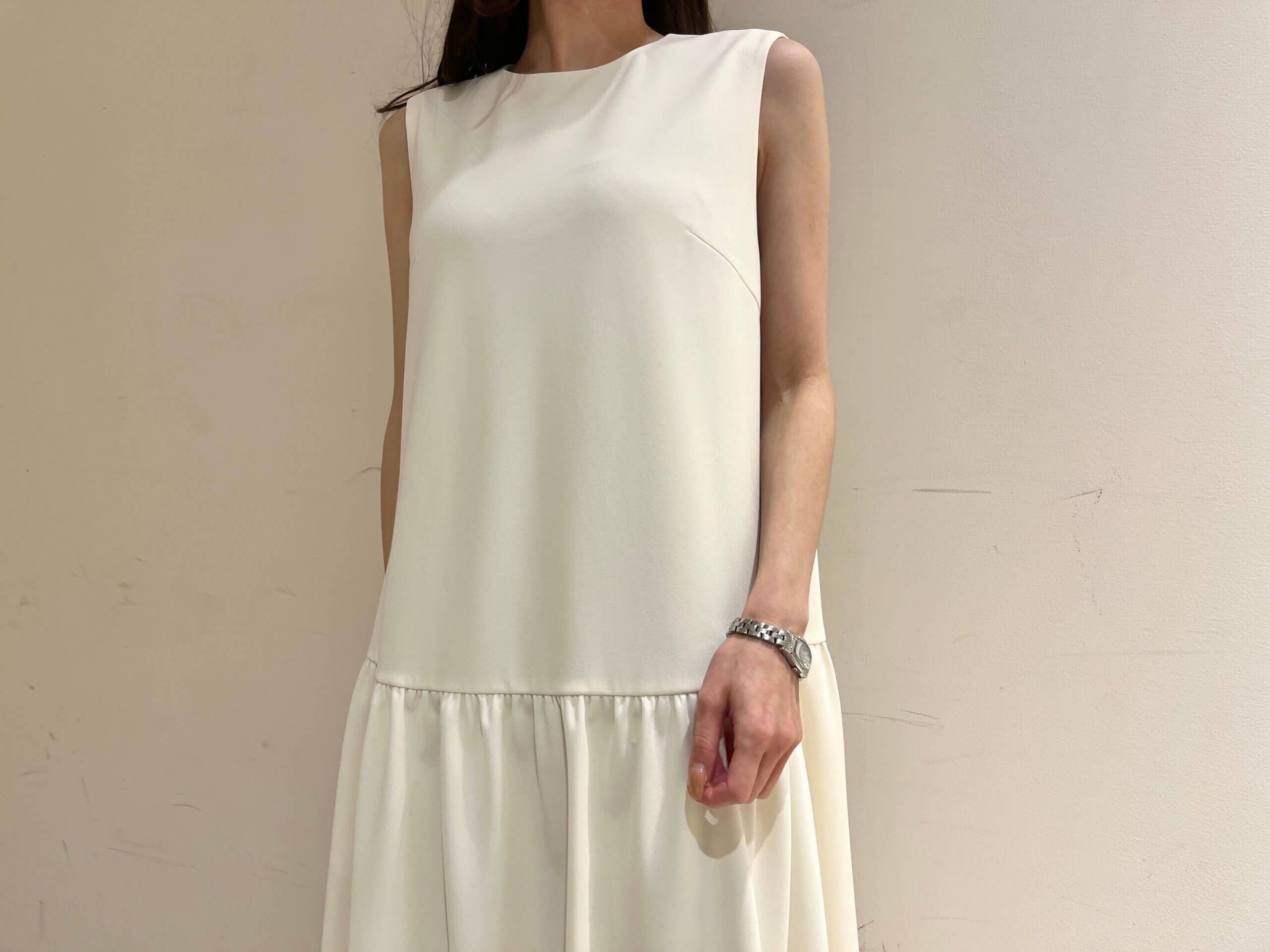 やわらかなオフホワイトカラーが上品な印象を与えてくれるワンピース。