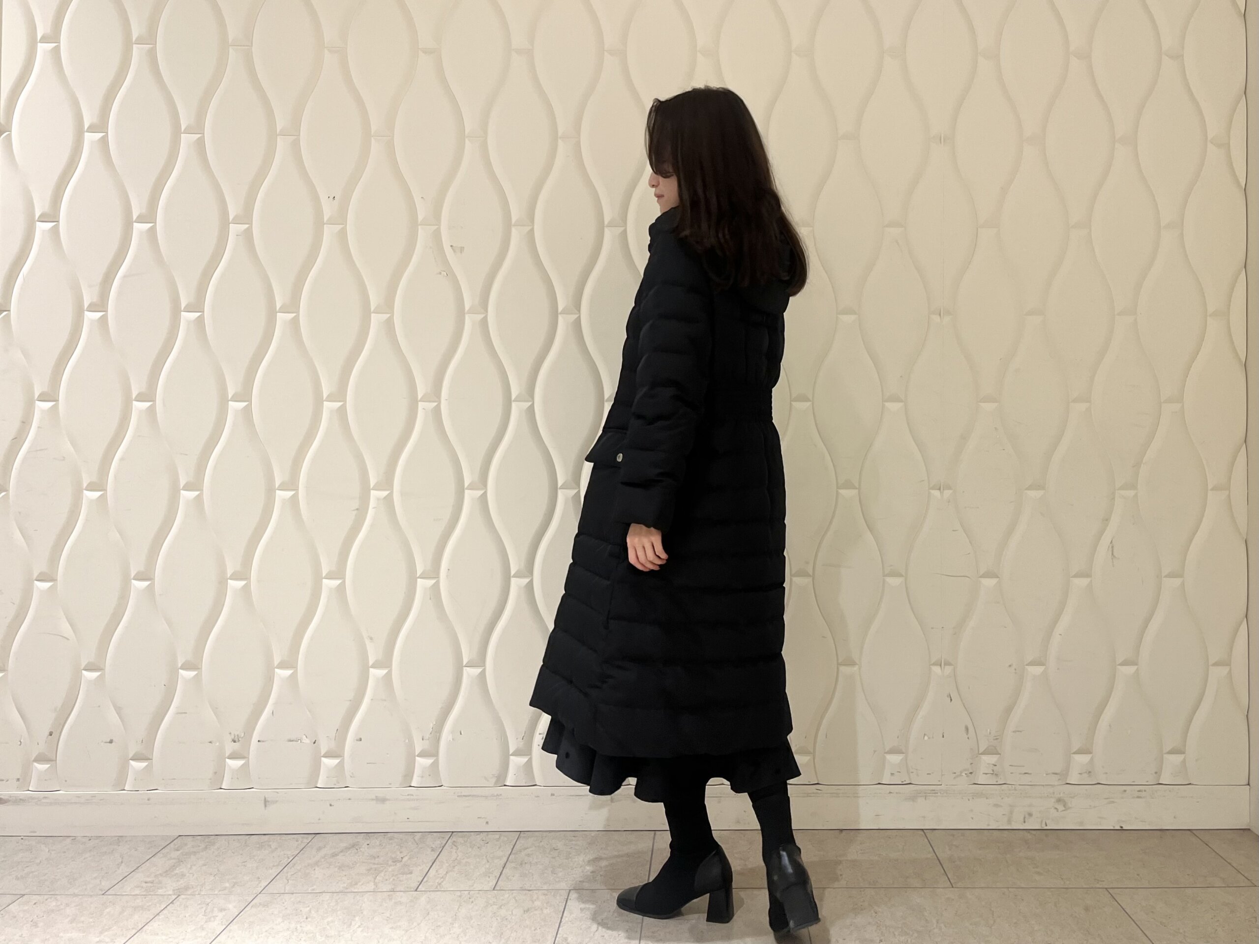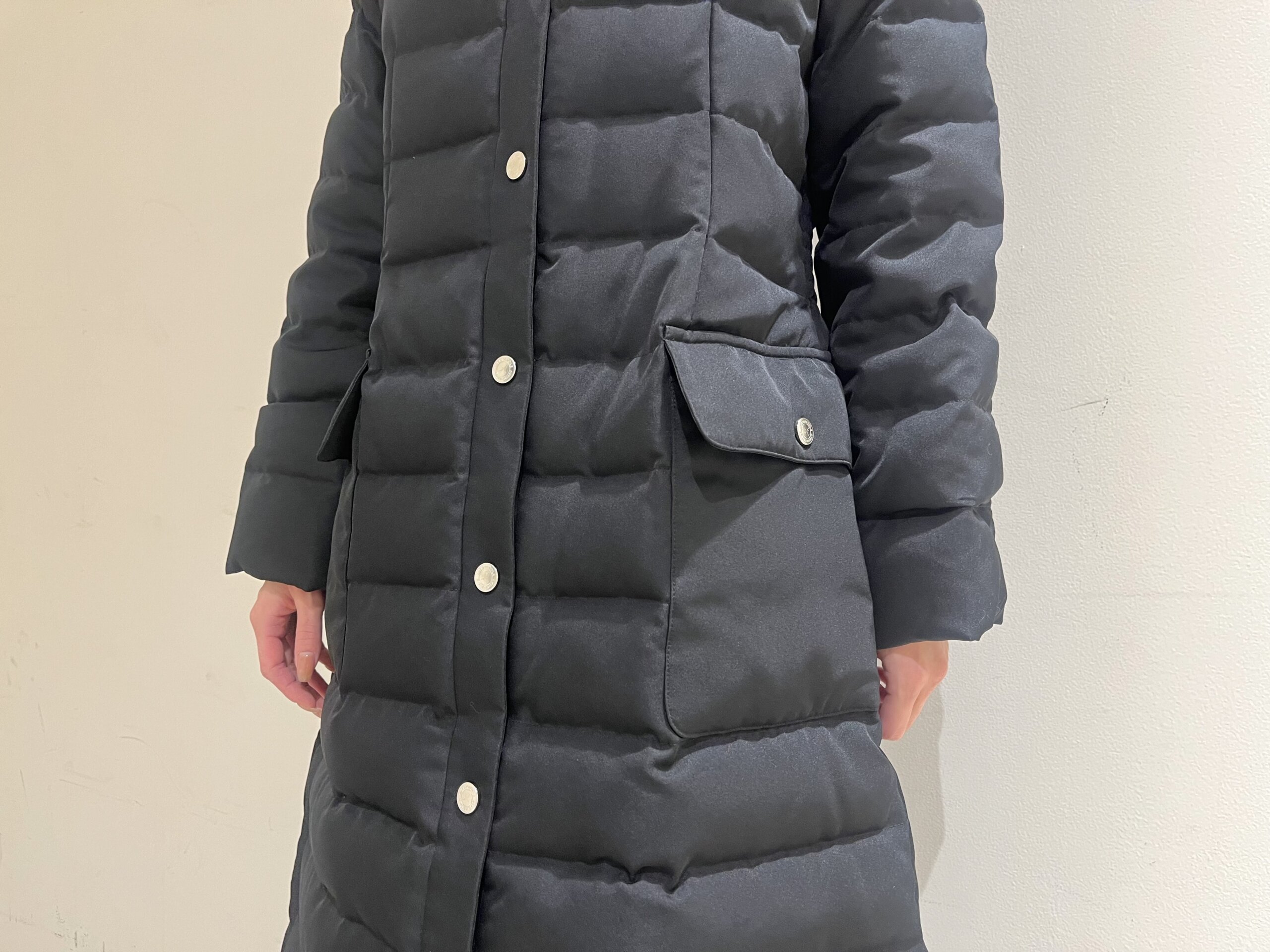 ダウン特有のボリューム感を抑えたシルエットで、ロング丈でも「着られている感」が出にくいのが大きな魅力です。