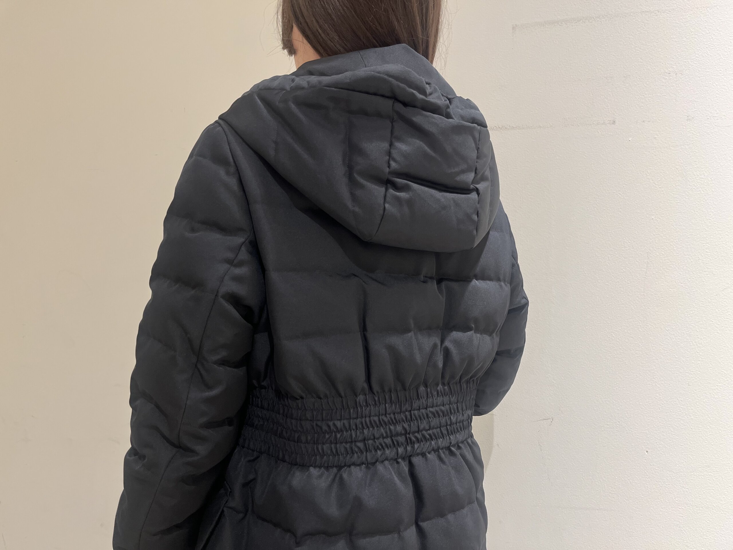 ウエスト位置にはさりげなくシェイプを効かせたデザイン。後ろ姿もメリハリがあり、ロングダウンでも重心が下がらずスタイルアップが叶います。