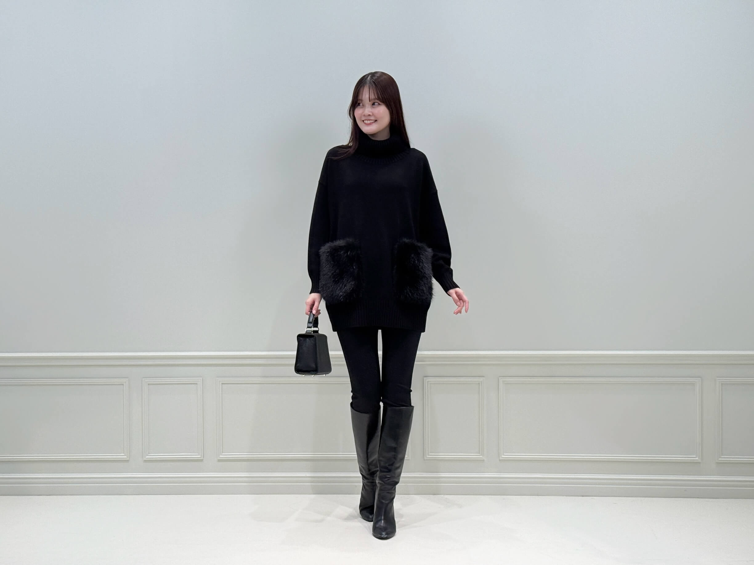 レギンスパンツとロングブーツを合わせ、縦ラインを強調したモノトーンスタイルに。