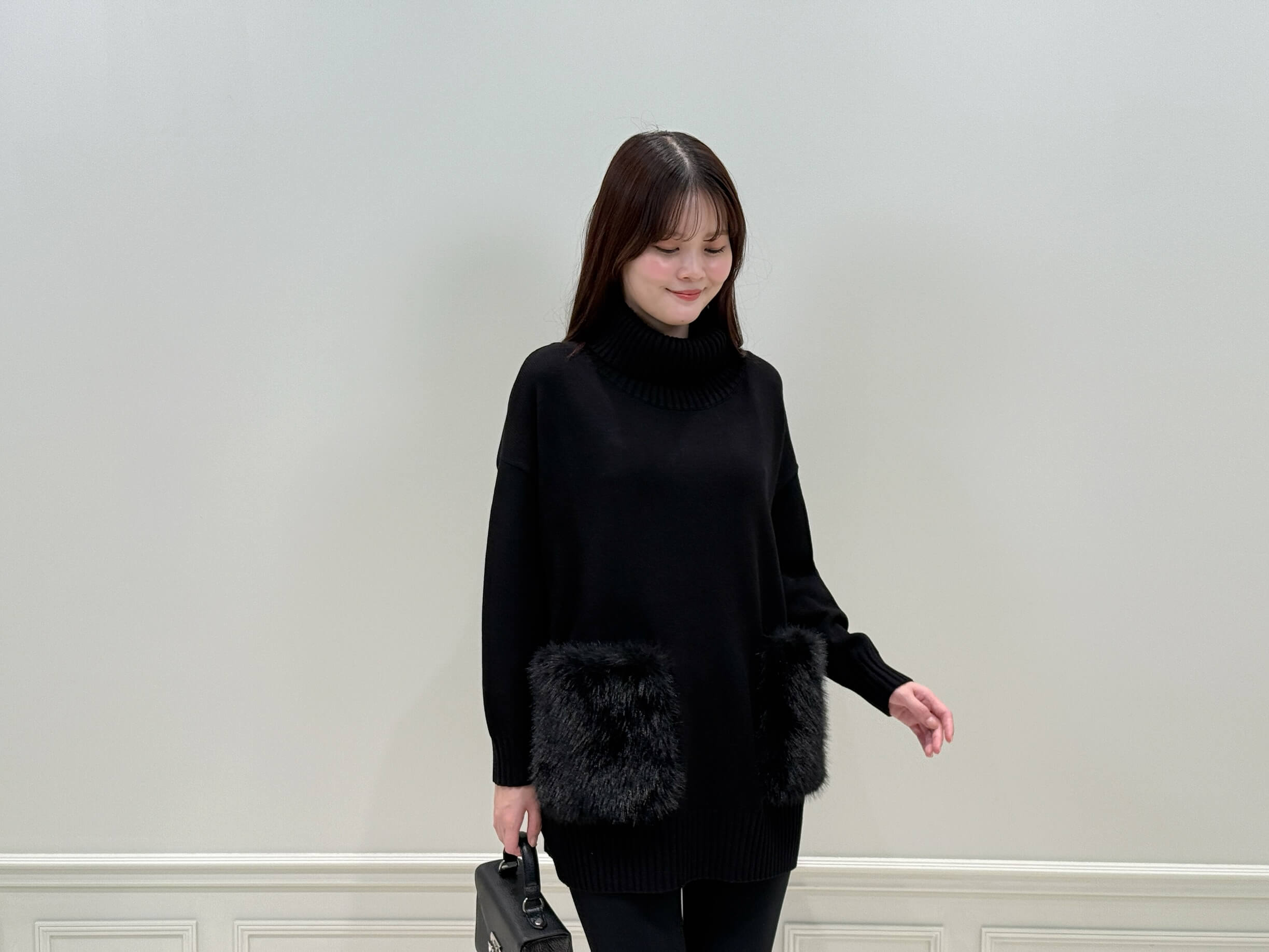 この〈ファーポケットロングニットプルオーバー〉なら心配無用。