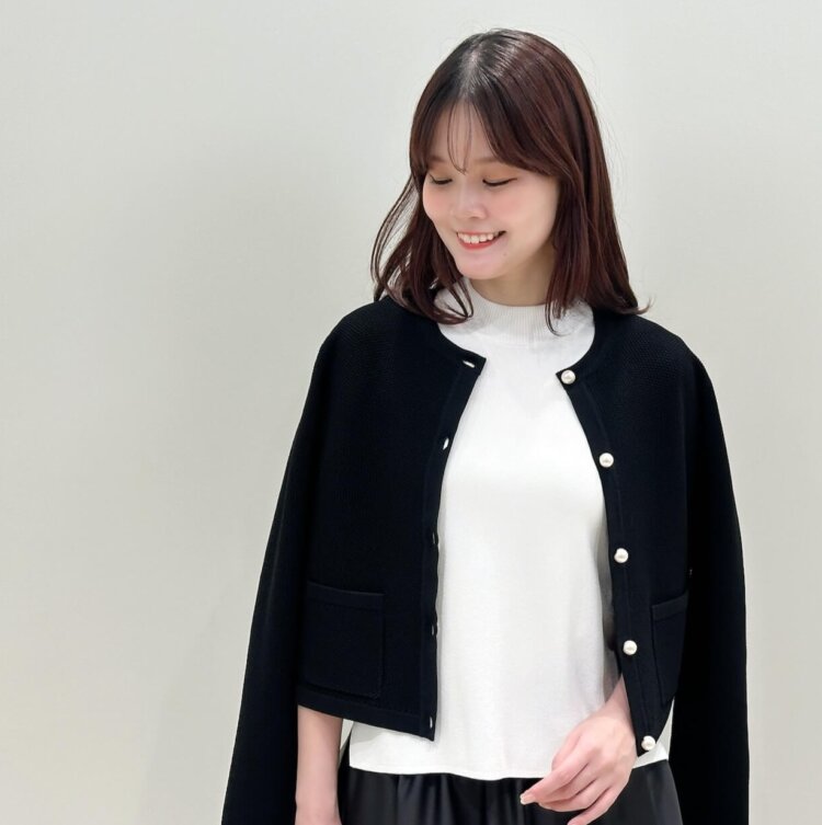 小柄さんにとっても取り入れやすいポイントは、顔まわりをすっきり見せてくれるキーネックデザイン。