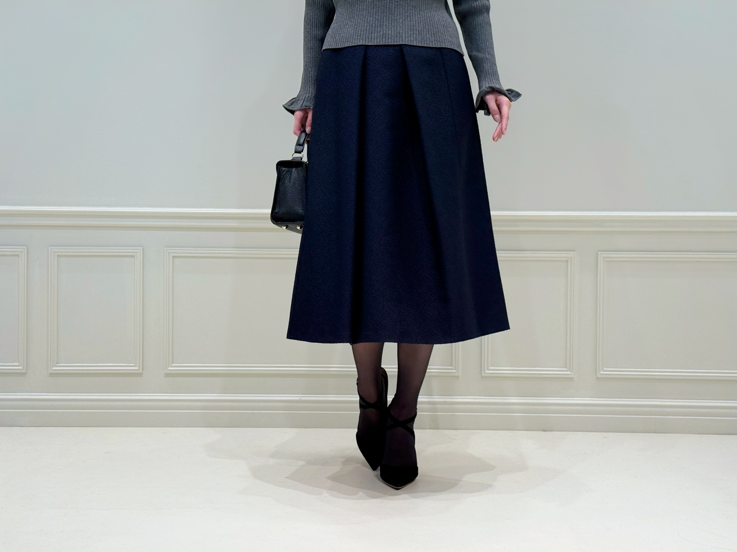 フロントに入ったアシンメトリーなタックが、立体的でモダンな印象を描くフレアスカート