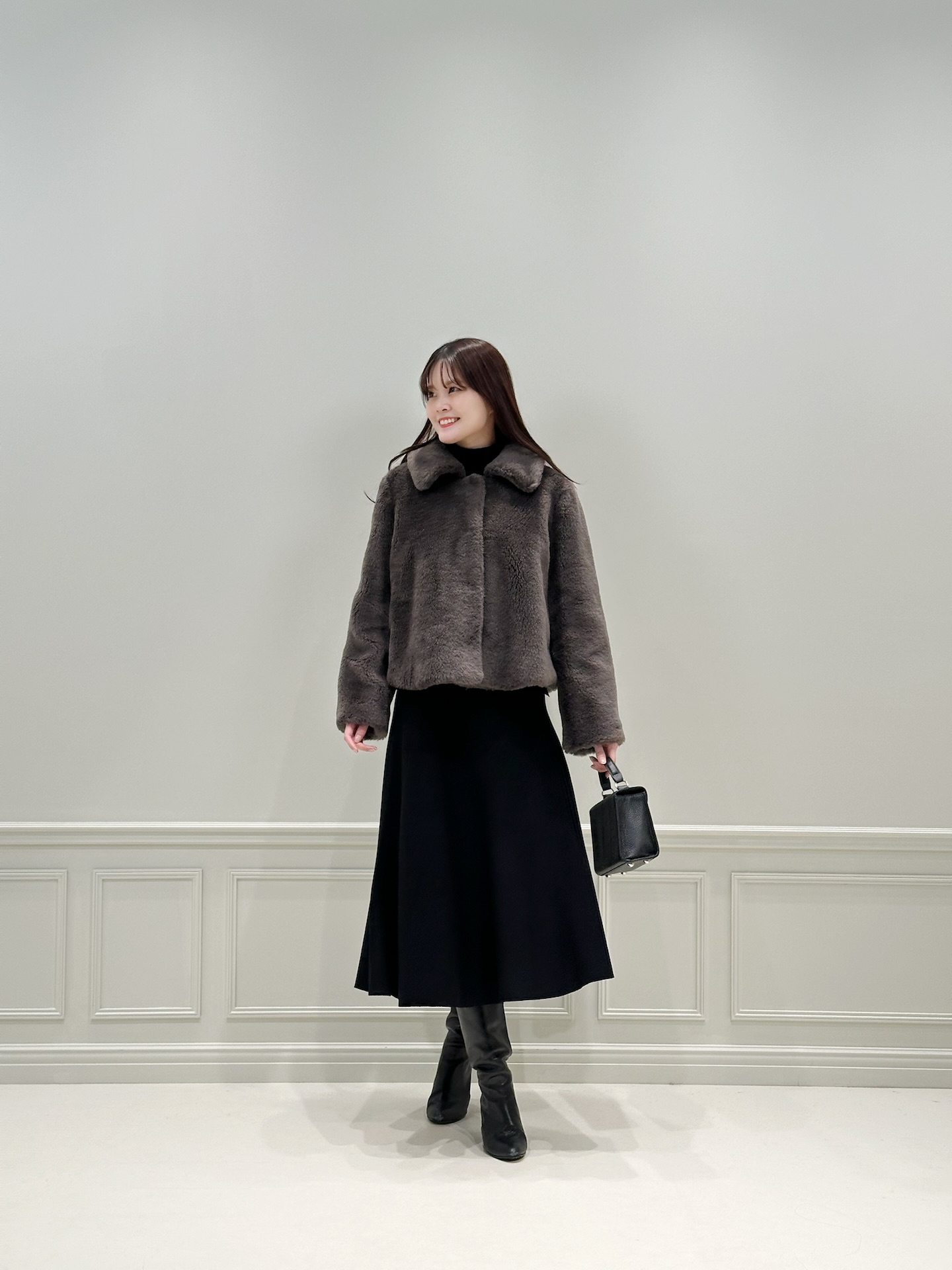 主役は、黒が多いワードローブでも合わせやすく、顔色が暗くならない絶妙なチャコールブラウンのウールボアフレアショートコート!羽織るだけで可愛さが出るのに、ショート丈で全体のバランスはすっきりなので、小柄さんにもトライしやすい黄金バランスの丈感です。