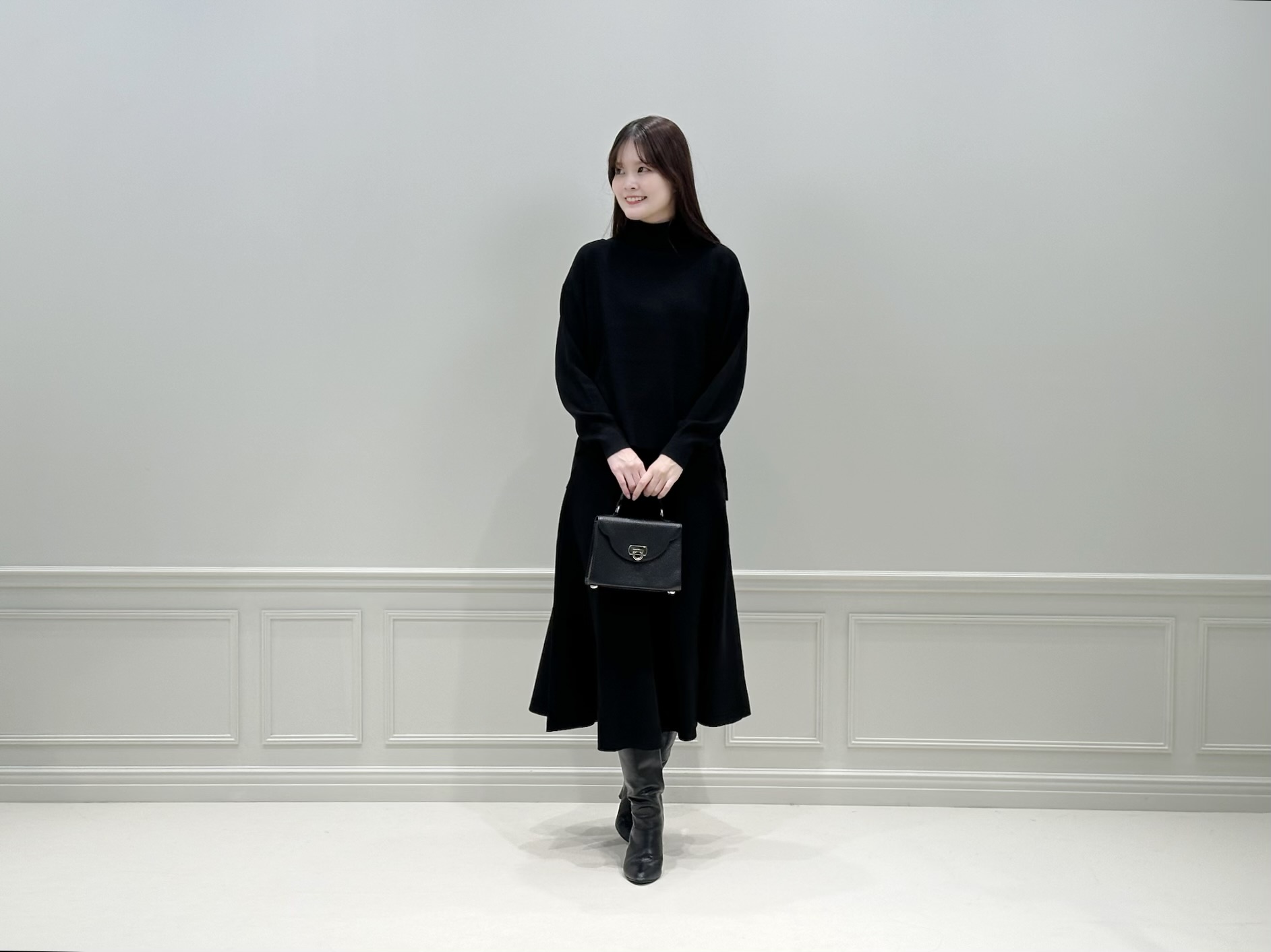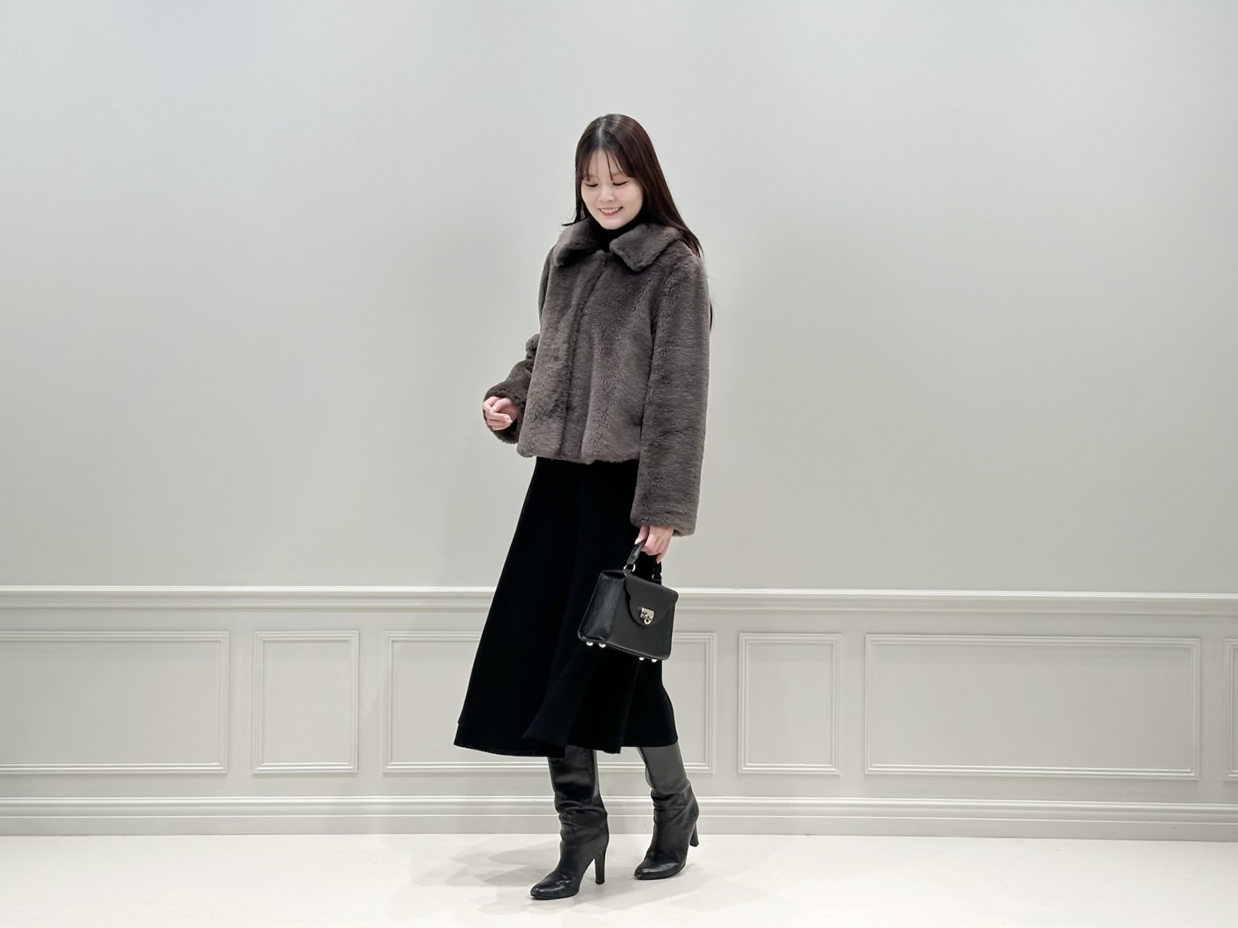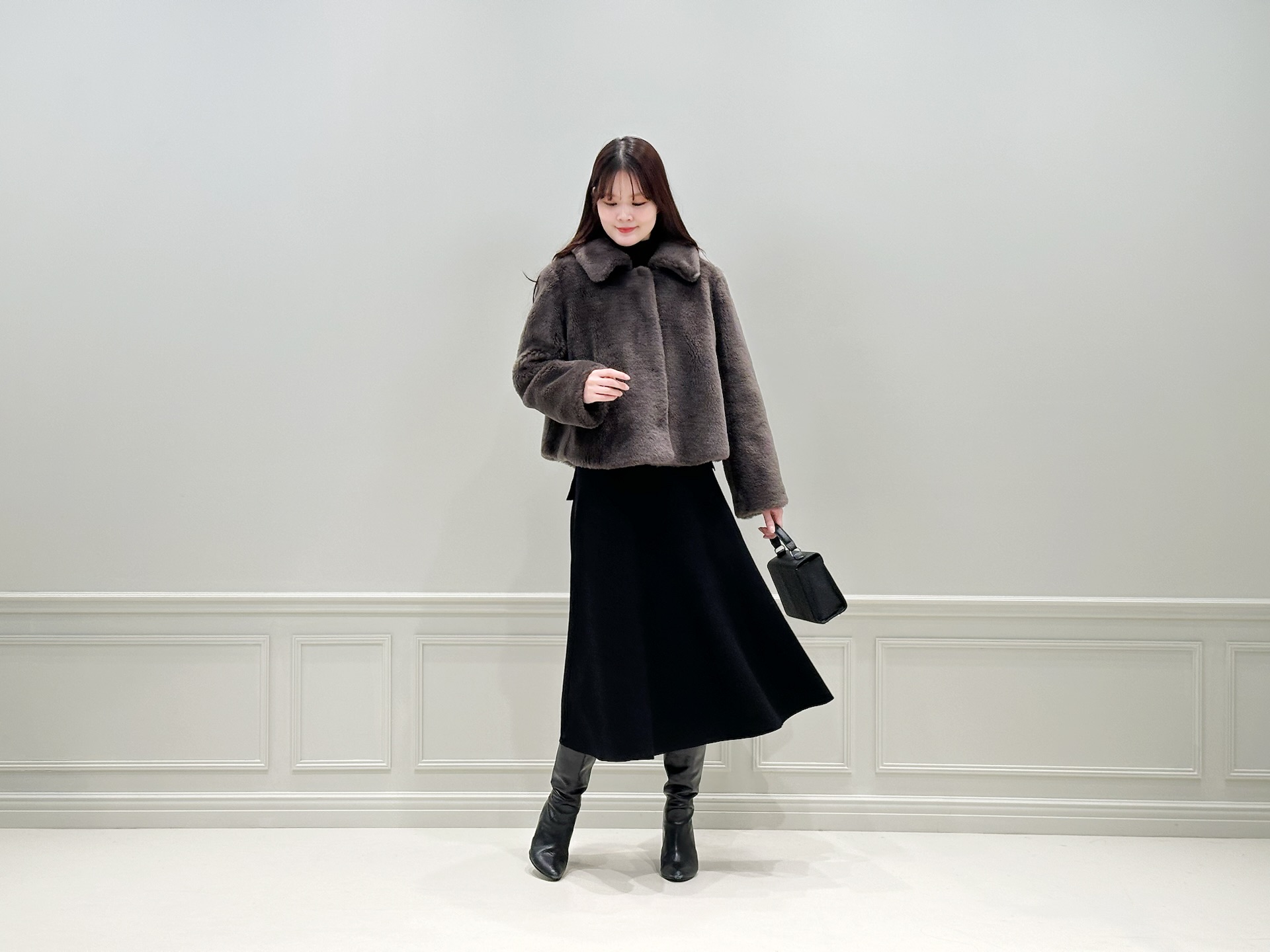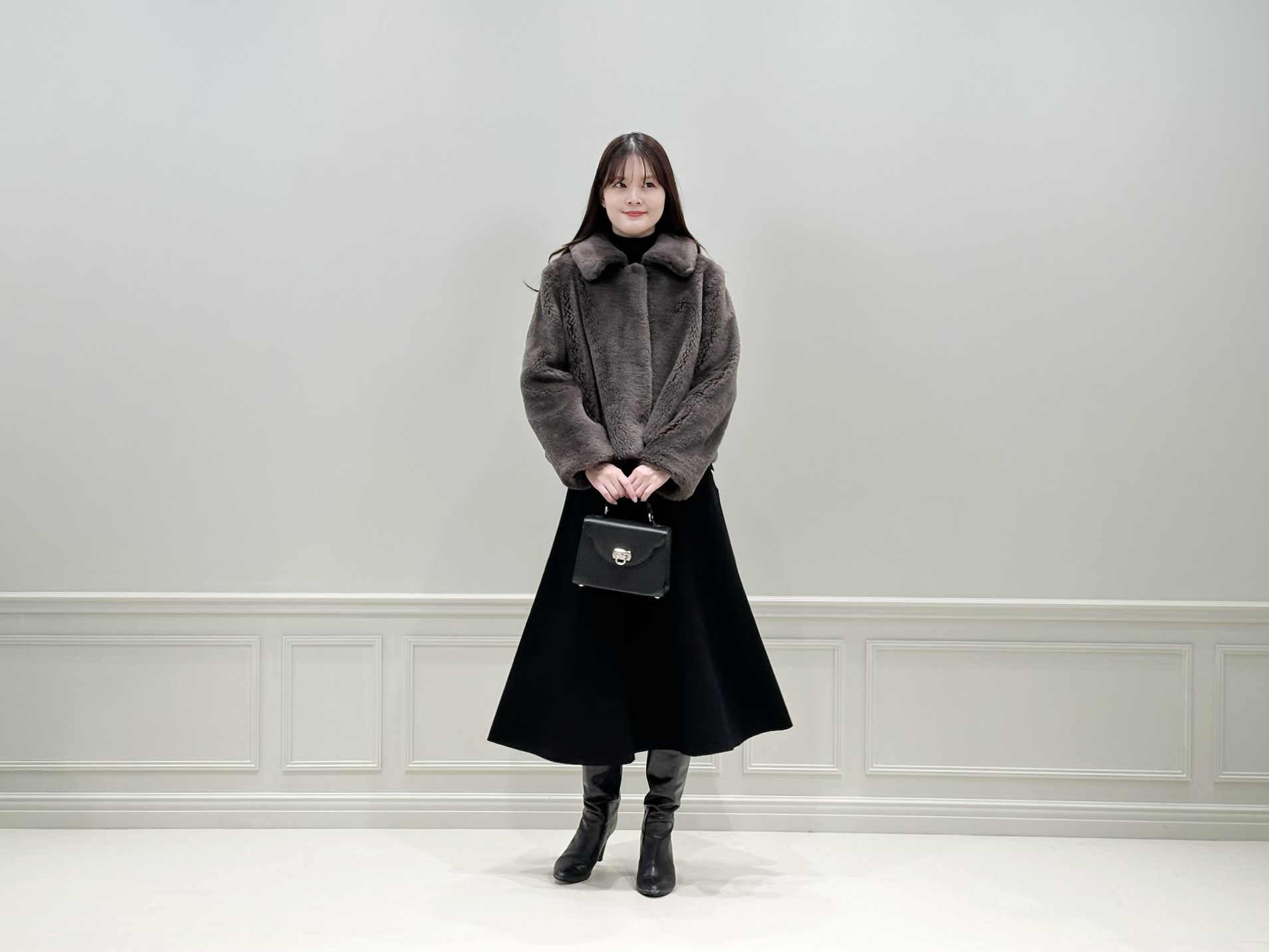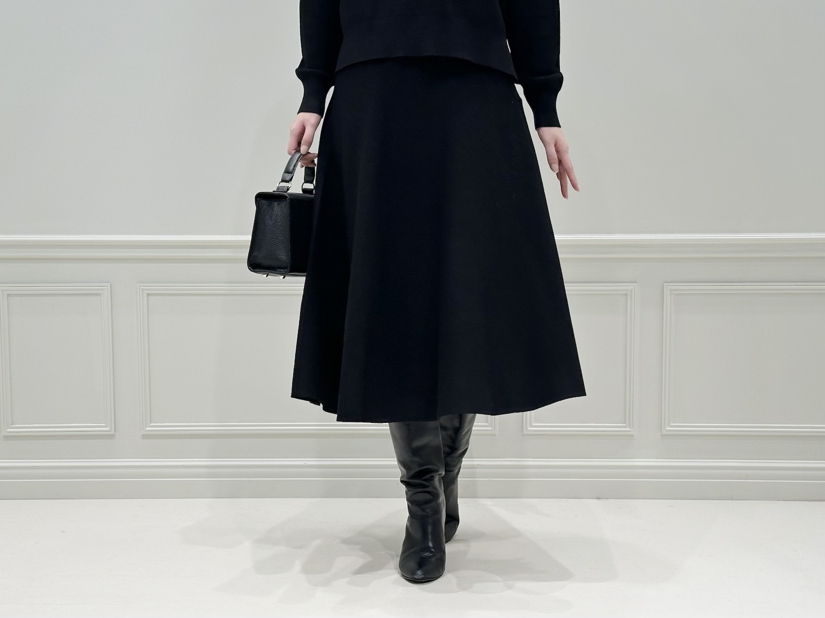 ドラマティックに広がるスカートのシルエットは冬のクラシック感を引き立て、上品な膝丈は、ロングブーツとの相性も抜群。