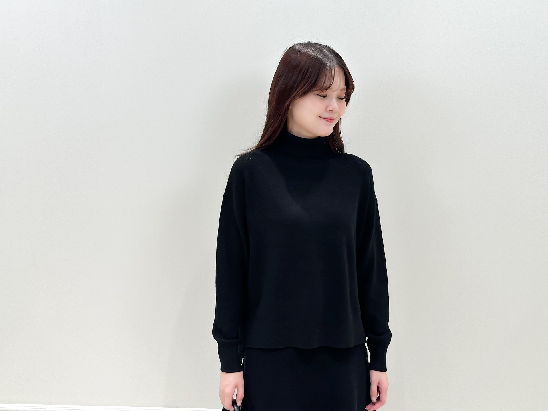 中に着たのは、同素材のタートルニット×フレアスカートのセットアップ。身体のラインを拾いすぎず、すとんと縦に落ちるミドルゲージニットがとにかく綺麗!