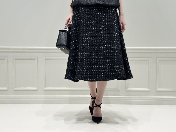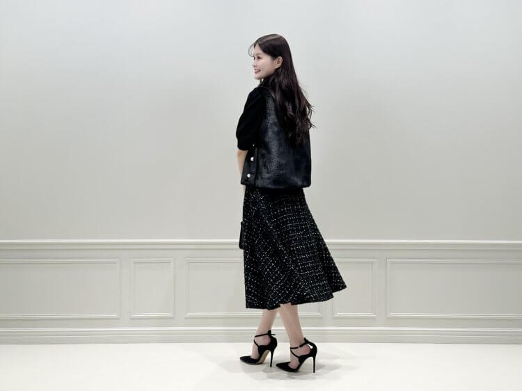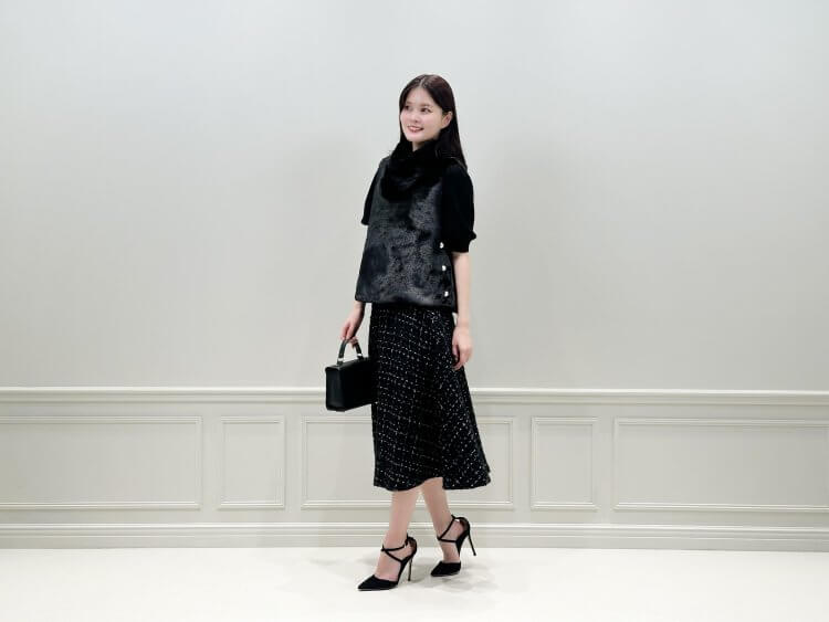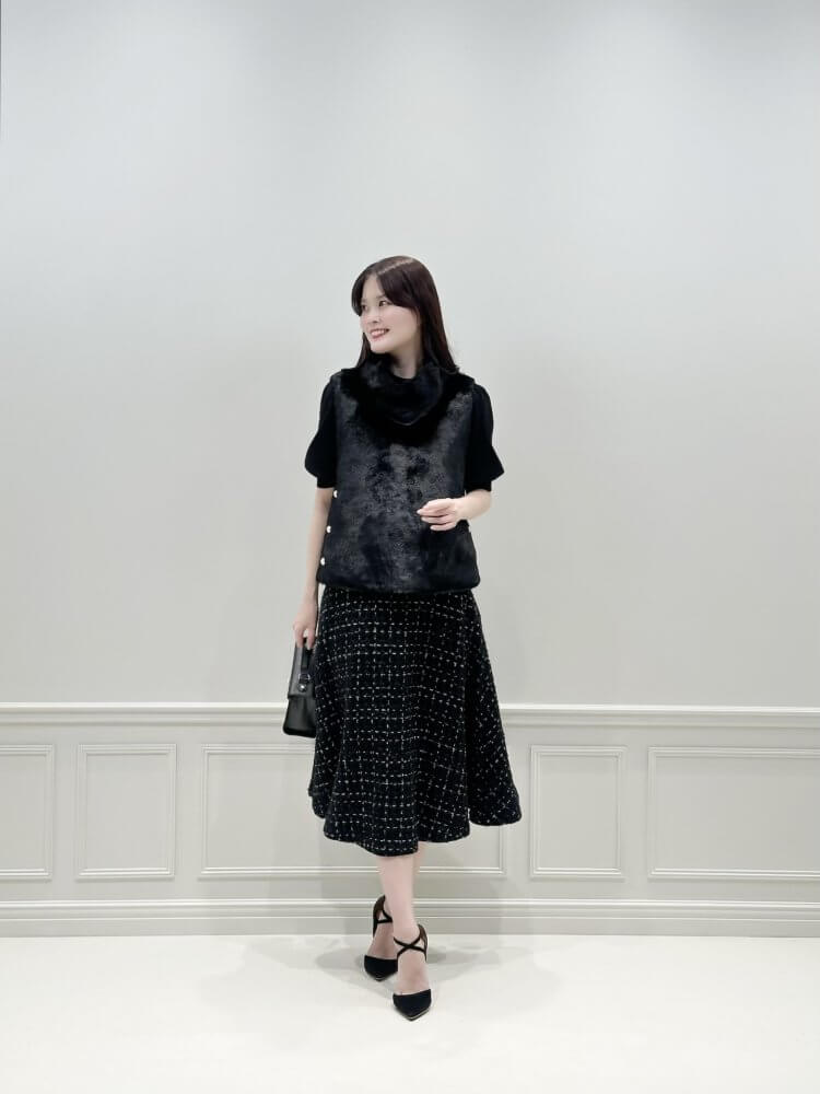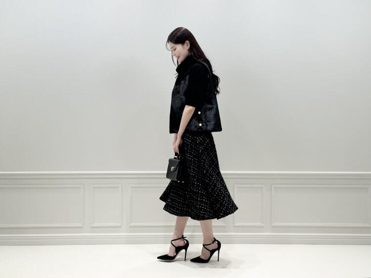 ジレの中はブラックのニットでまとめ、ファーの艶やかさやサイドのパールディテールを引き立てました。ボトムには、きらめく糸を織り込んだオリジナルツイードのフレアスカートを合わせ、動くたびに揺れる華やかなシルエットを演出!