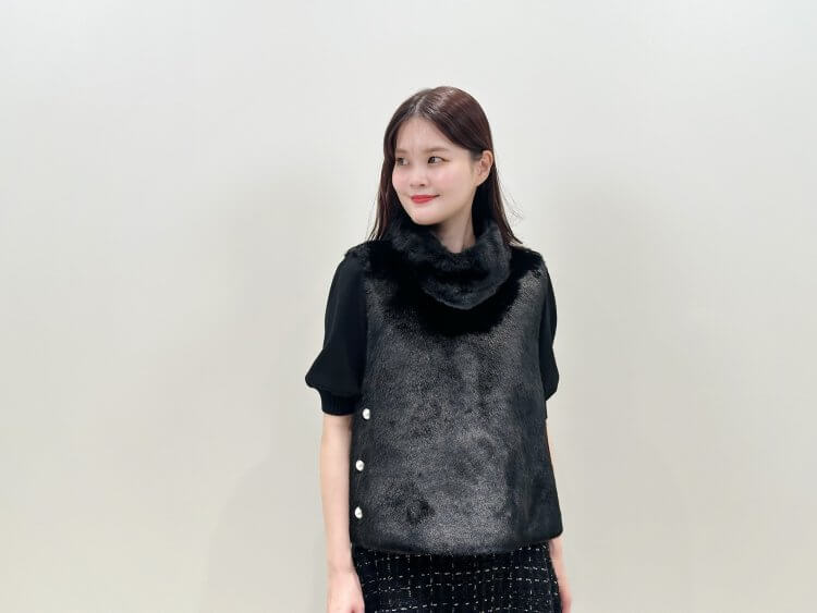 ふんわりとしたファーの質感がとても華やかで、一枚羽織るだけでスタイルが格上げされる主役アイテム。サイドに並んだ大粒のパールが、動いたときにさりげなく輝いてくれて気分も上がります!インナーをブラックで統一することで、ファーの艶やかさやパールの存在感がより引き立ちました。