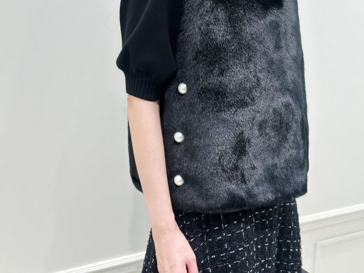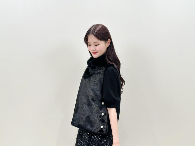ブラックのジレはラグジュアリーでモード感を引き出し、ホワイトとはまた違った表情に。シーンに合わせて色を選べば、秋冬の装いをぐっと格上げしてくれること間違いなしです。ぜひ店頭やオンラインでチェックしてみてください♡