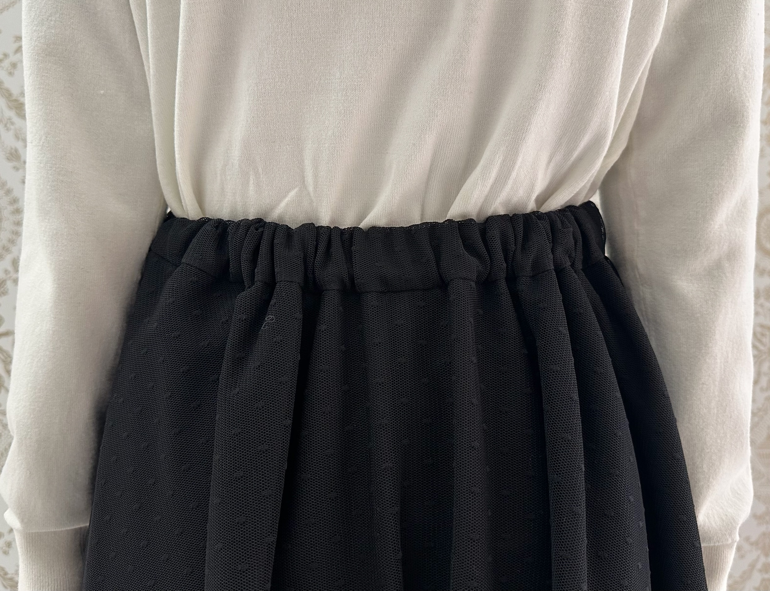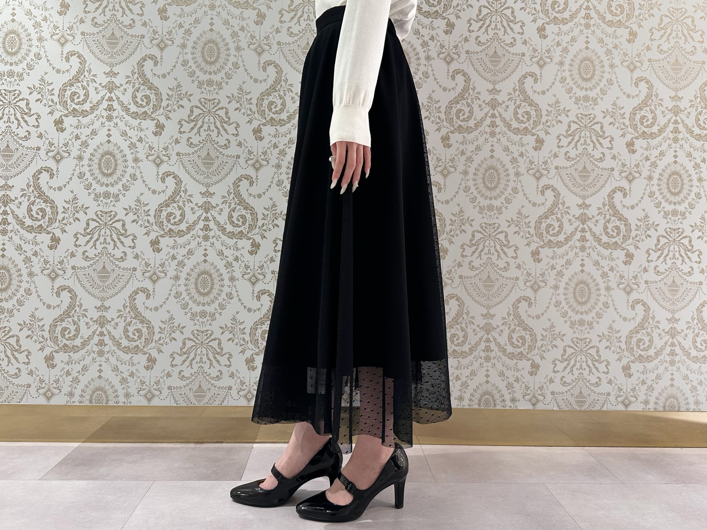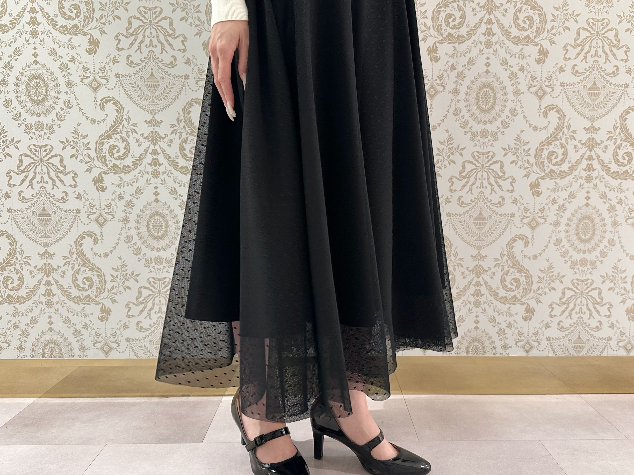細かなドット柄があしらわれたチュール素材は、動くたびふんわりと揺れ、エレガントなムードを確立。