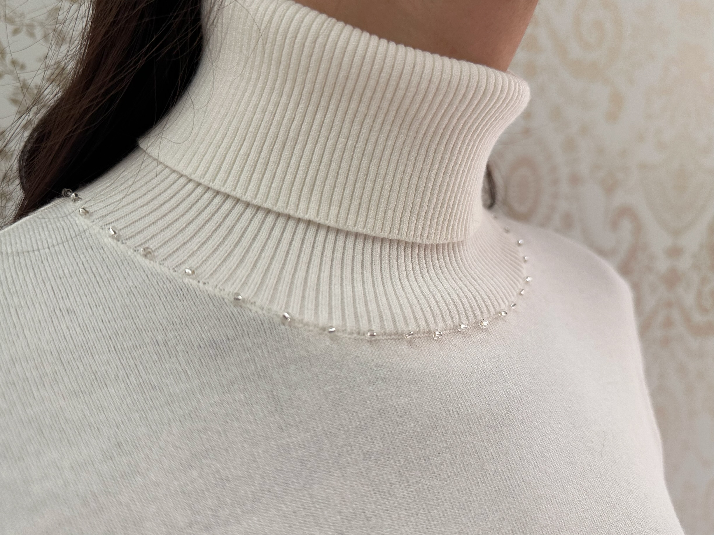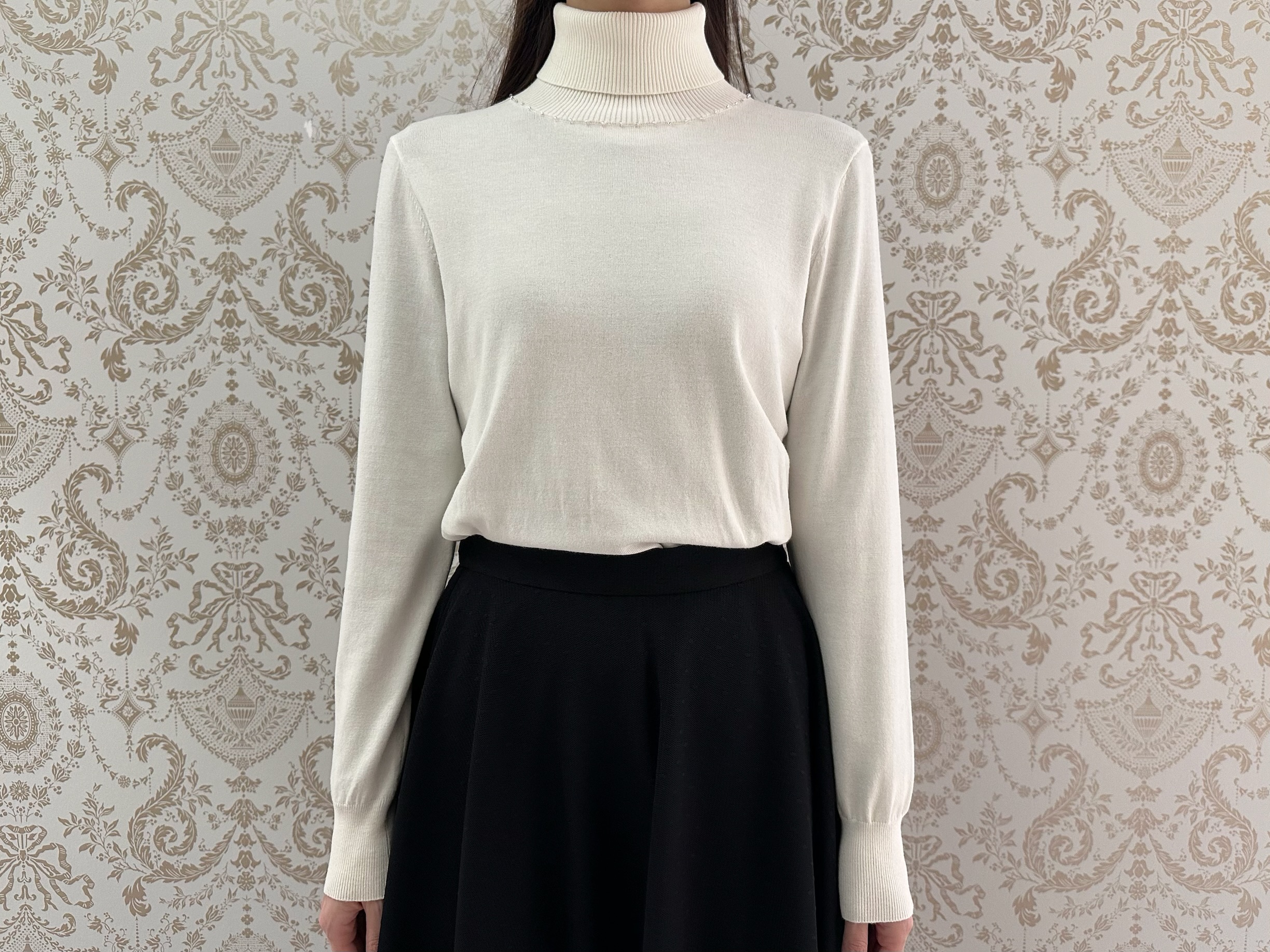 タートルネックは首回りを優しく包み込み、寒さから守ってくれるだけでなく、顔周りを華やかに美しく見せてくれる効果も。