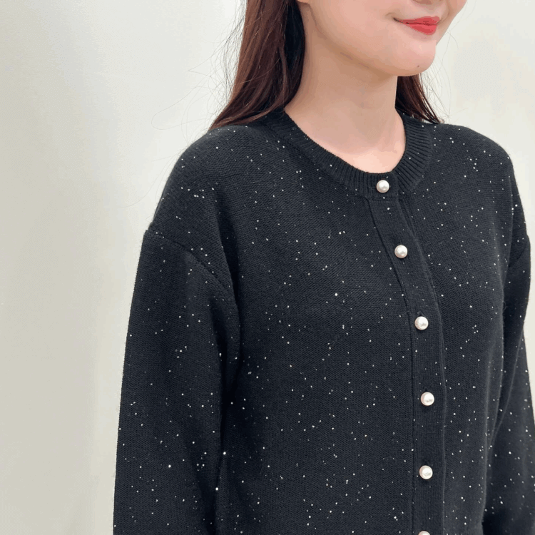 袖口に並ぶパールボタンが、さりげない華やかさを添えるハイネックニット