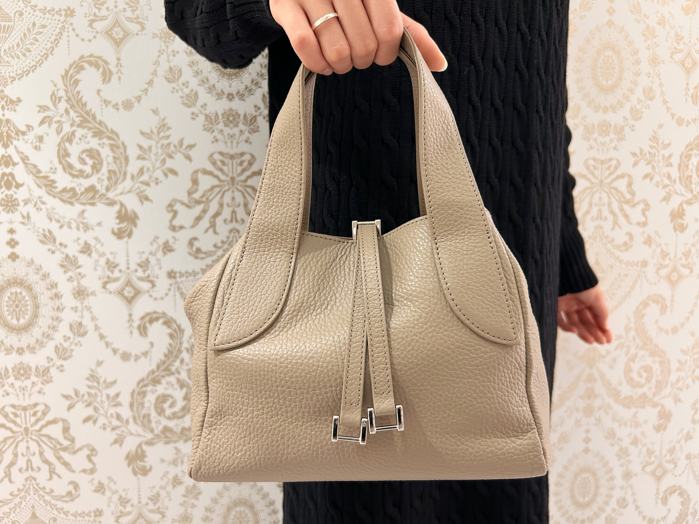 小物はベージュのバッグを合わせて、柔らかく優しい雰囲気にまとめました。