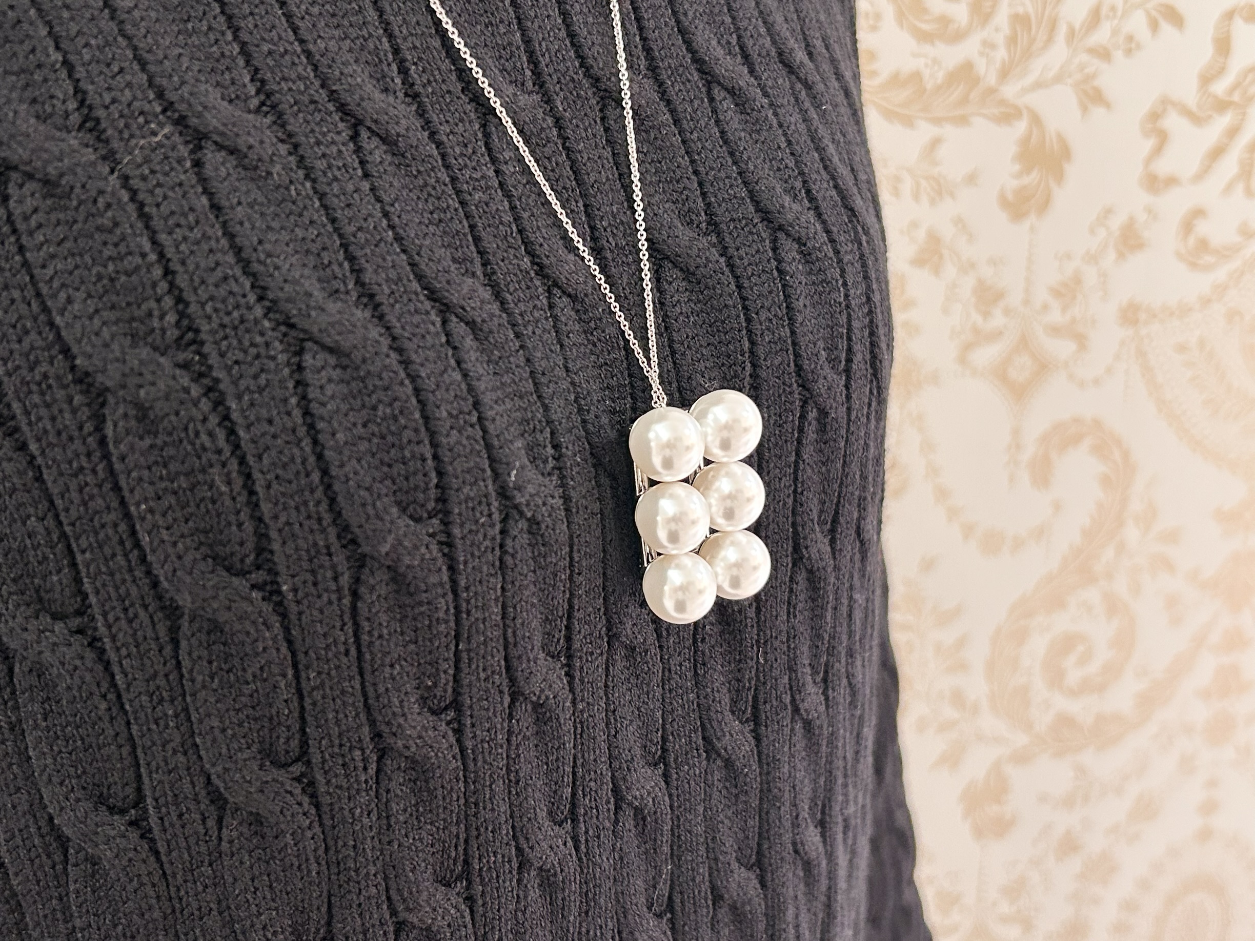 アクセントにはパールが6つ連なったネックレスをプラス。