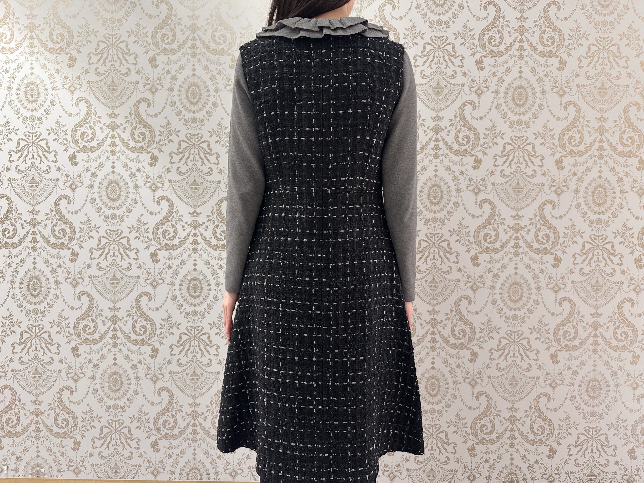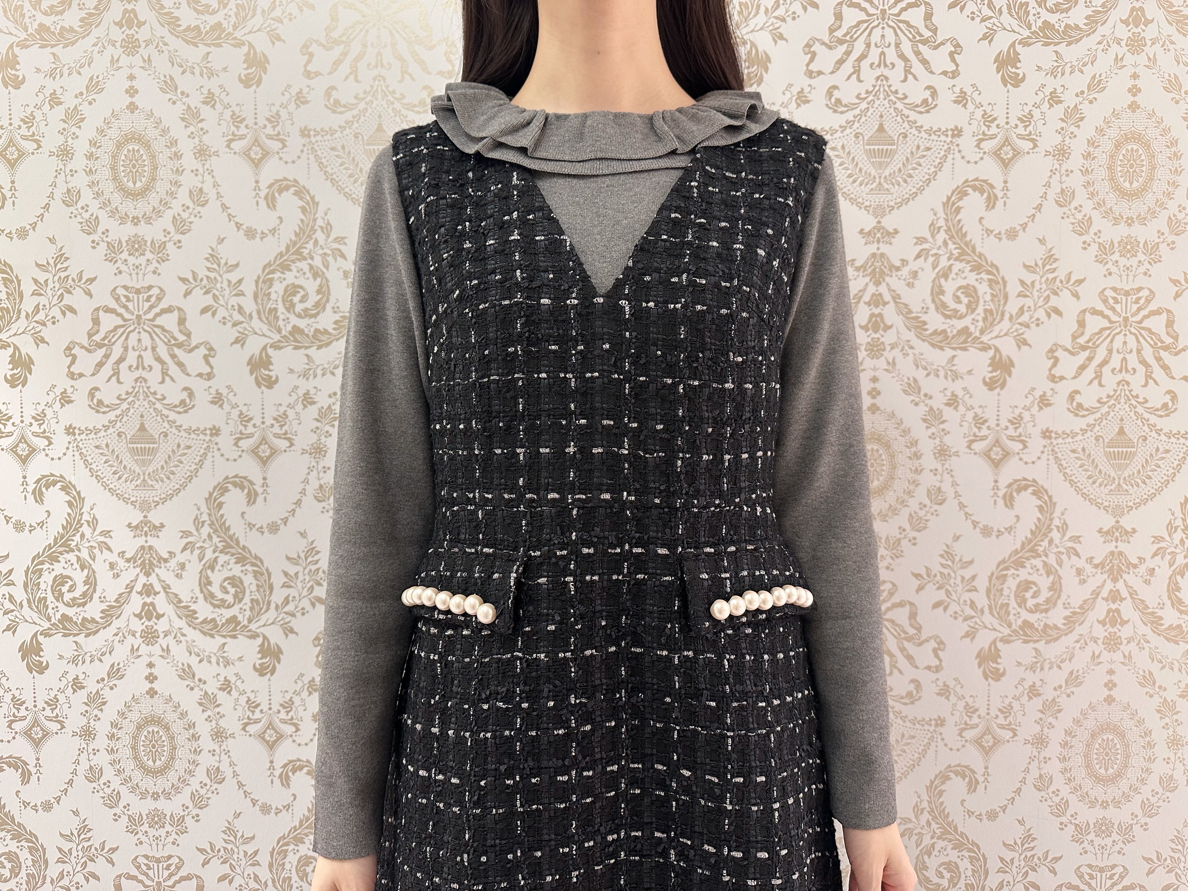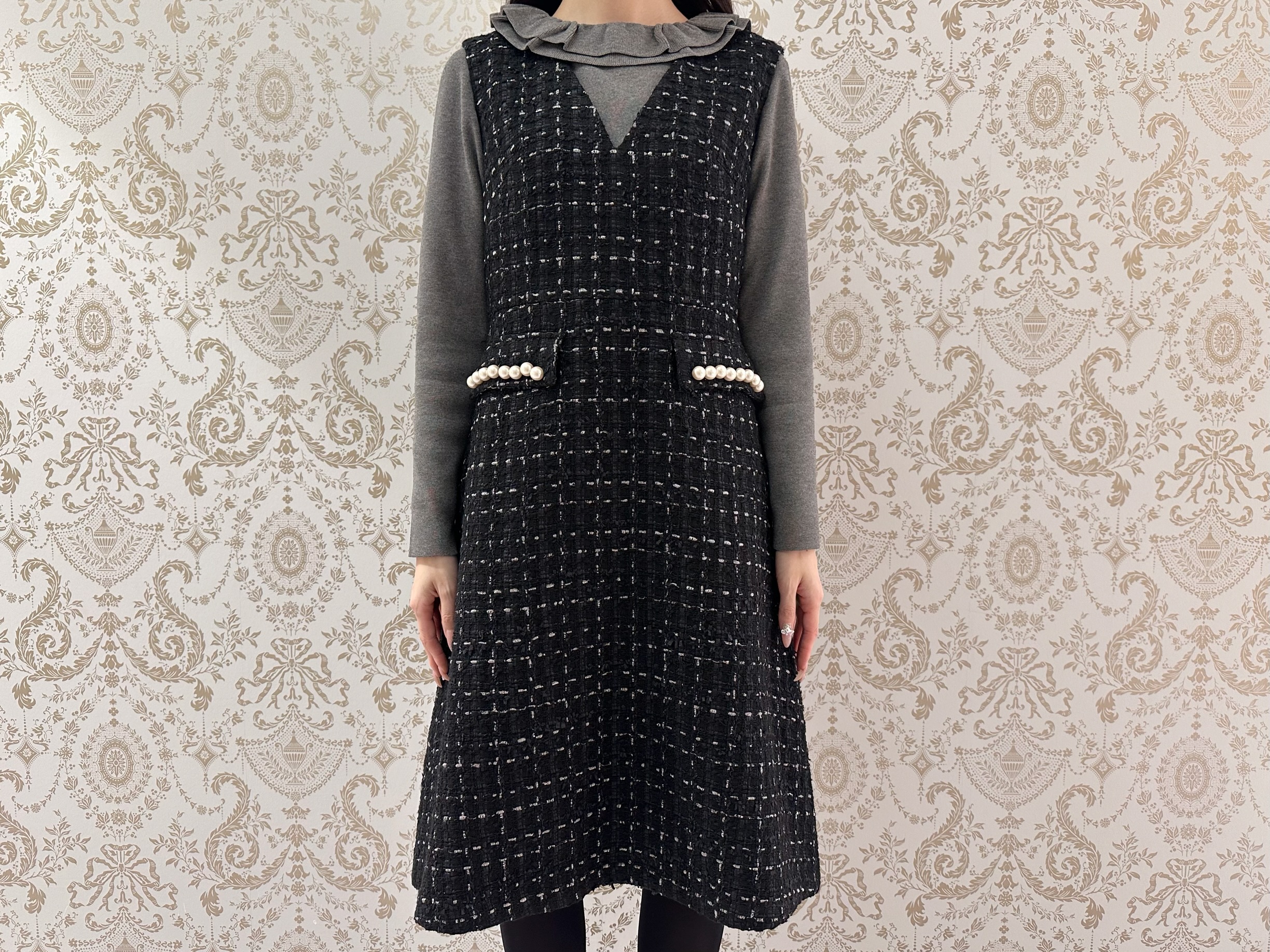 黒ベースのツイード生地にパールボタンをあしらったワンピース。