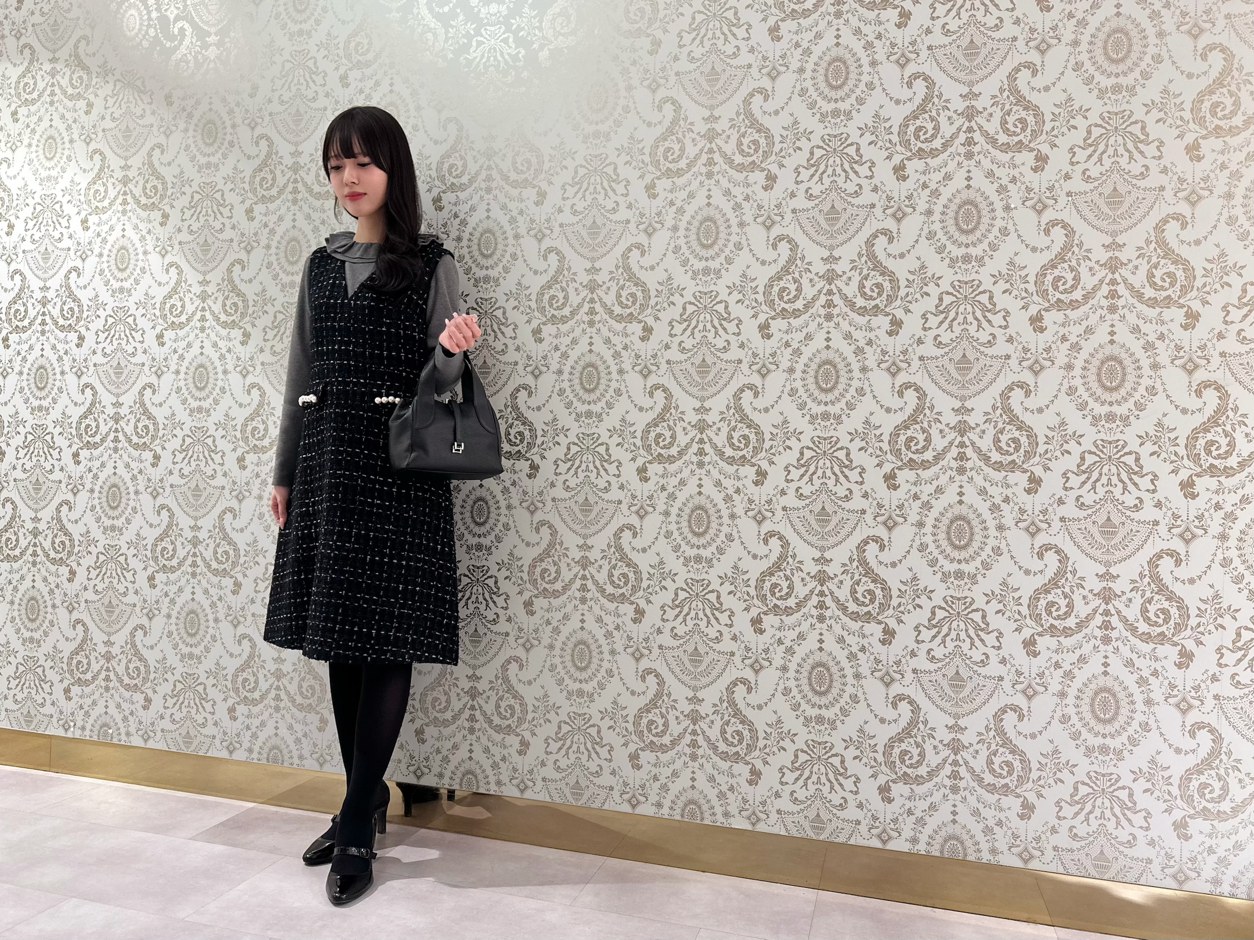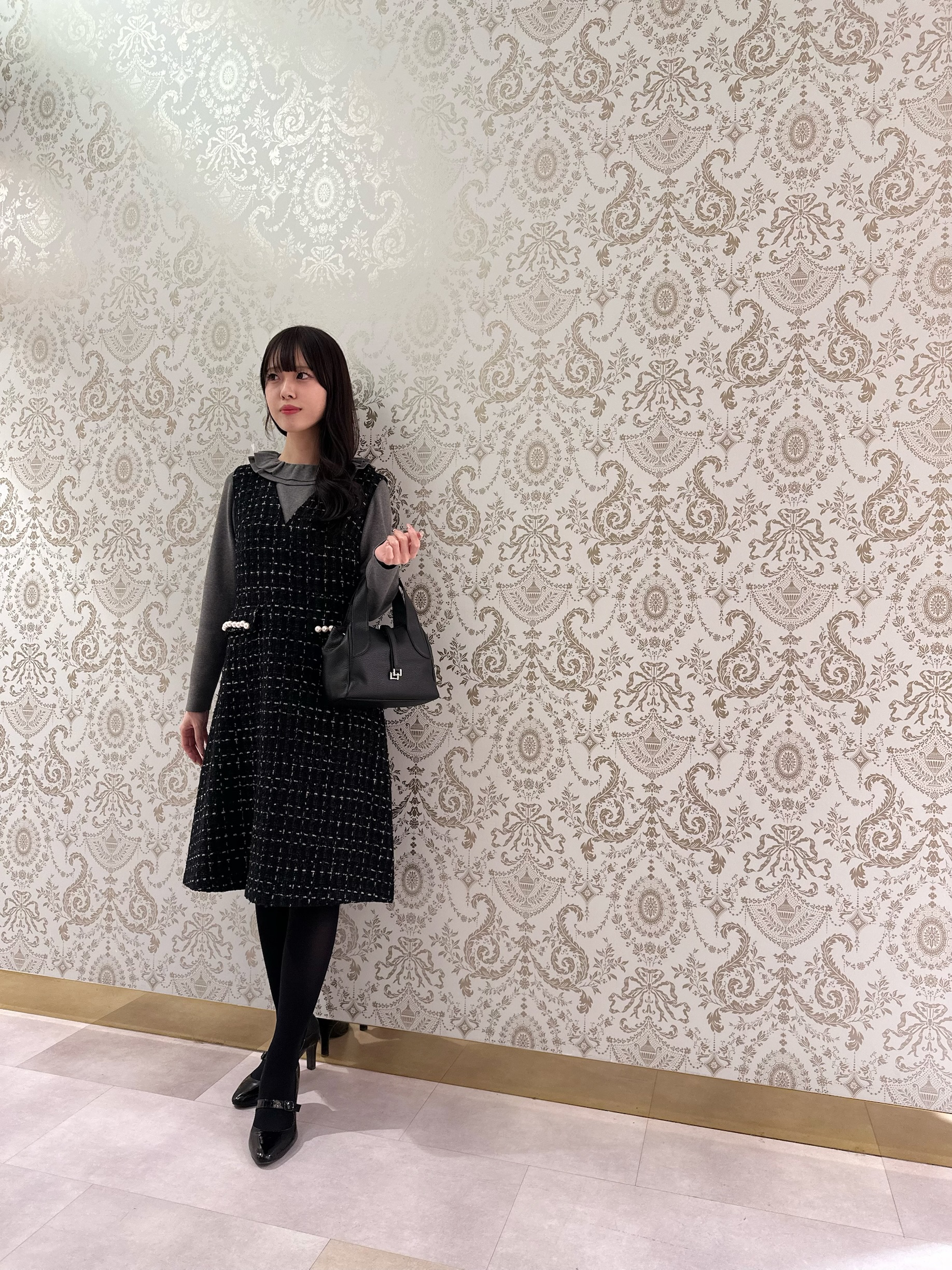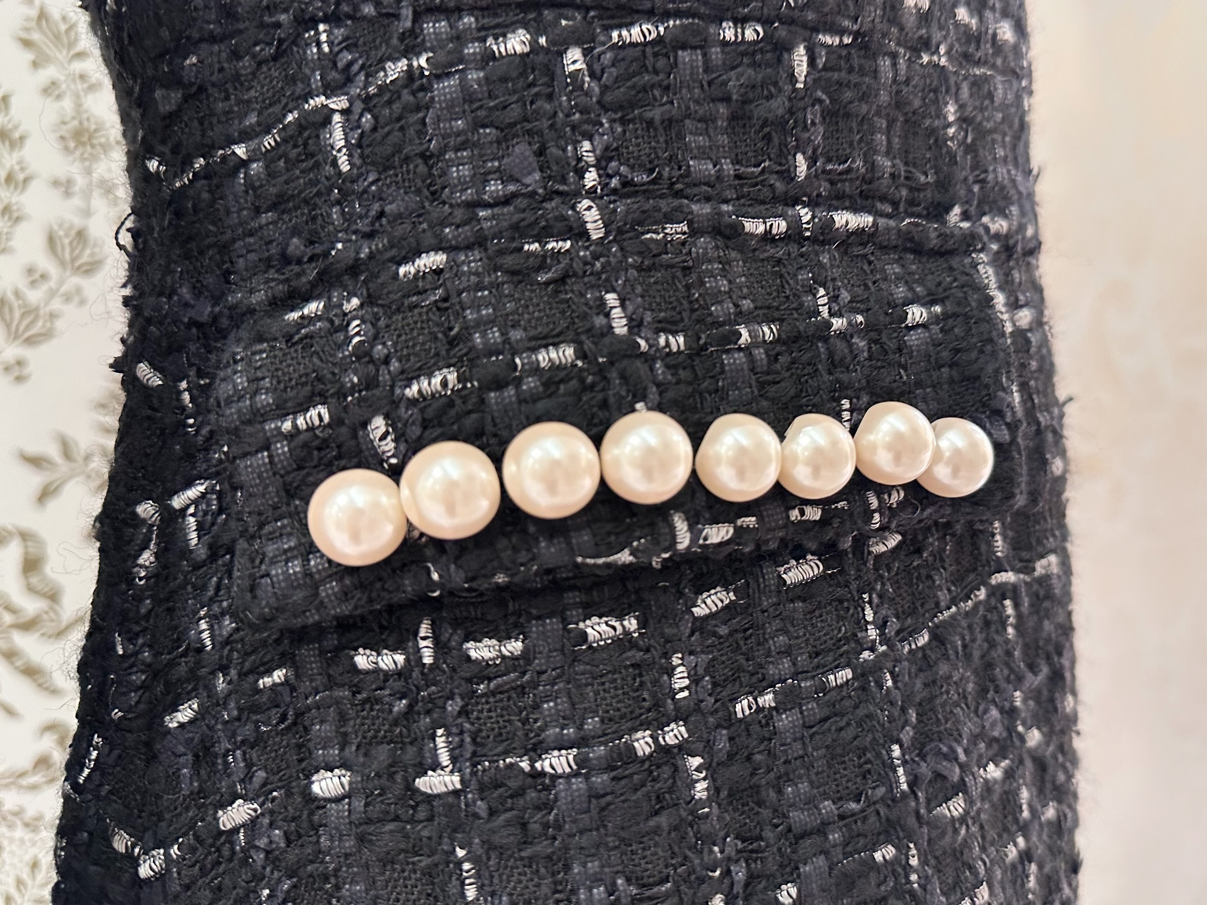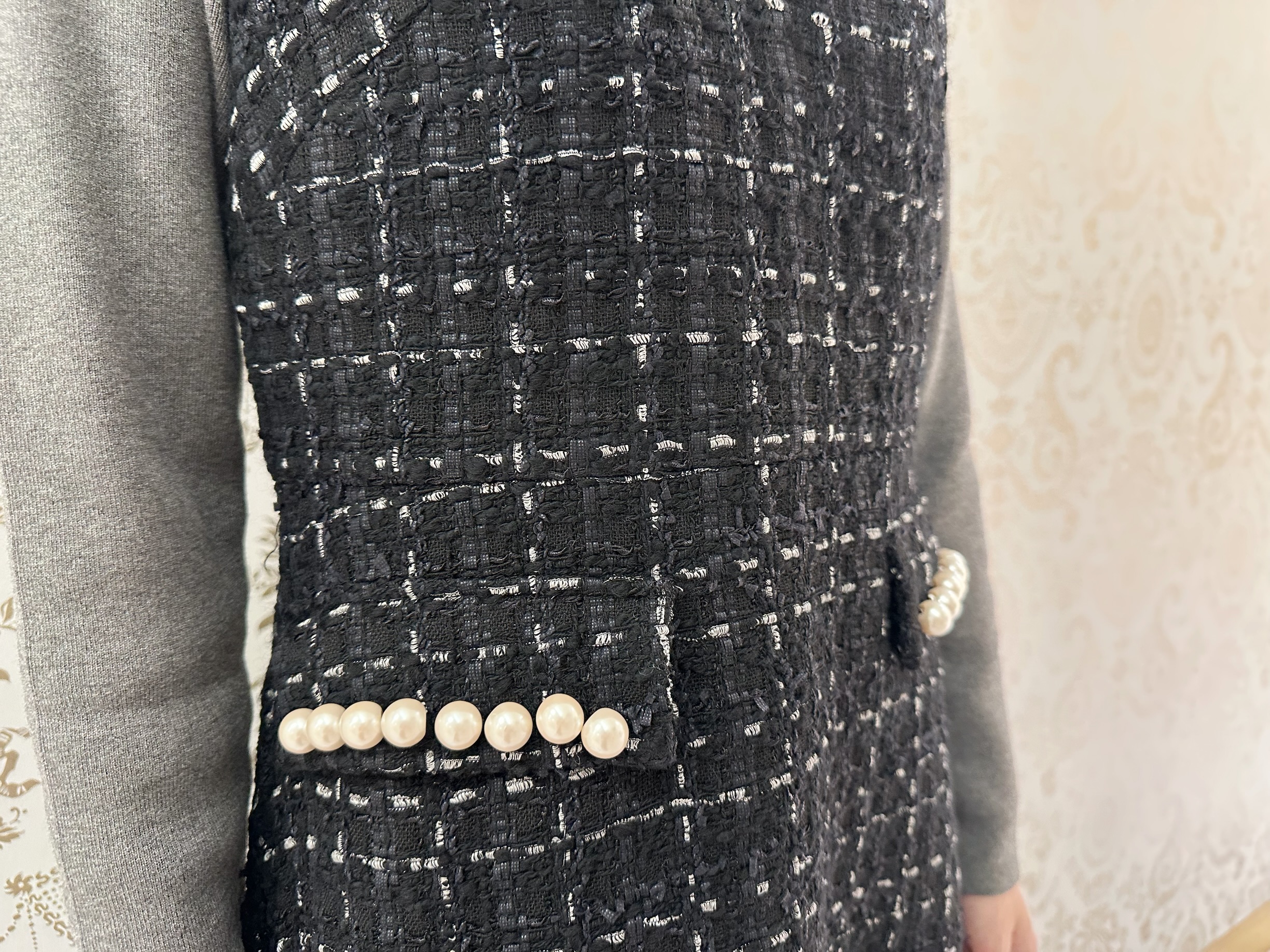 黒ベースのツイード生地にパールボタンをあしらったワンピース。