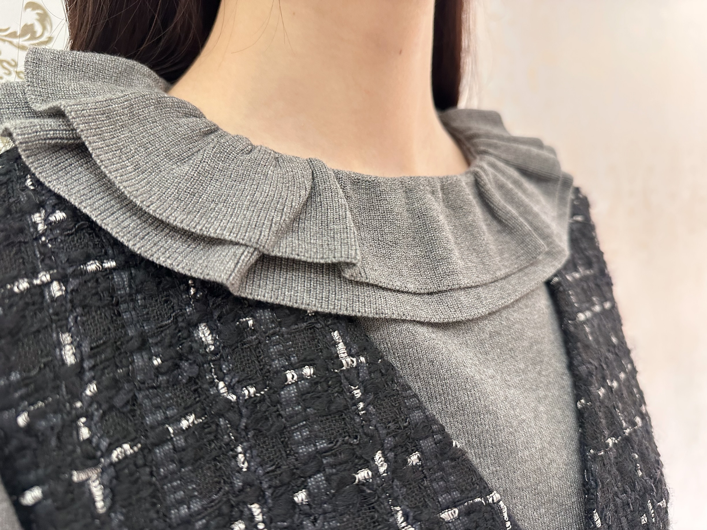 首元のフリルはフェミニンな印象を演出。顔周りを華やかに見せる効果があります。