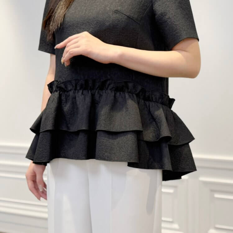 上半身はコンパクトに、裾に向かってふんわりと広がるフレアシルエットが女性らしい華やかさを