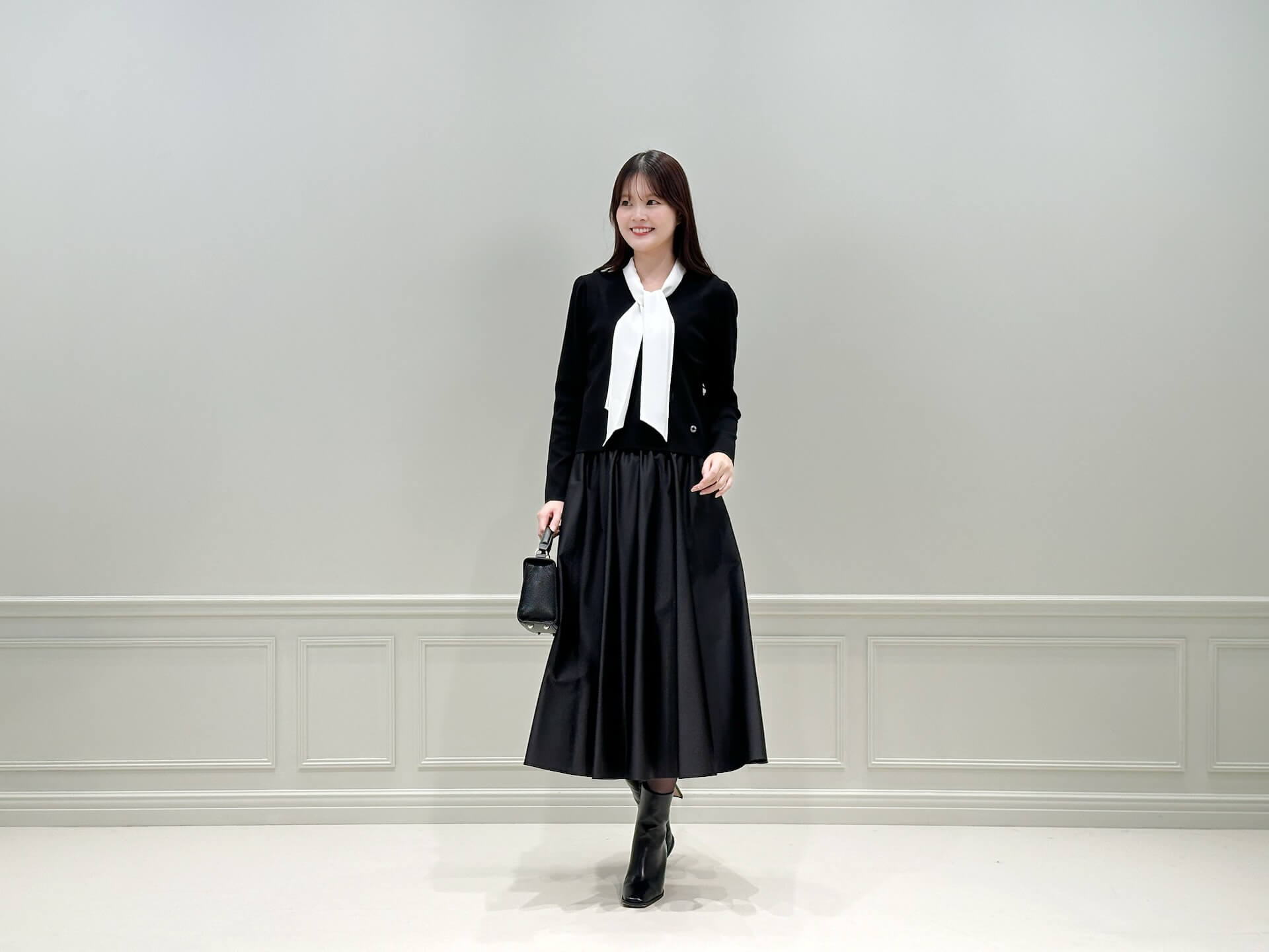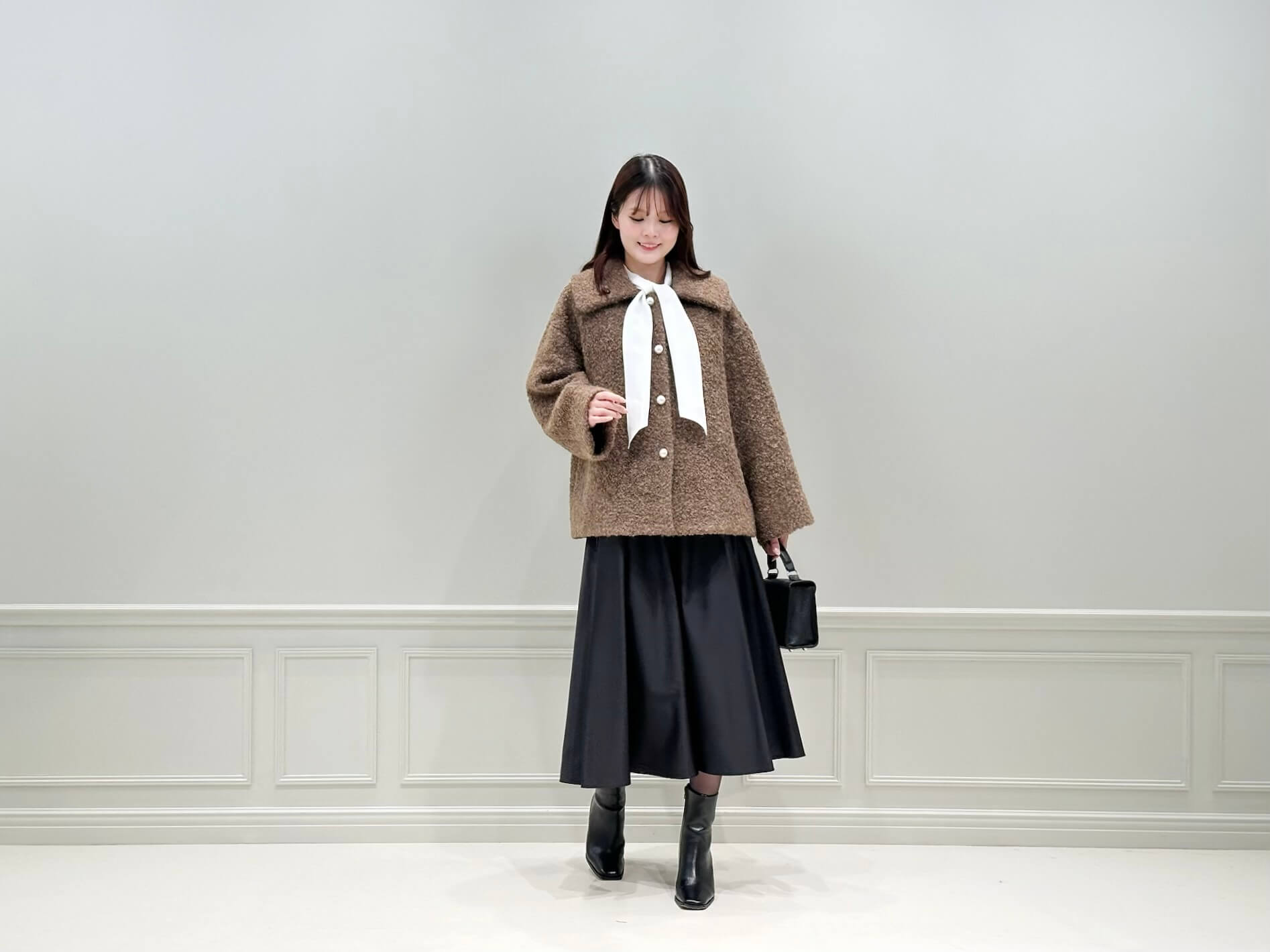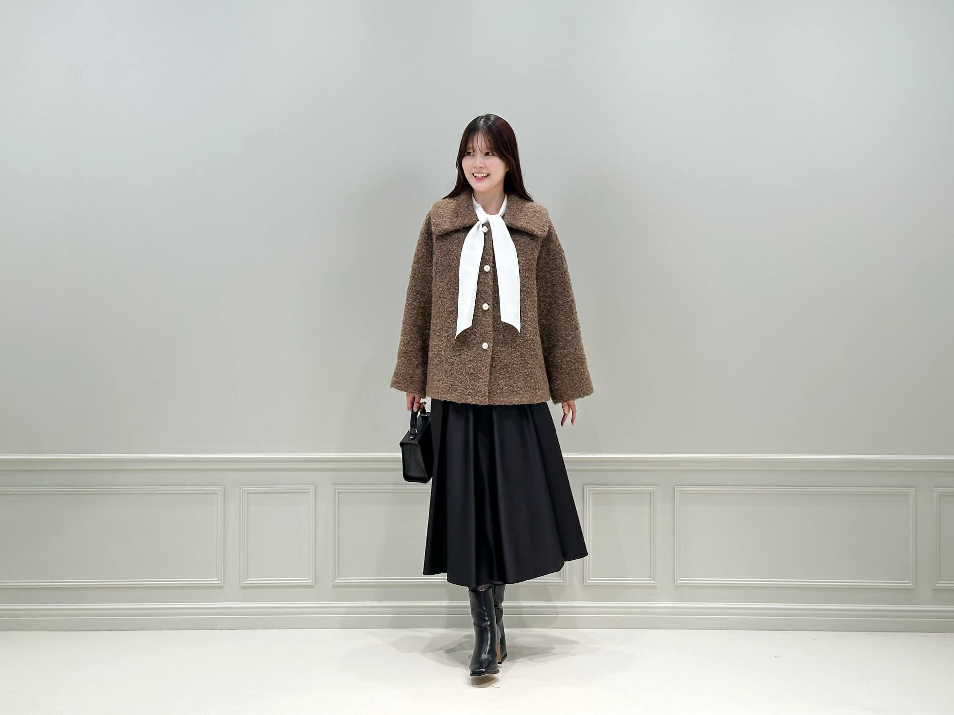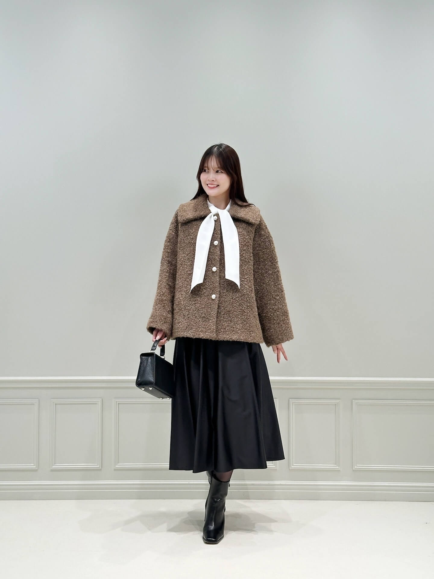 上半身で“ボウタイ×パール”の華やかさを出している分、スカートはブラックでまとめて大人らしさをキープ。足元のロングブーツまでブラックで繋ぐことで、シルエットに自然な縦ラインが生まれ、すっきり見えるのも嬉しいポイントです。