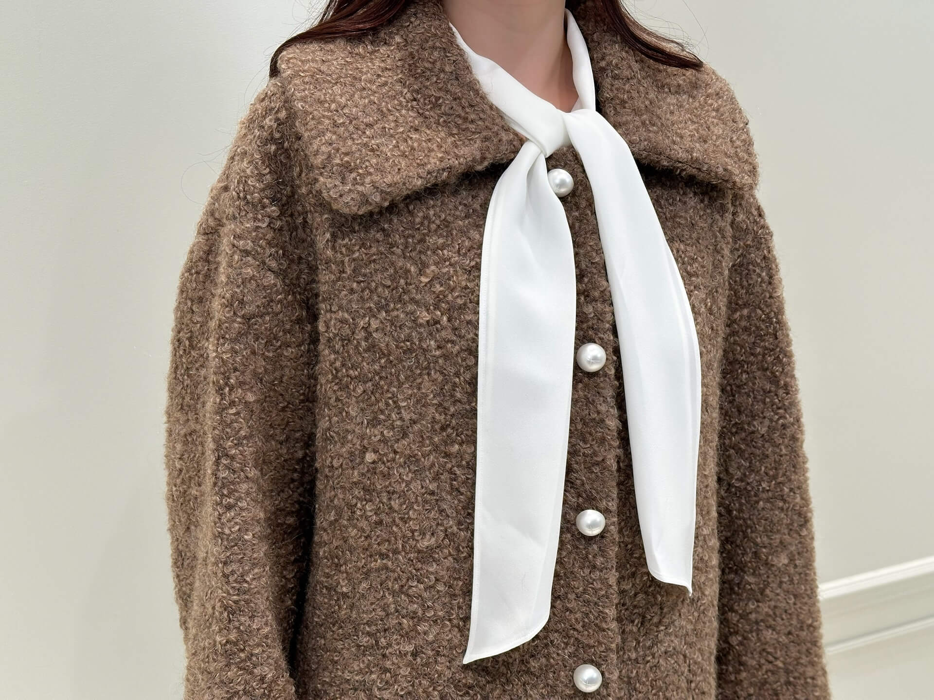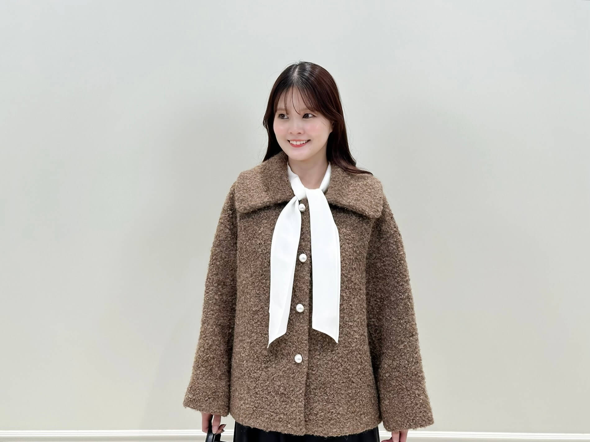 ニットのボウタイ部分をあえてコートの外へ覗かせることで、顔まわりにふわっと華やぎが生まれ、普段のアウタースタイルがぐっと新鮮に。可愛らしさがありながら甘くなりすぎない、この冬ぜひ試していただきたいお気に入りのアレンジです。