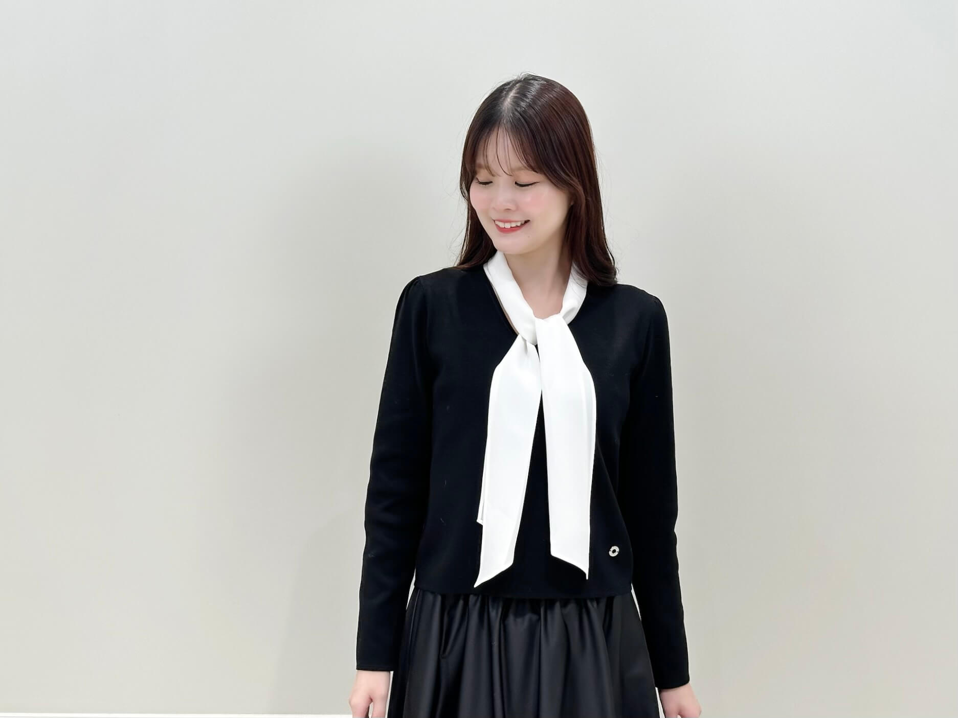この“パール”と、ニットの“白いボウタイ”がリンクすることで、全体を優しくまとめながらも印象に残るスタイルに仕上がります!