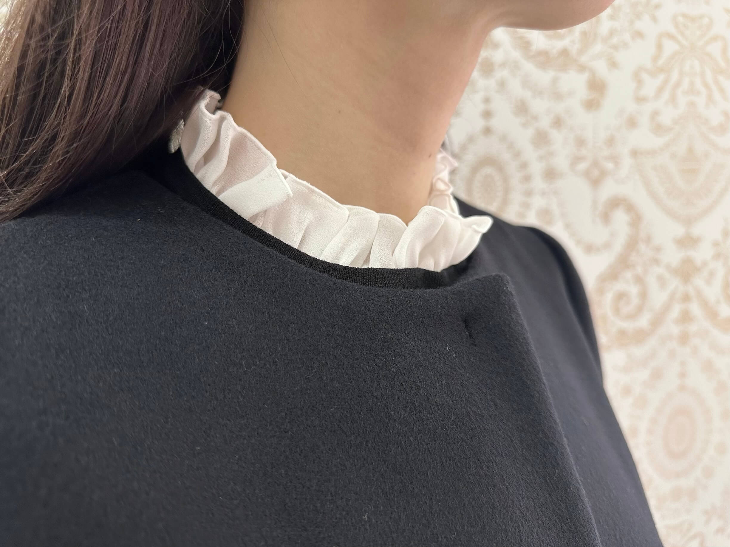 首元はラウンドネックのお作りなので、中にタートルネックや装飾のある華やかなブラウスを仕込むと、ワンランク上のスタイリングに仕上がります。