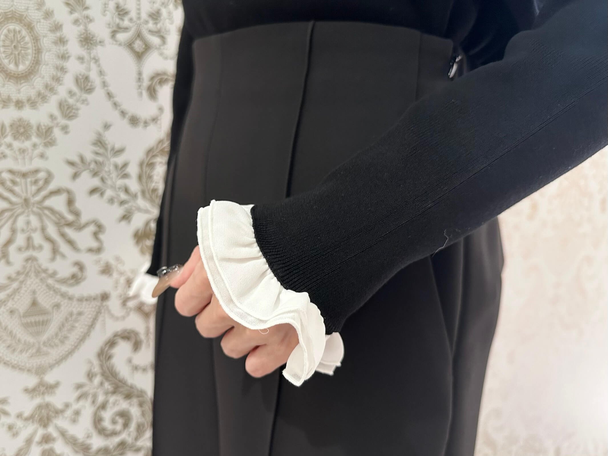 袖部分にも同様のシフォンフリルがあしらわれており、ブラックの生地とのコントラストが目を惹きます。