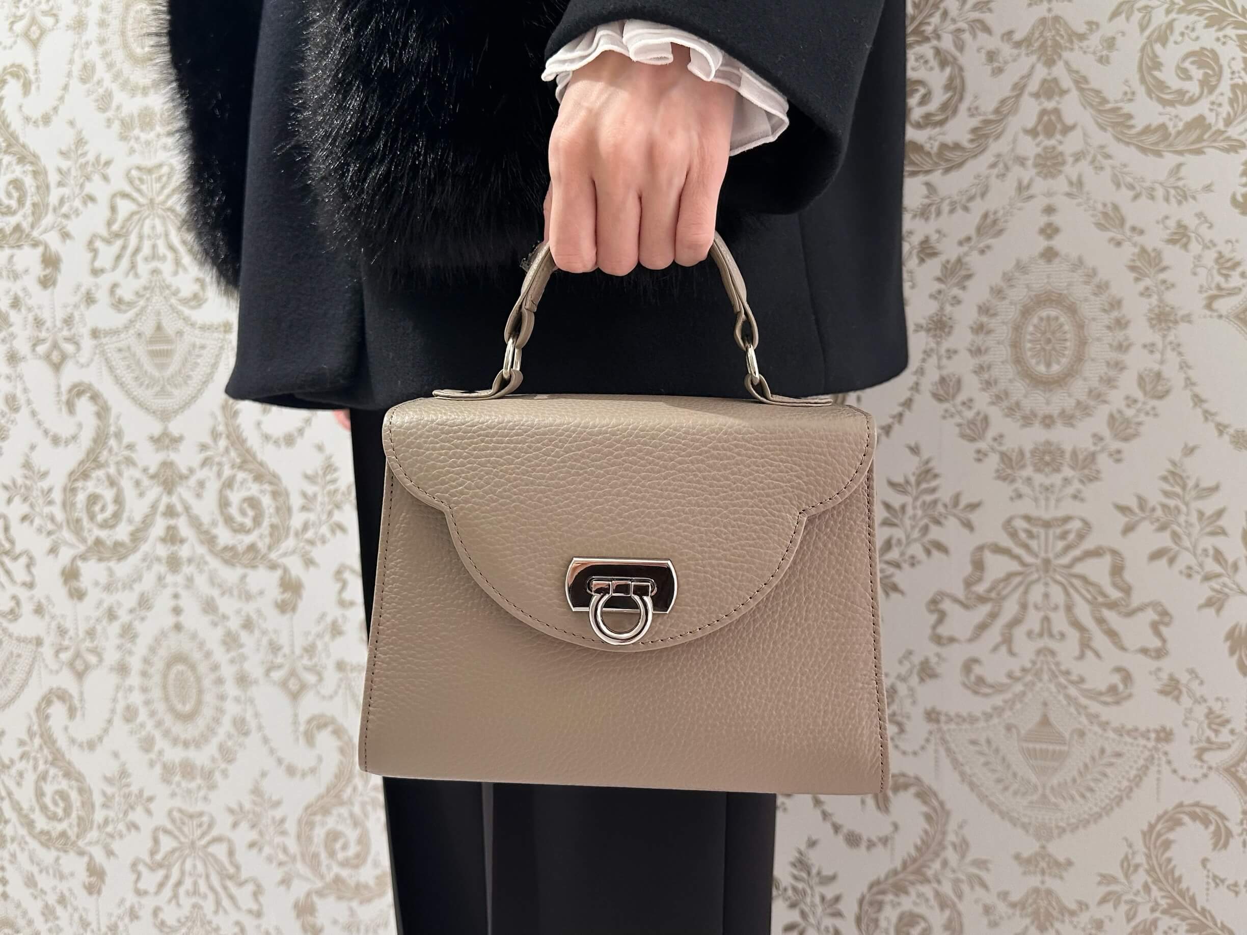 きちんと感がありながら、柔らかなイメージを持ち合わせたベージュのスクエアバッグはシルバーの金具がノーブルな女性らしさを引き立てます。