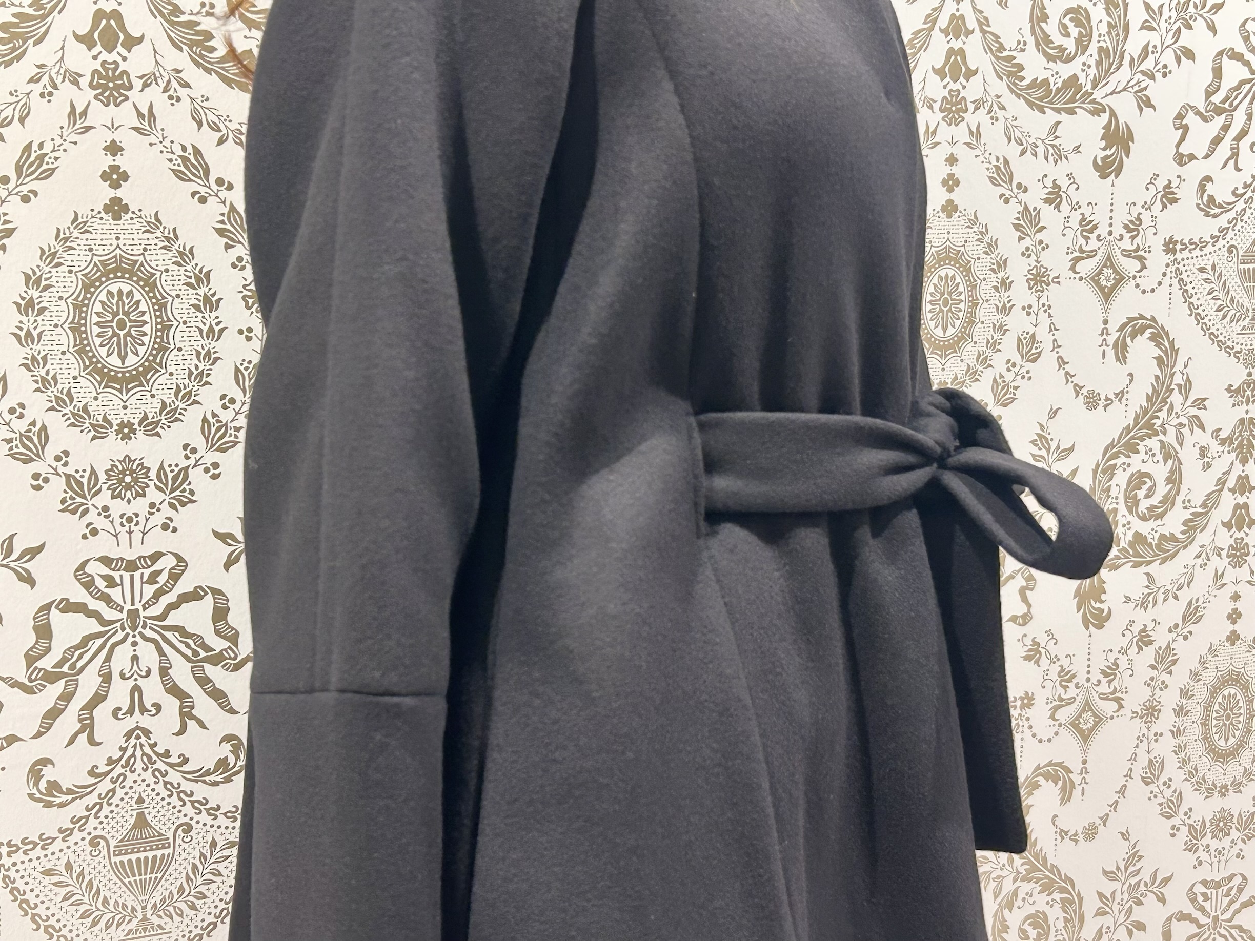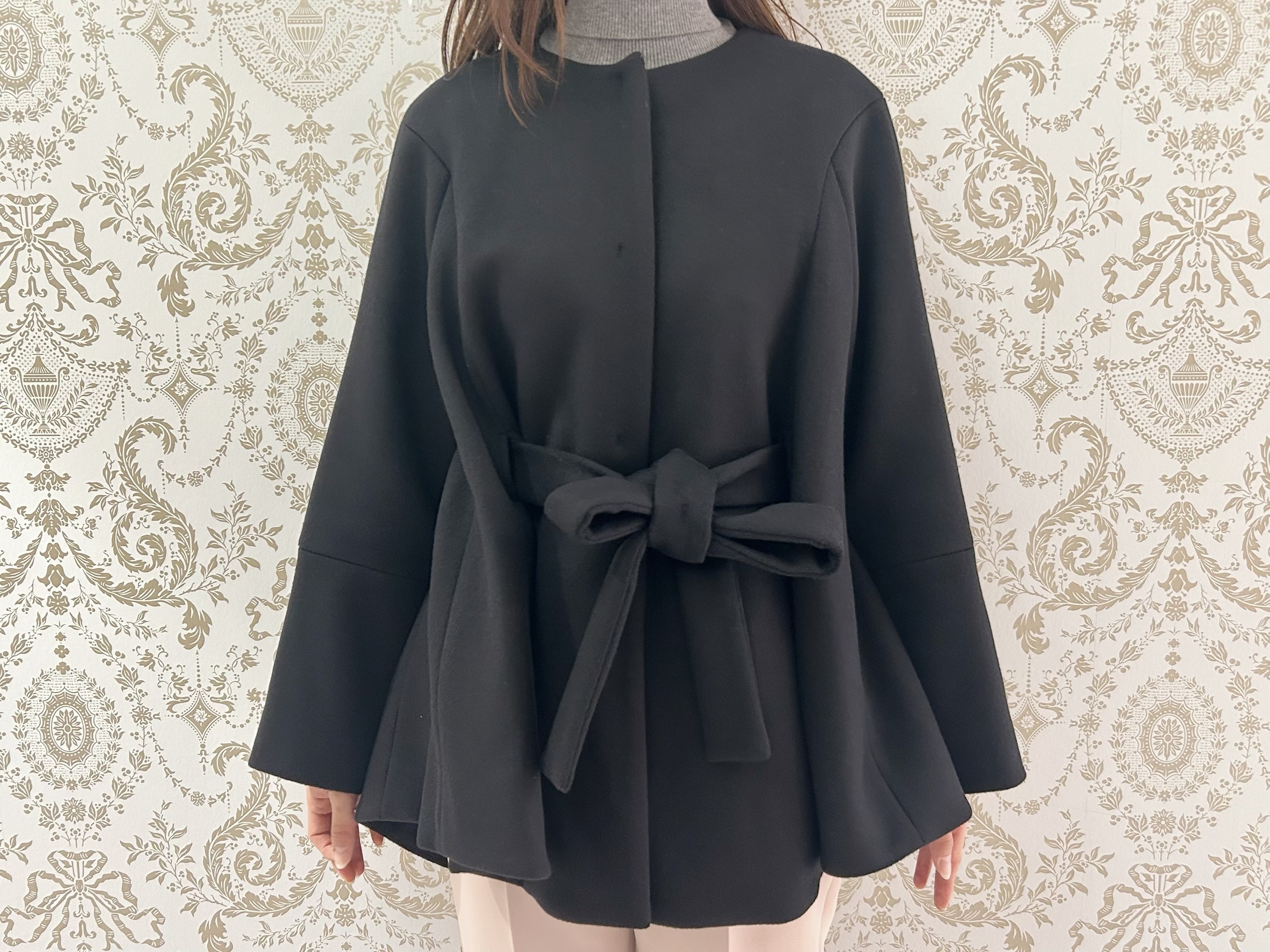 前で結ぶウエストリボンは、コートの内側にリボンが通るデザインのため、後ろにボリュームが出ないデザイン。