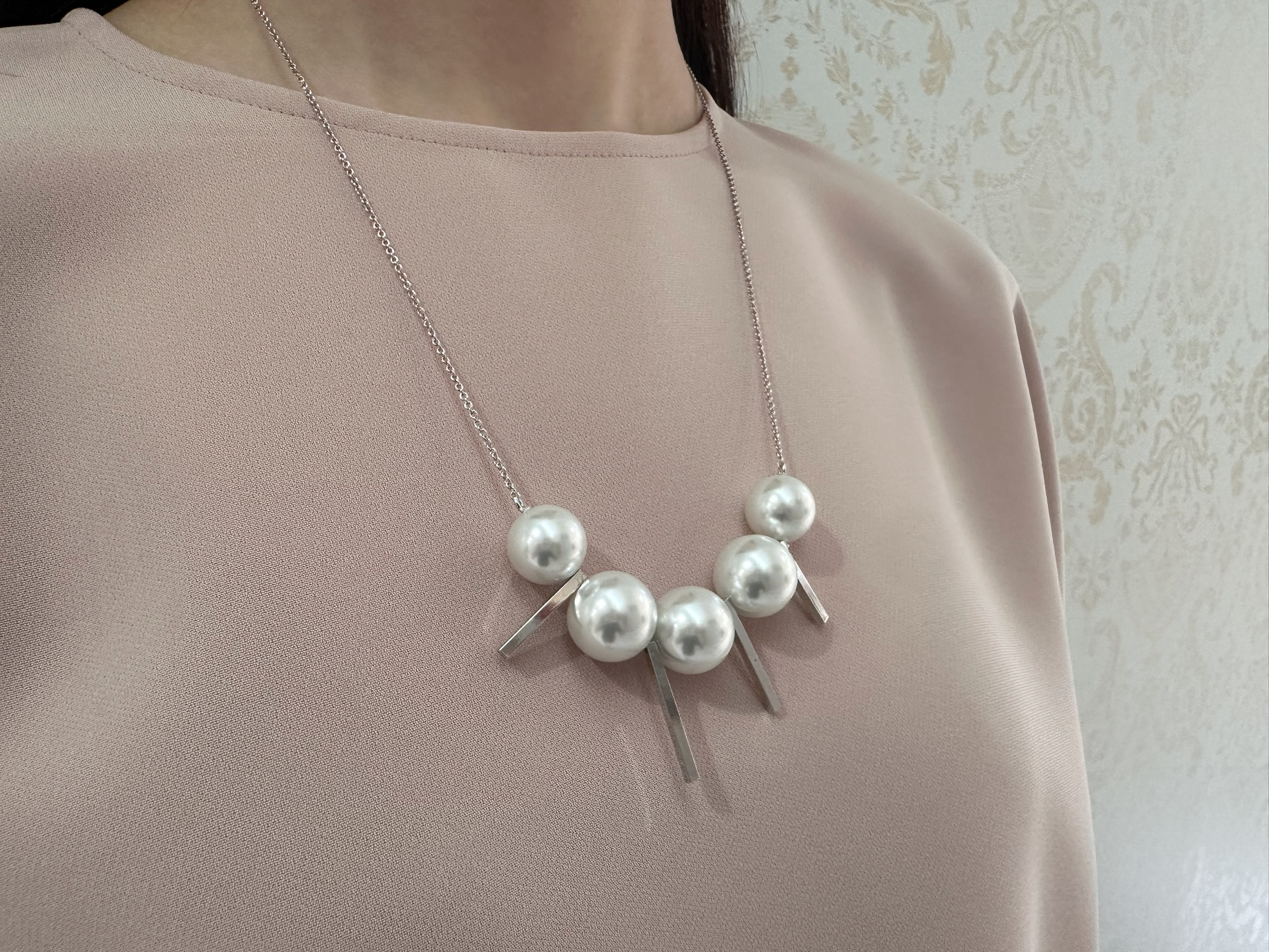 直線的なバーのラインがモダンでありながら、パールの柔らかな丸みが大人の女性らしい優しさもプラスします。