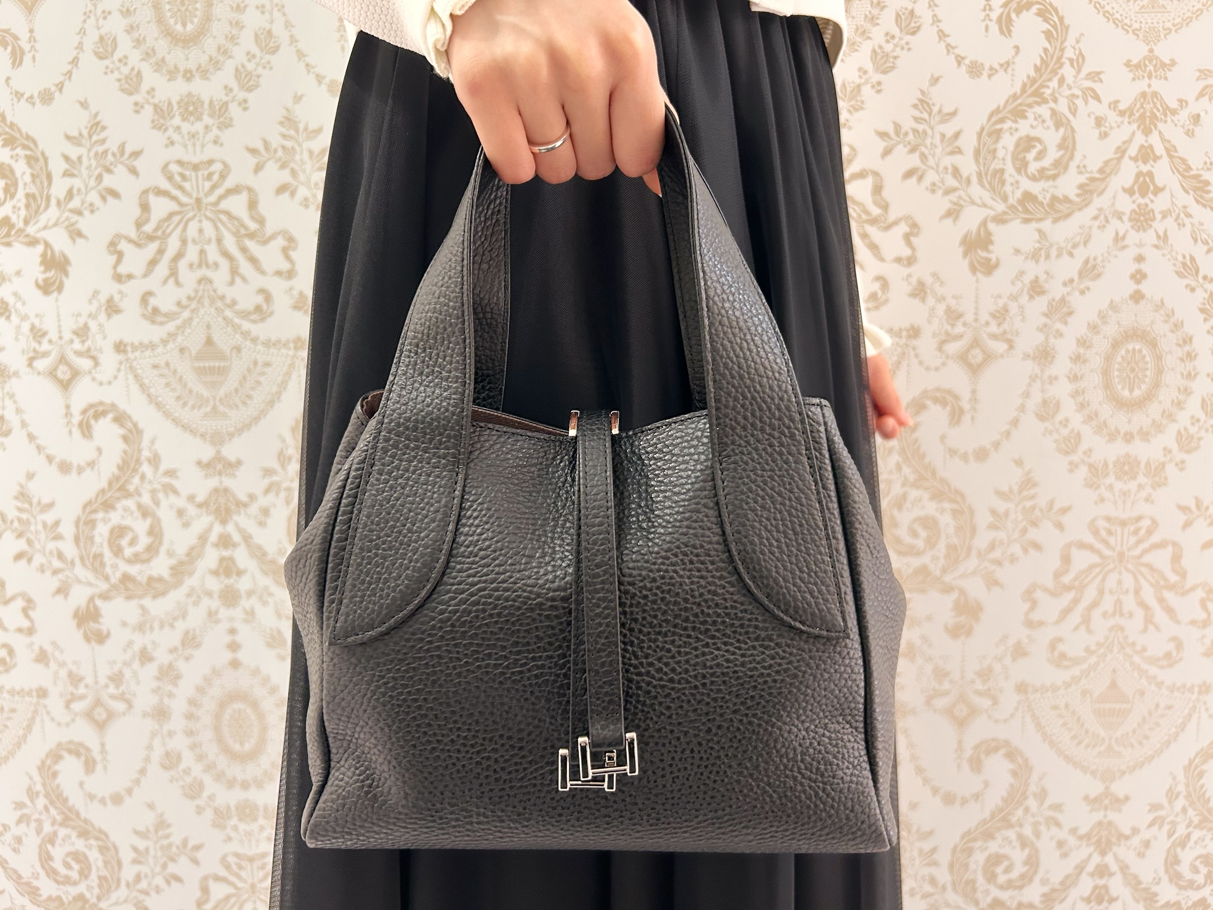仕上げにはベルト付きのレザーバッグをプラスし、柔らかな素材感の中に程よい引き締めを。