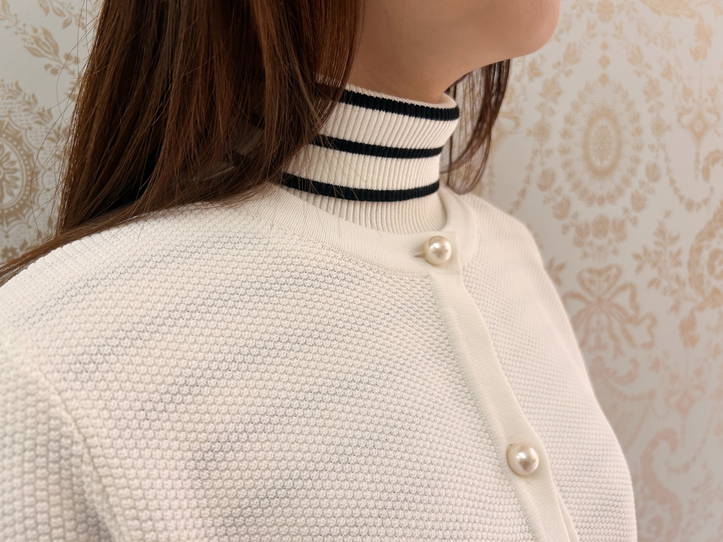 クリーンなホワイトが印象的な鹿子編みニットを主役に、モノトーンでまとめた上品なレイヤードスタイルのご紹介です。