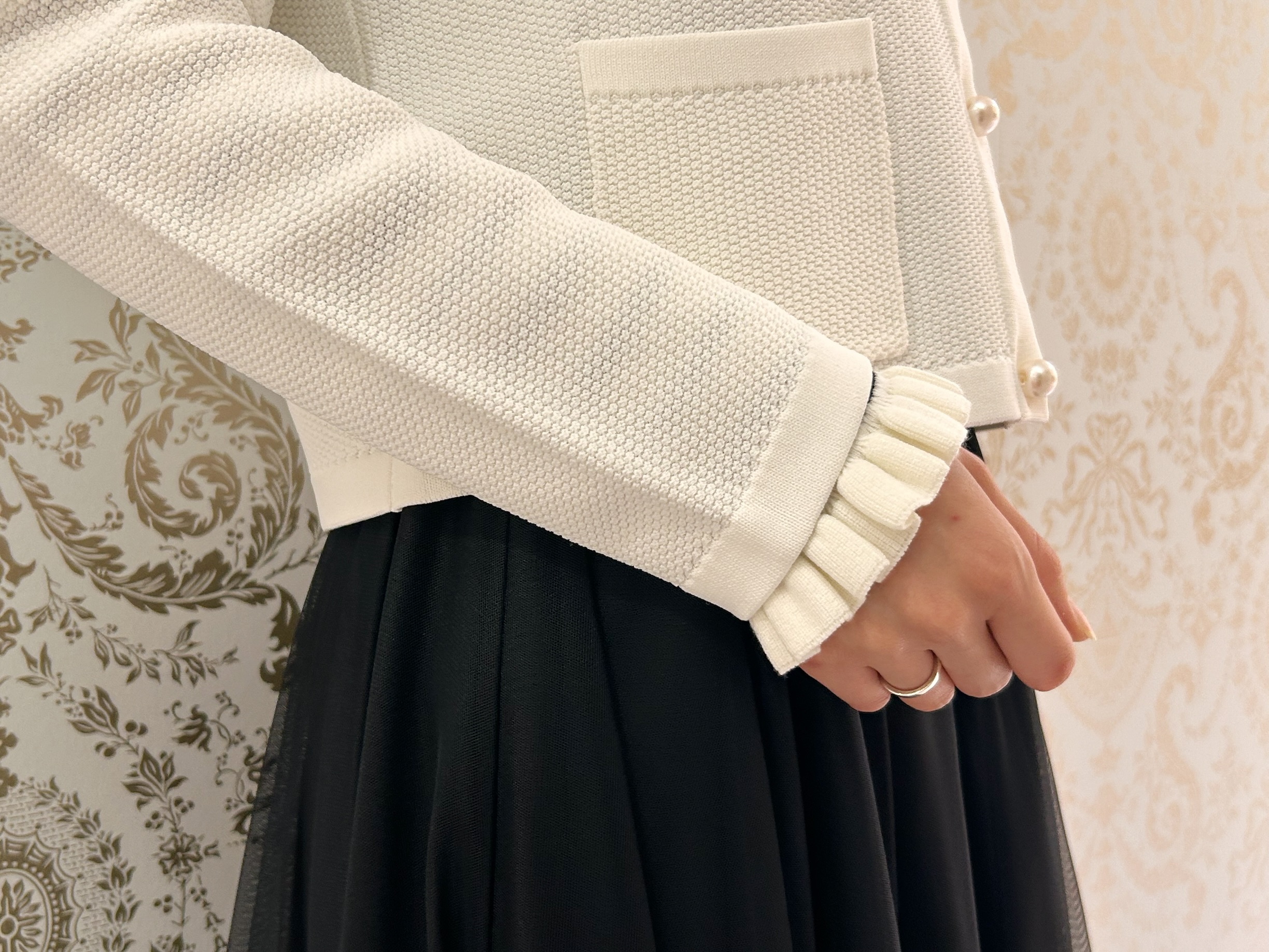 さりげないディテールが、装いに軽やかな華やぎを添えます。