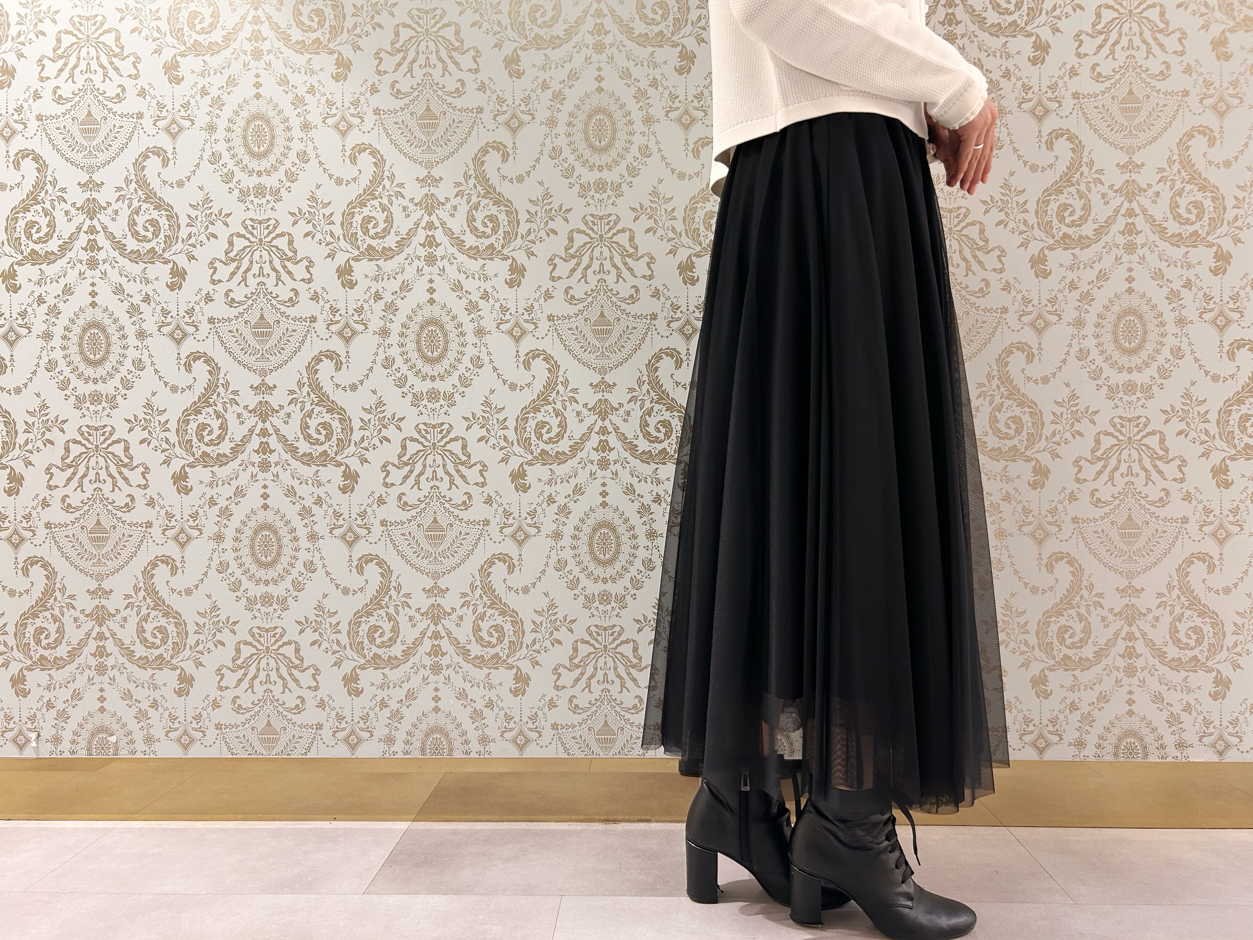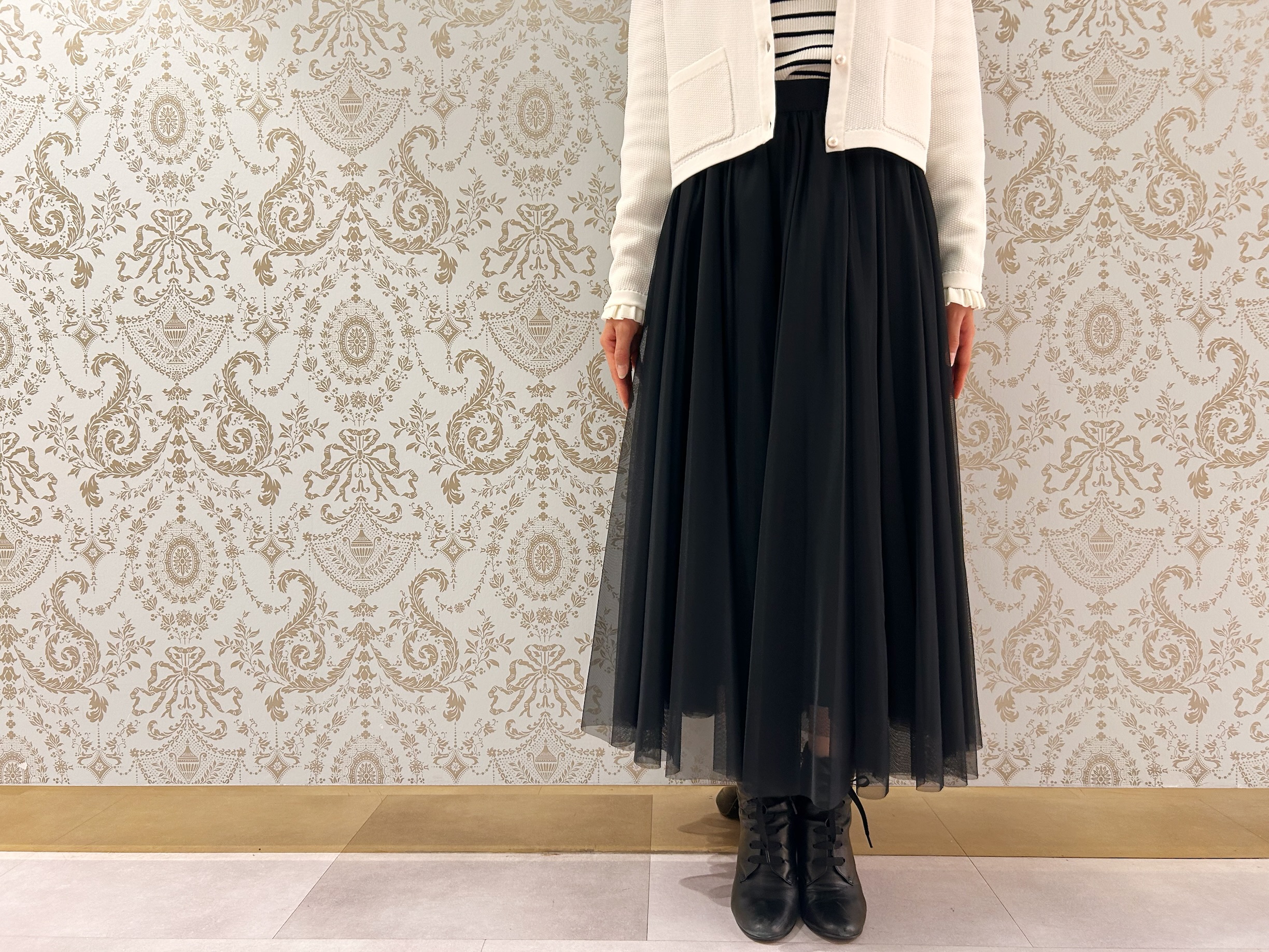 ボトムスには、チュールを二枚重ねたブラックスカートを合わせて。