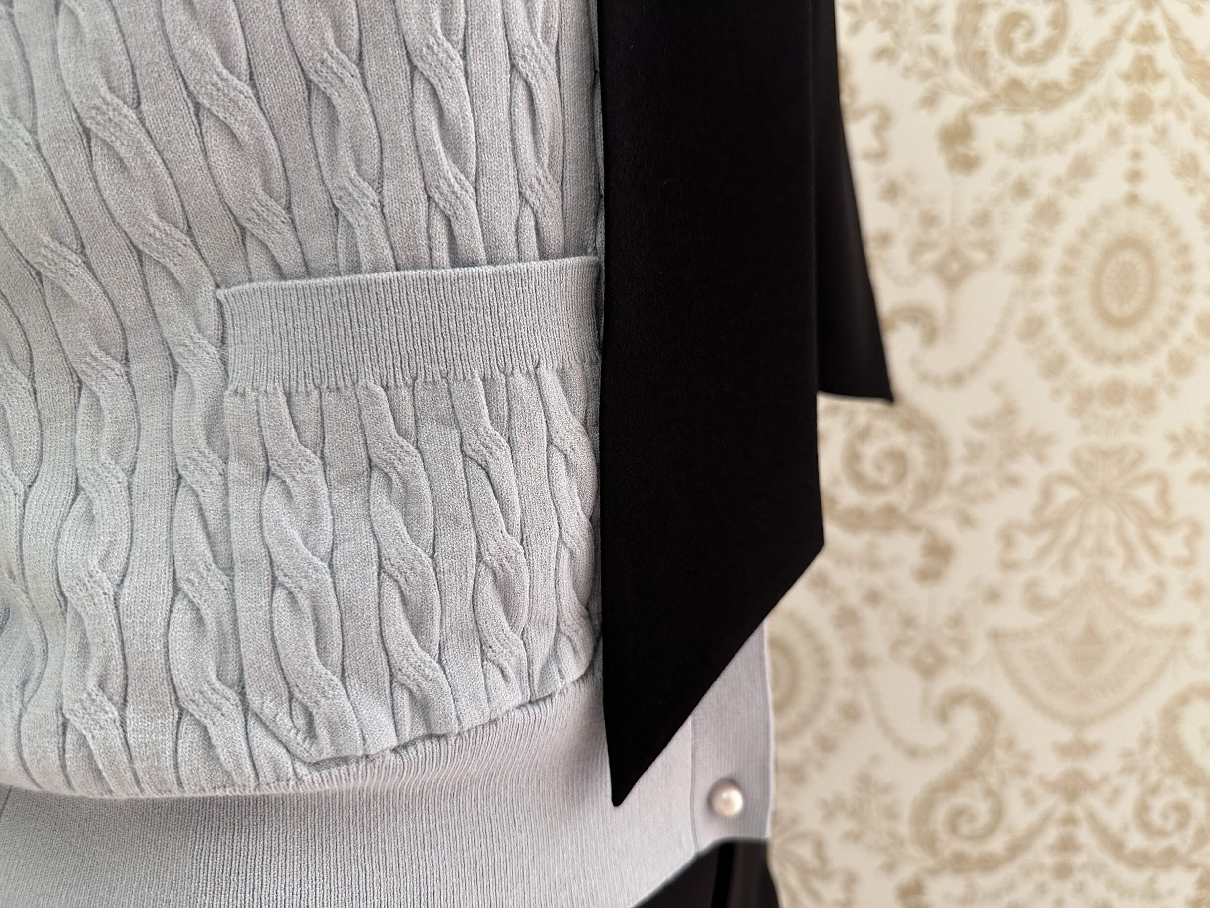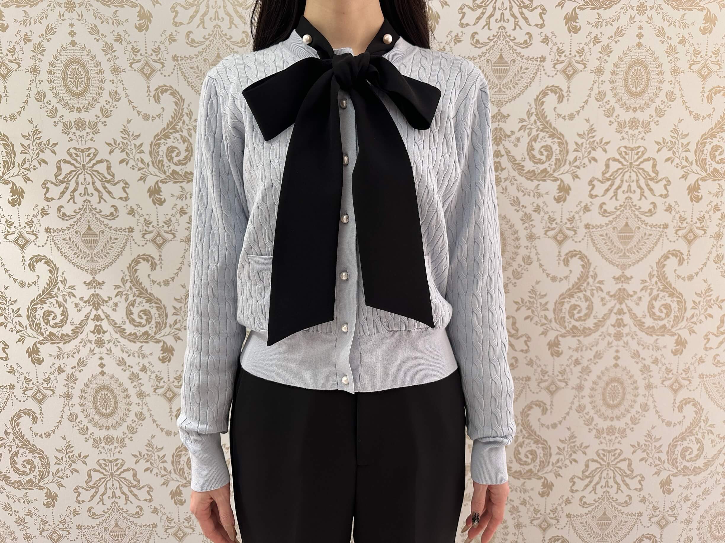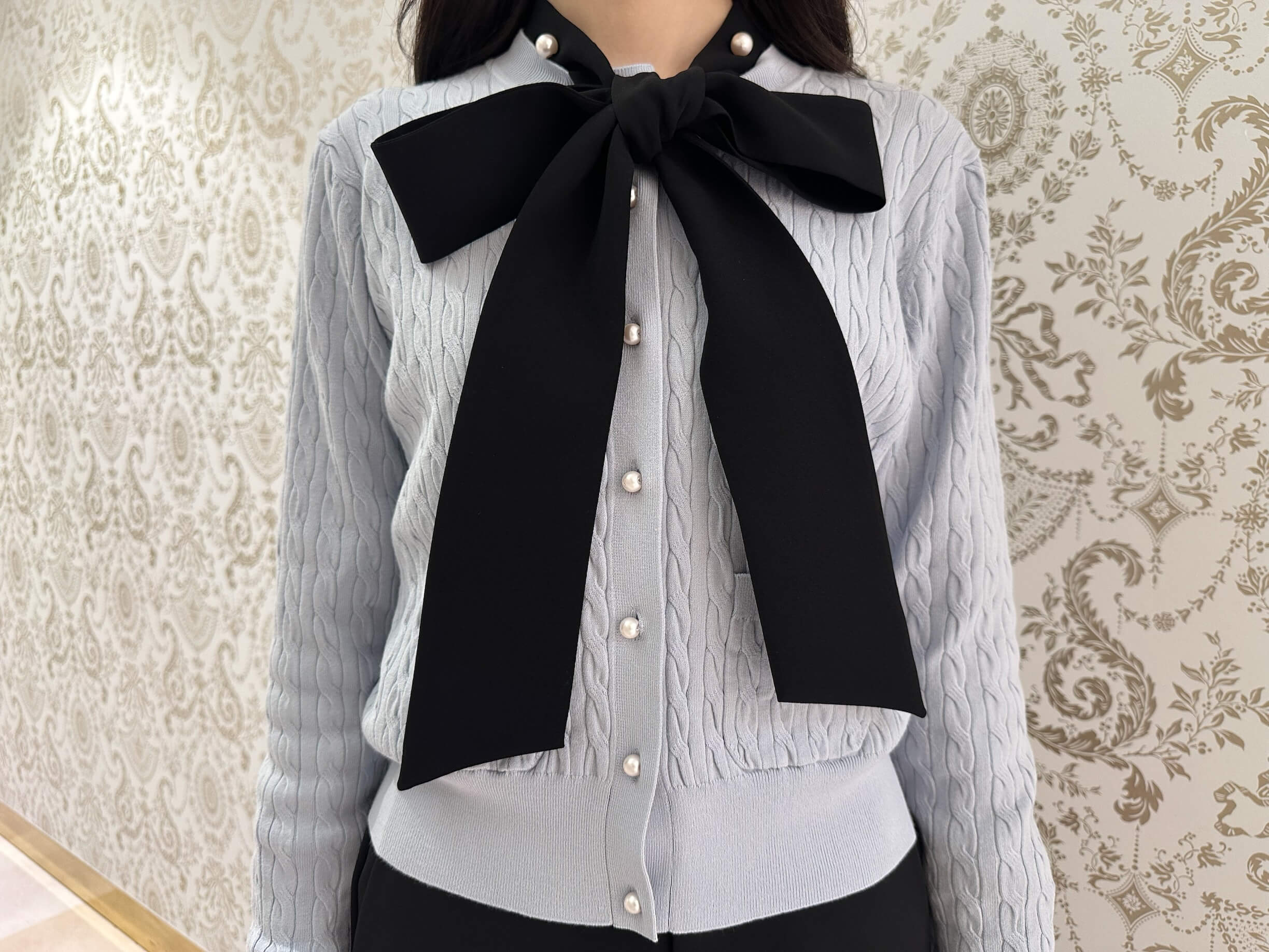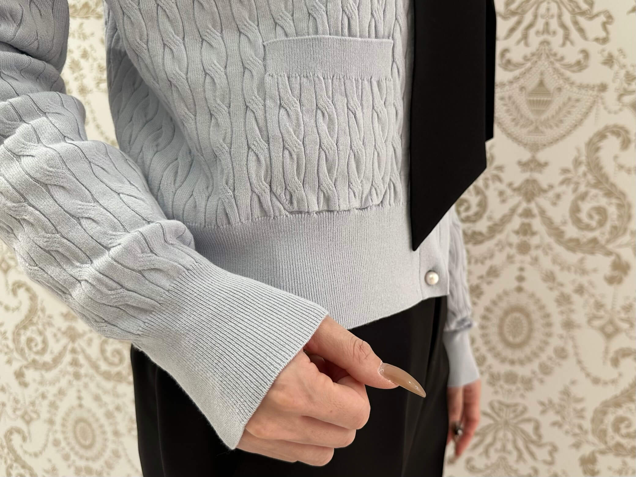 淡いブルーがスタイリングの華になること間違いなしのパールボタンケーブルニットカーディガン。