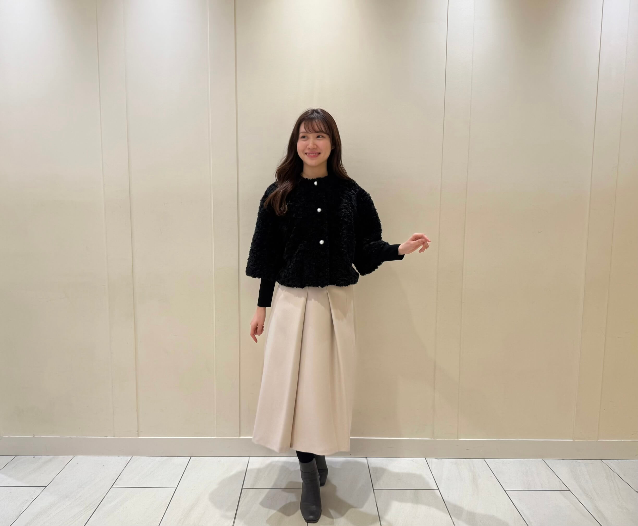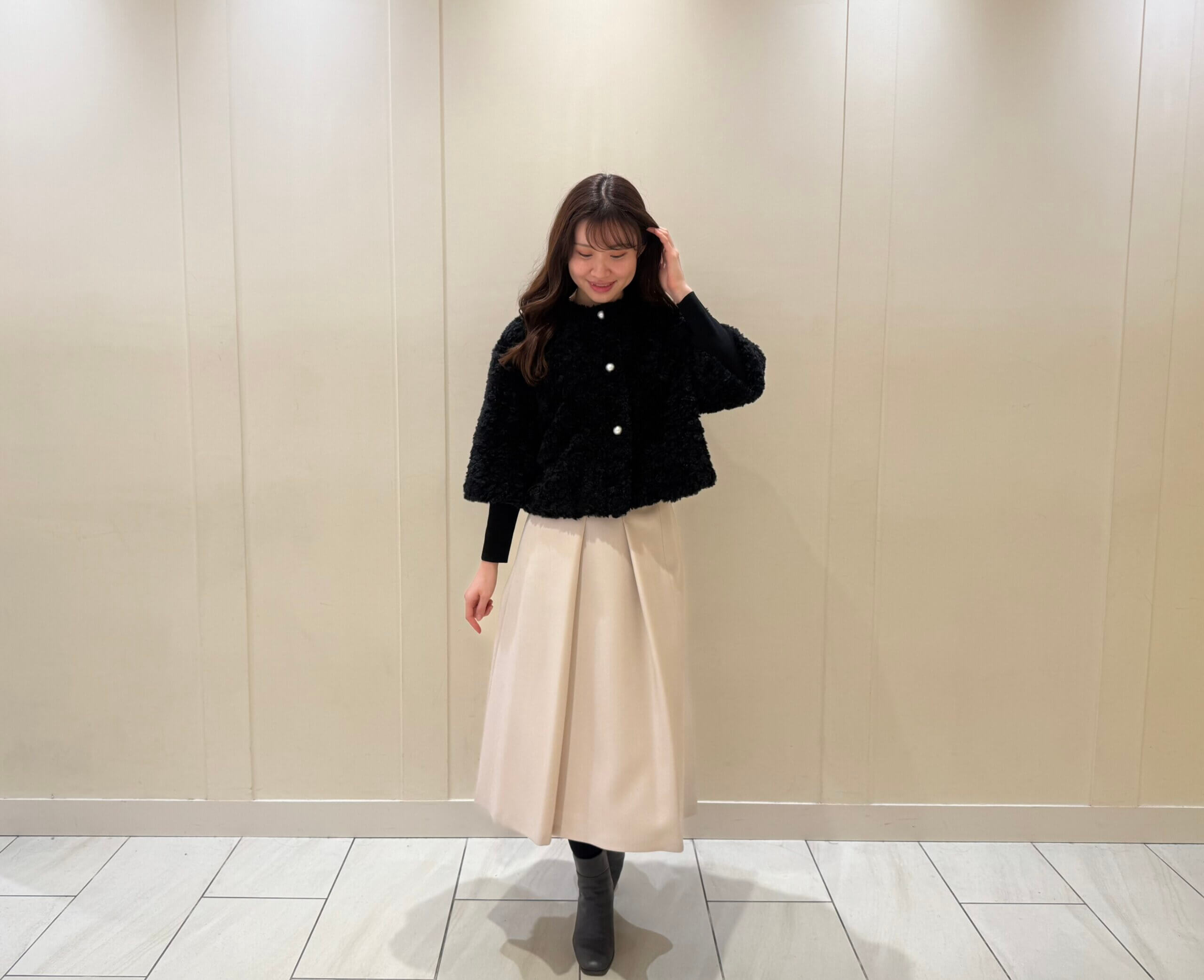 柔らかなベージュのスカート×黒のボアジャケットを合わせた、上品なコントラストが大人可愛い、軽やかなコーディネート。