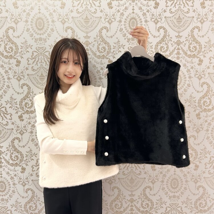 合わせたインナーは、ラメを織り込んだフェザーニット。ふわふわとした質感と、ほのかなラメの煌めきが、秋のムードにぴったり。ボリュームのあるパフスリーブがフェミニンなアクセントとなり、一枚で華やかさを演出してくれます。