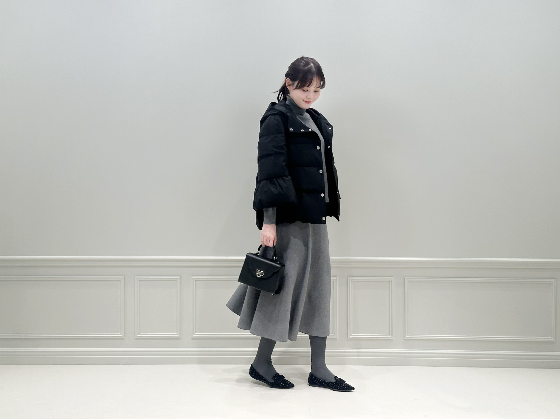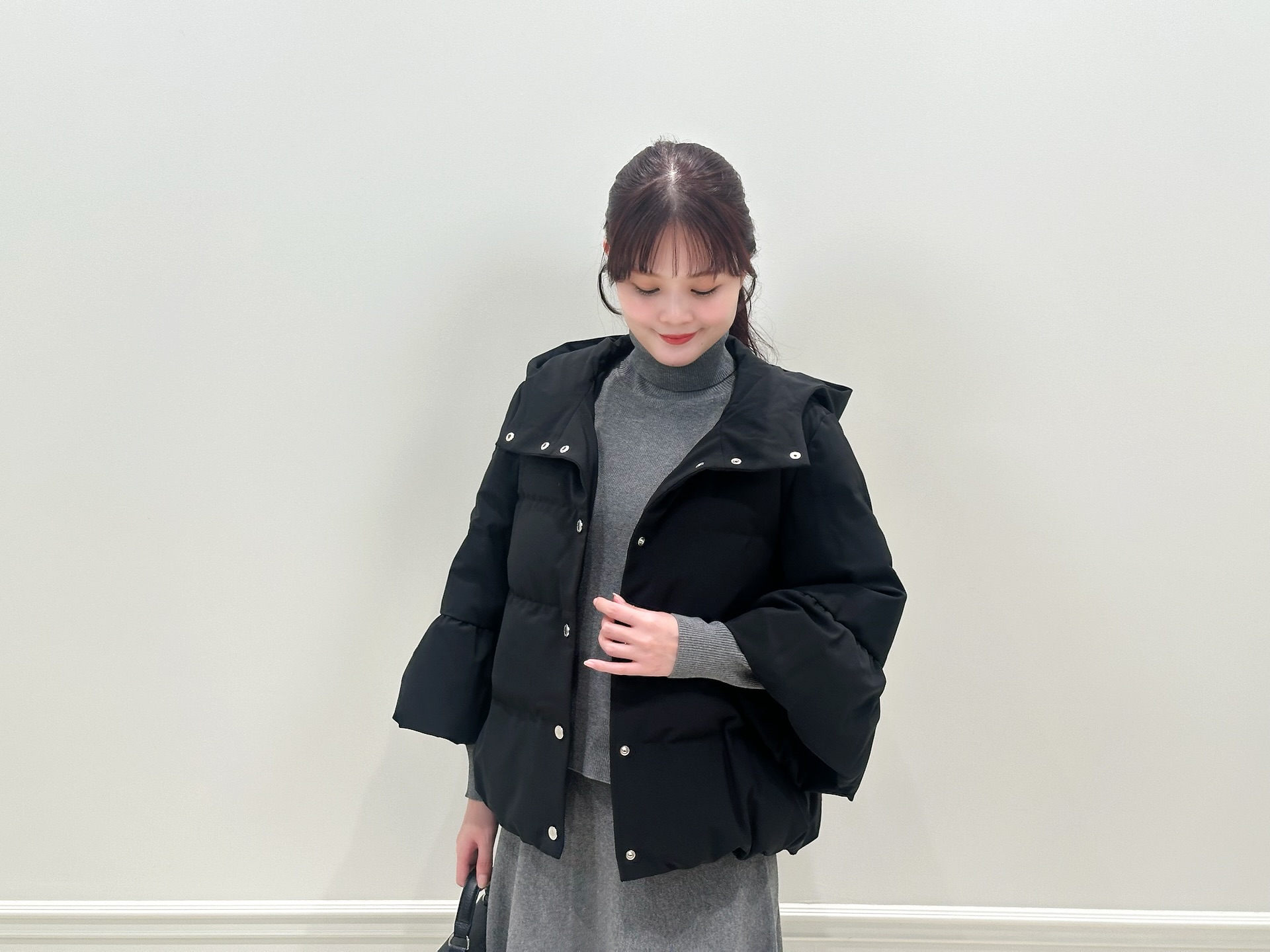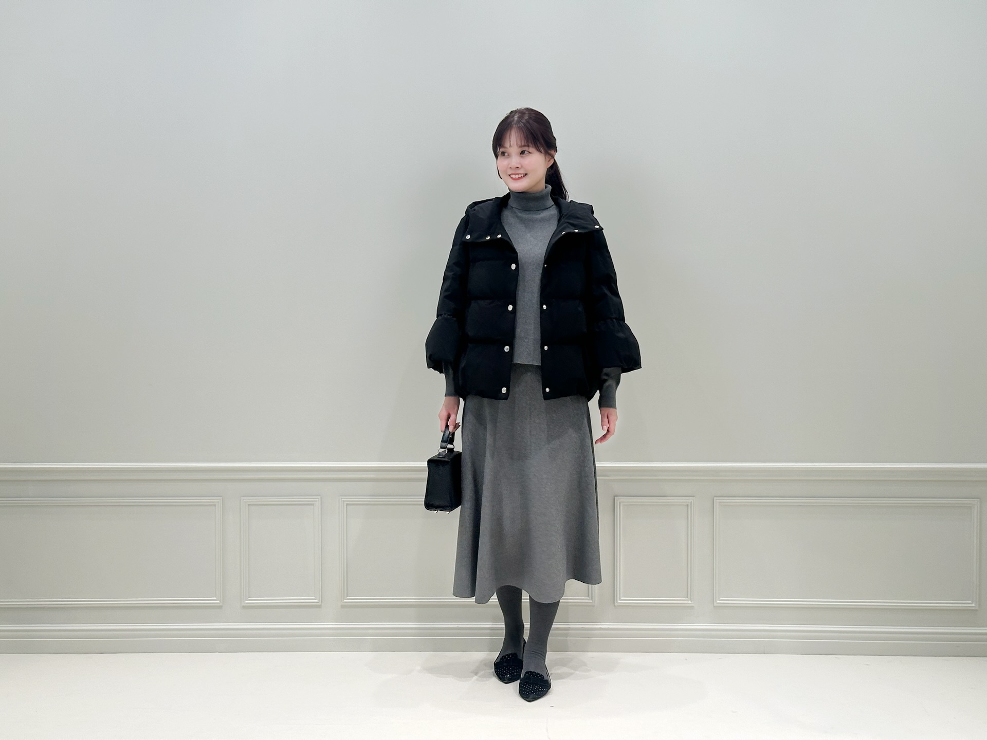 今回合わせたのは、柔らかなグレーのセットアップにブラックのショートダウンを羽織ったスタイリング。シンプルな色使いながら、素材感とシルエットのコントラストが際立ち、落ち着いた中にも女性らしい華やぎを感じさせてくれます。