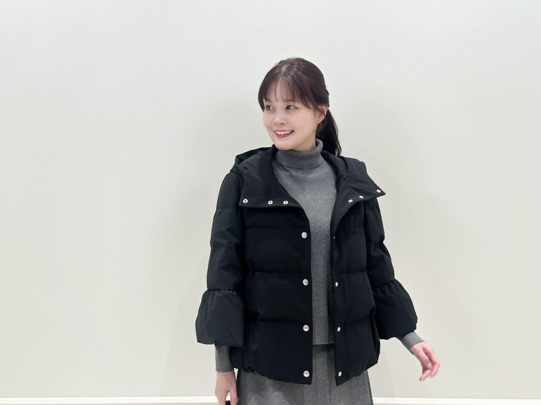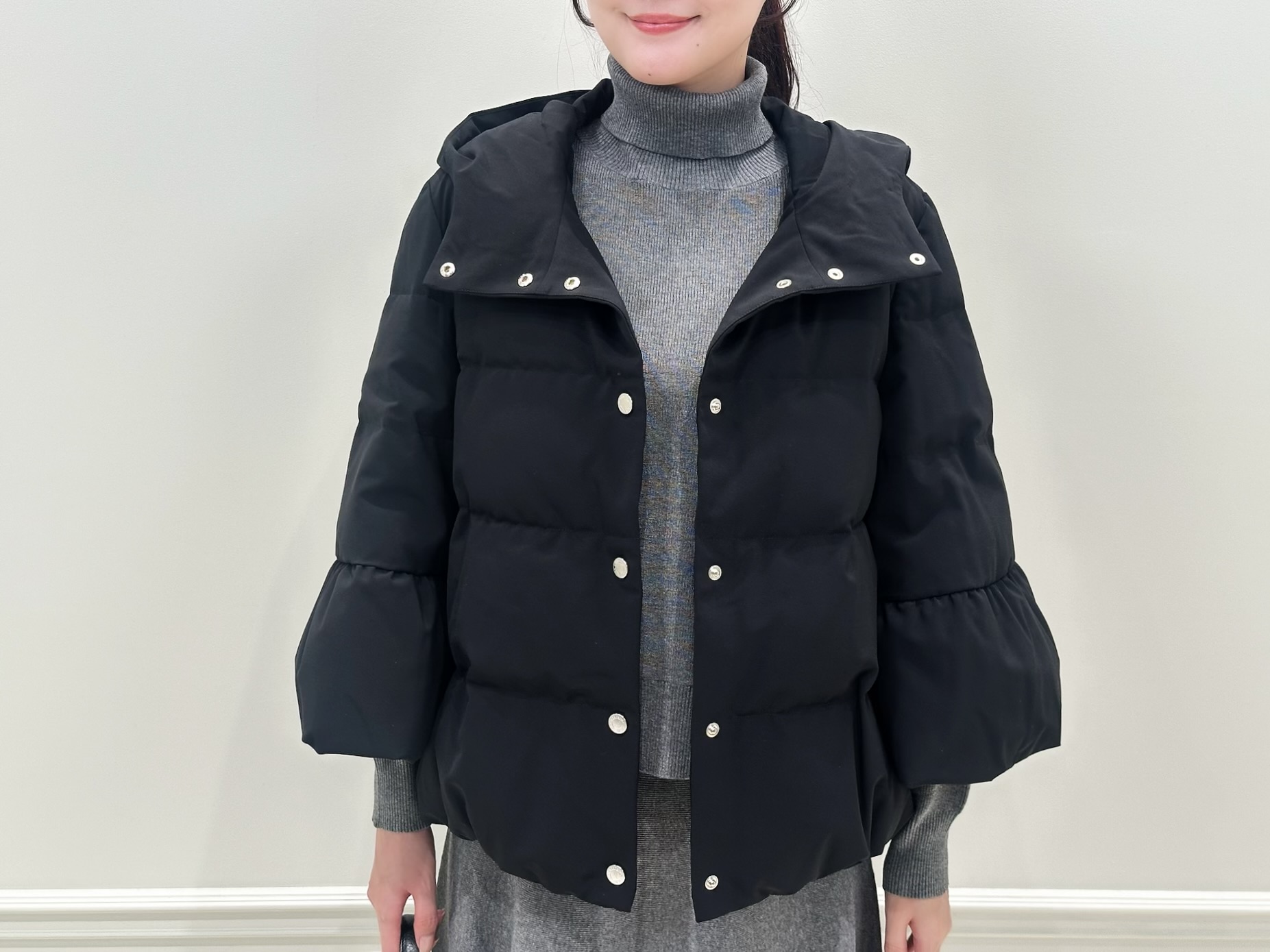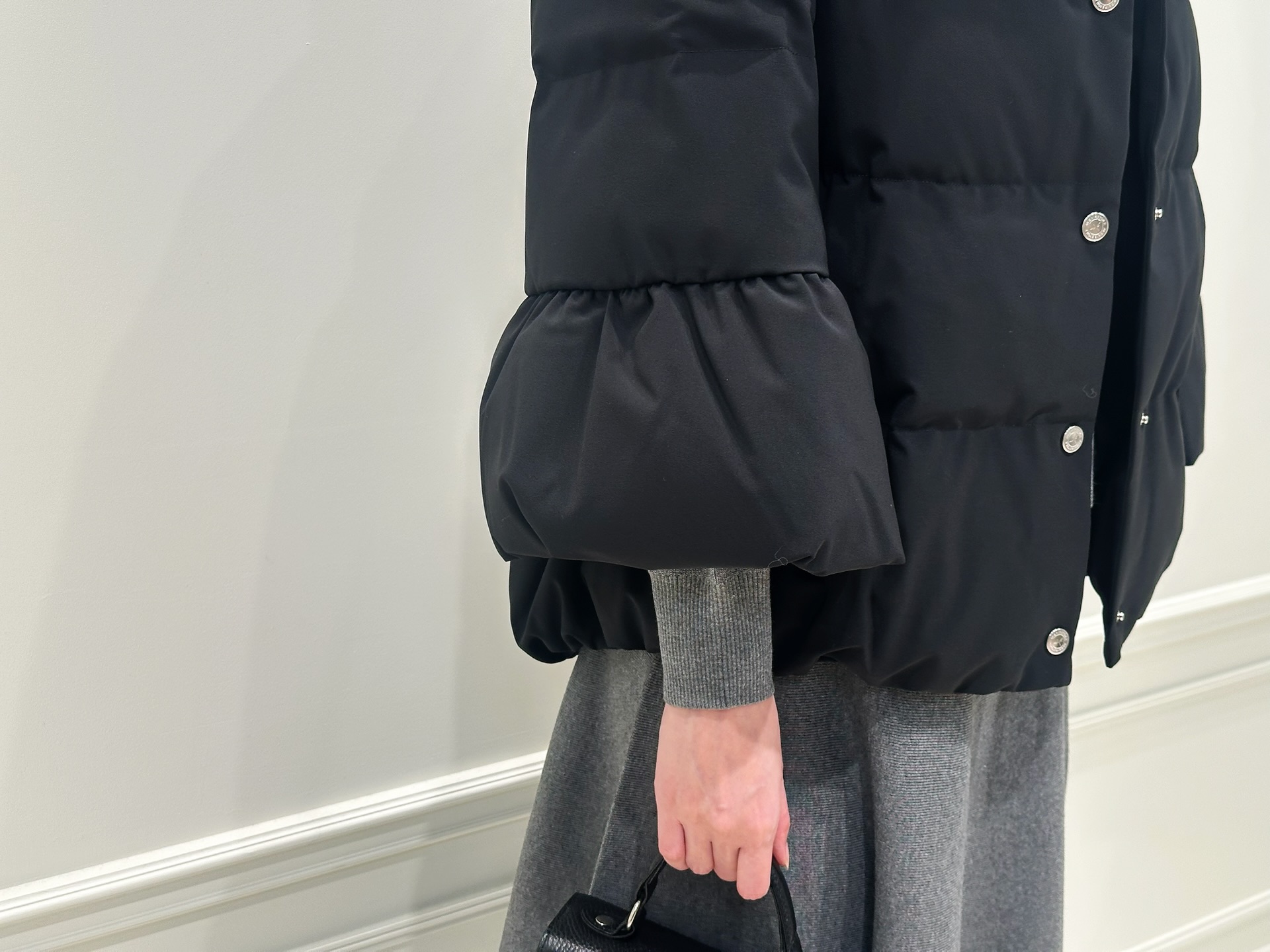 主役となるフレアスリーブショートダウンコートは、切替を入れたフレアシルエットのスリーブが印象的な一枚。ショート丈ならではの軽やかさと、立体的な袖デザインが相まって、ダウンでありながらエレガントな佇まいを叶えてくれます!