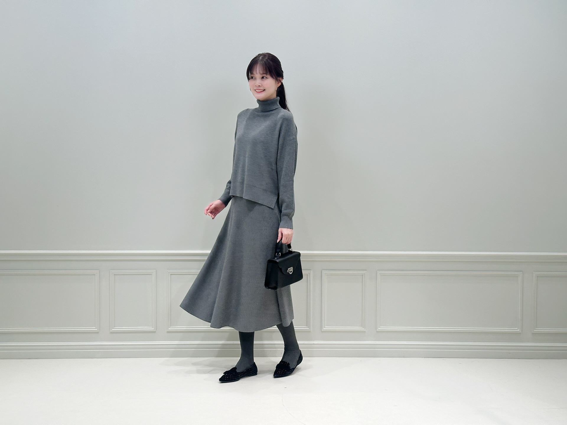 インナーには、裾スリットタートルネックニットとスムースニットフレアスカートをセットアップで着用。ゆとりのあるニットトップスは、裾のスリットと前後差のあるデザインによって、自然な動きと立体感を演出します!