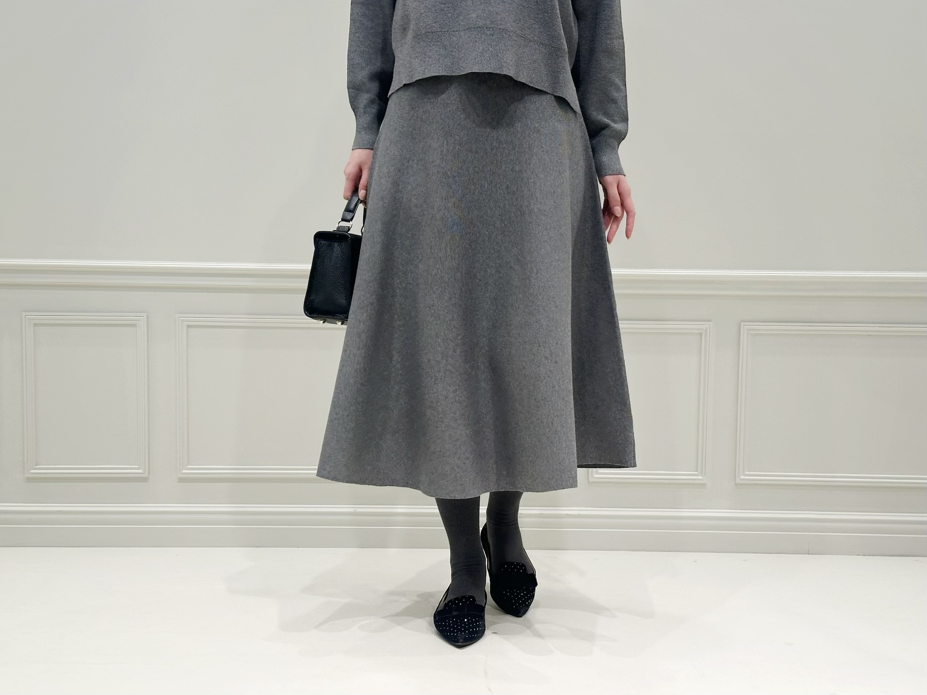 スカートは程良い厚みと美しいフレアラインが魅力で、歩くたびに上品な揺れ感をプラス。どちらもレーヨンメインの素材を使用しているため、秋口から春先まで長く活躍し、着心地の良さも兼ね備えています。